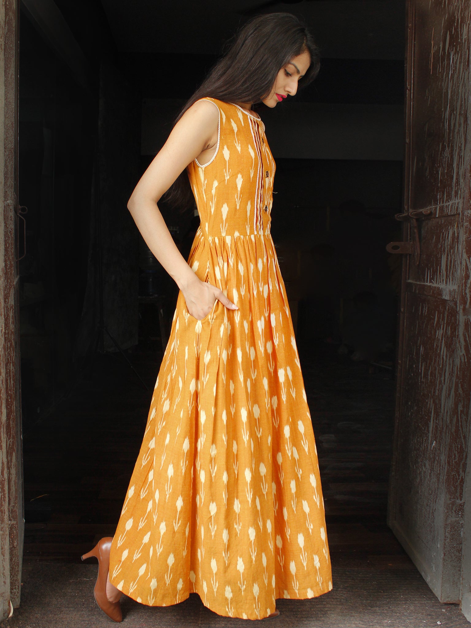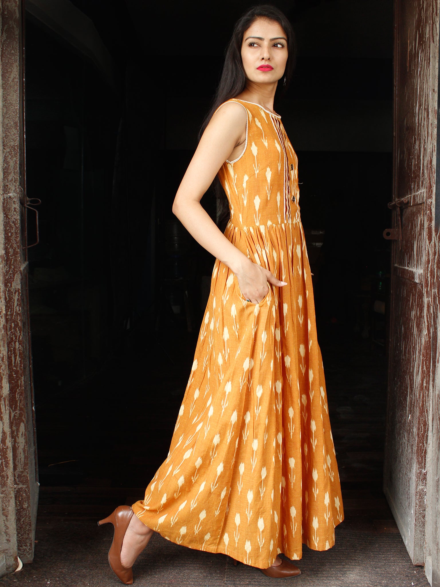 Mustard Ivory Long Handwoven Double Ikat Dress With Side Pockets - D28F1569