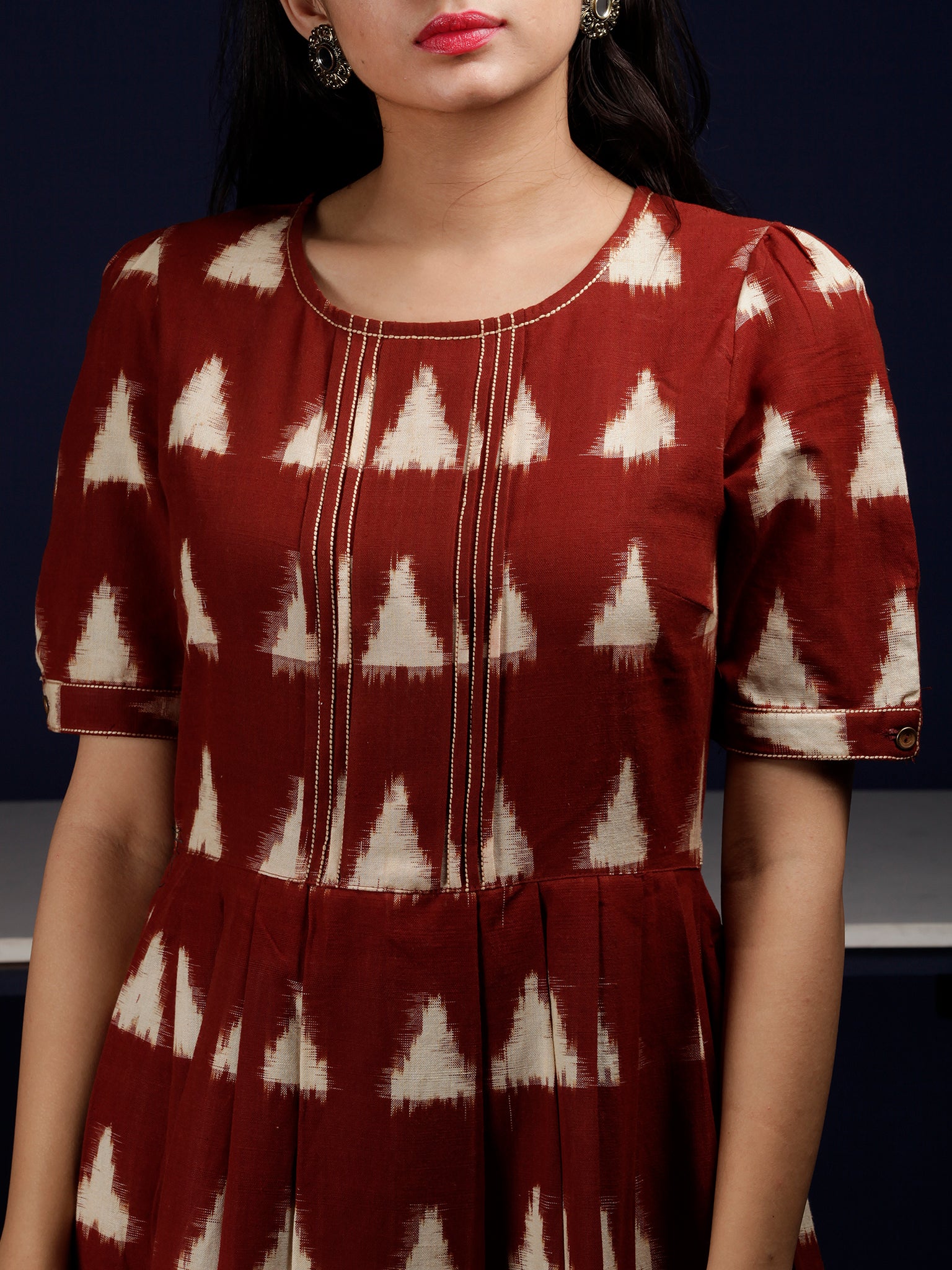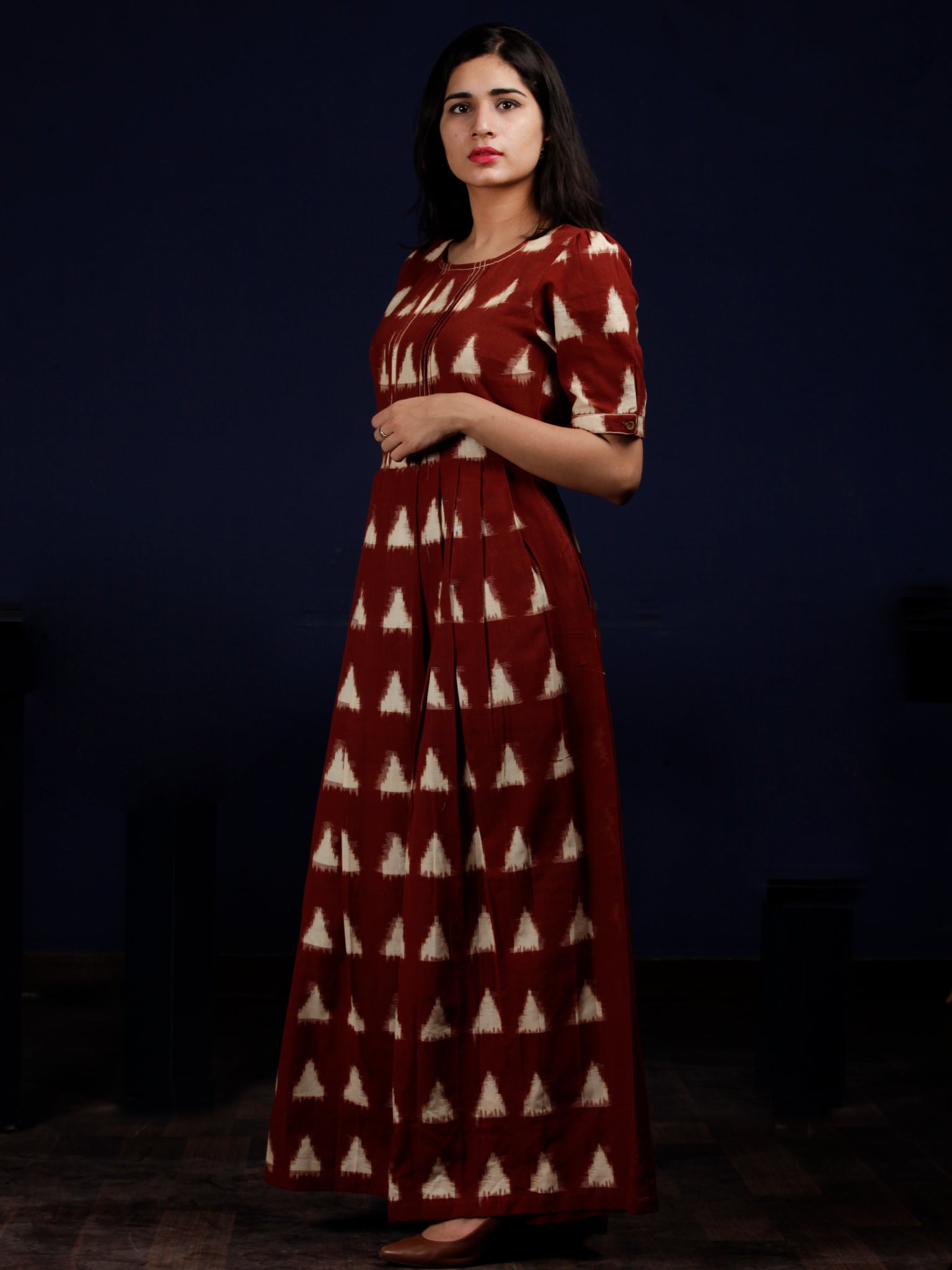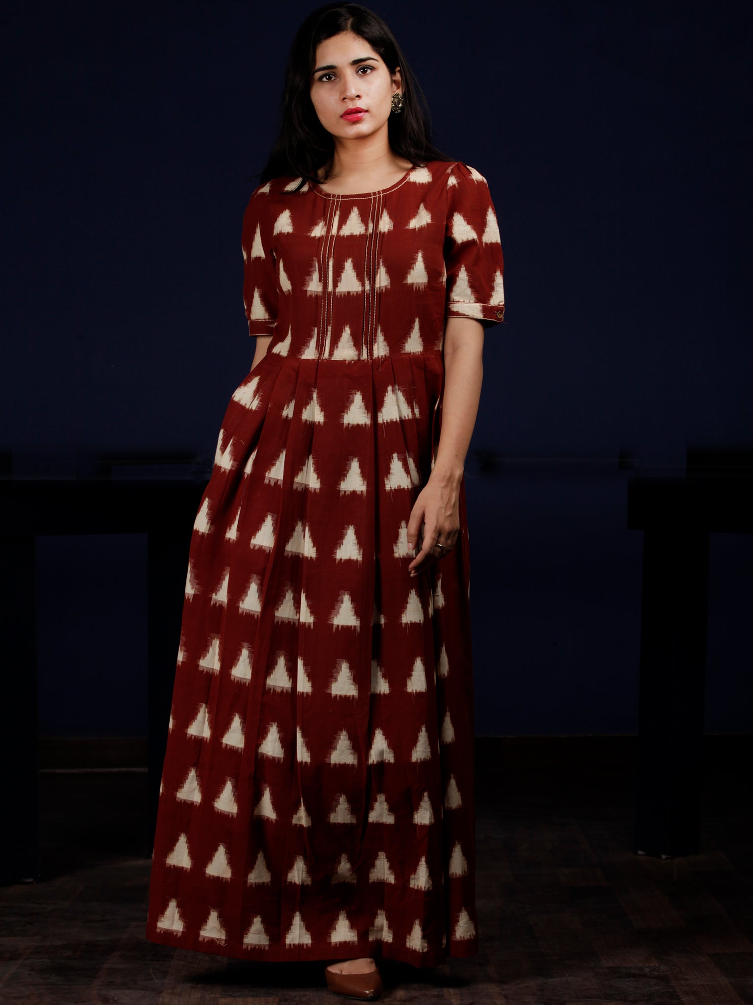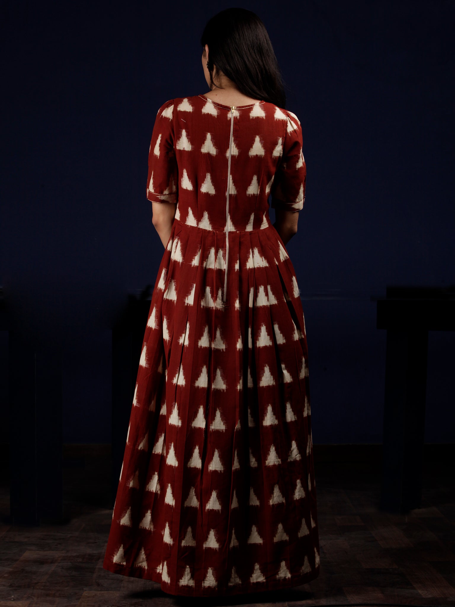 Reddish Brown Ivory Long Ikat Knife Pleated Dress With Side Pockets - D312F1564
