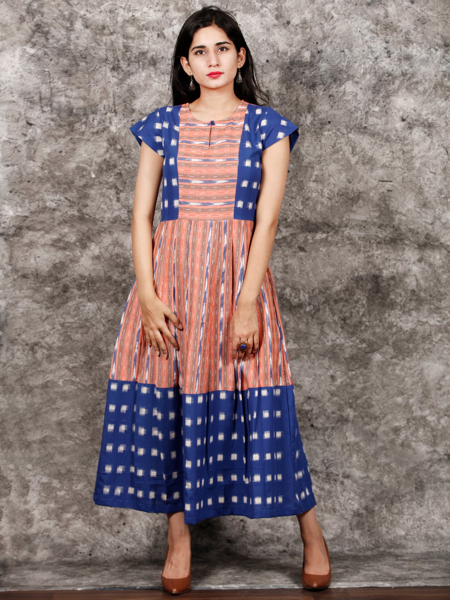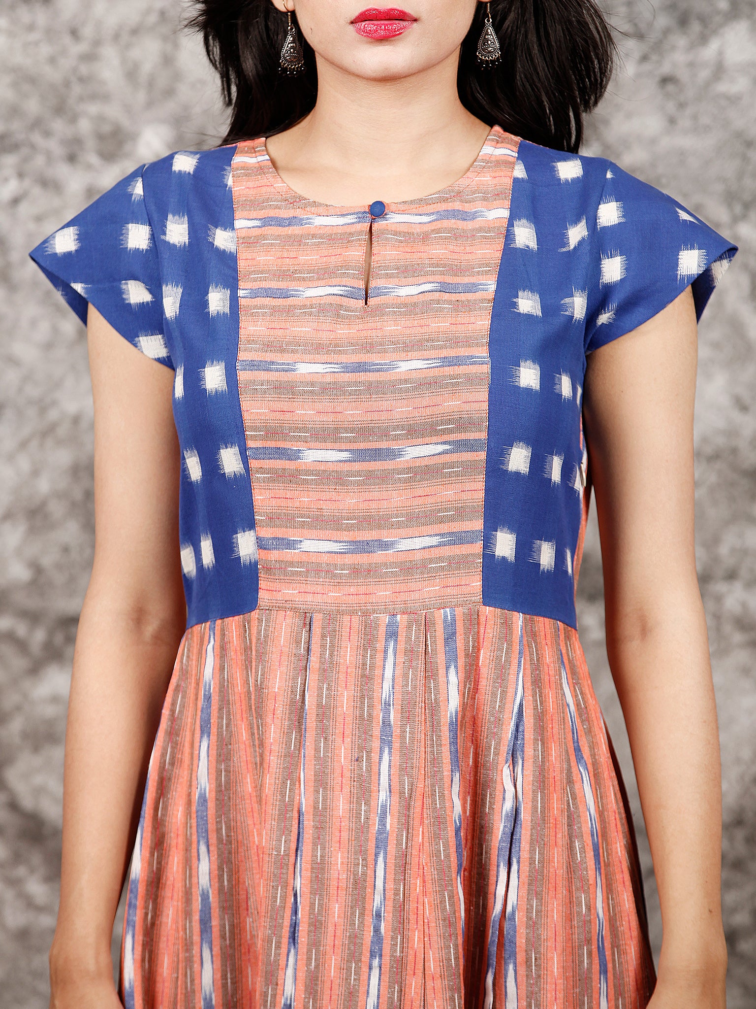 Royal Blue Orange White Handwoven Ikat Dress With Princess Cut & Knife Pleates- D310F1055