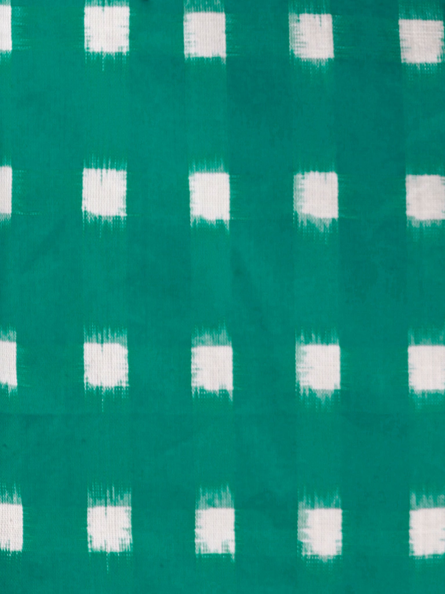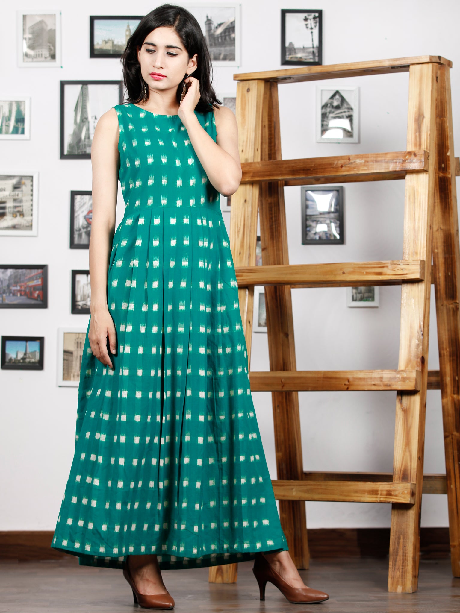 Teal Green White Long Sleeveless Handwoven Double Ikat Dress With Knife Pleats & Side Pockets - D32F1240