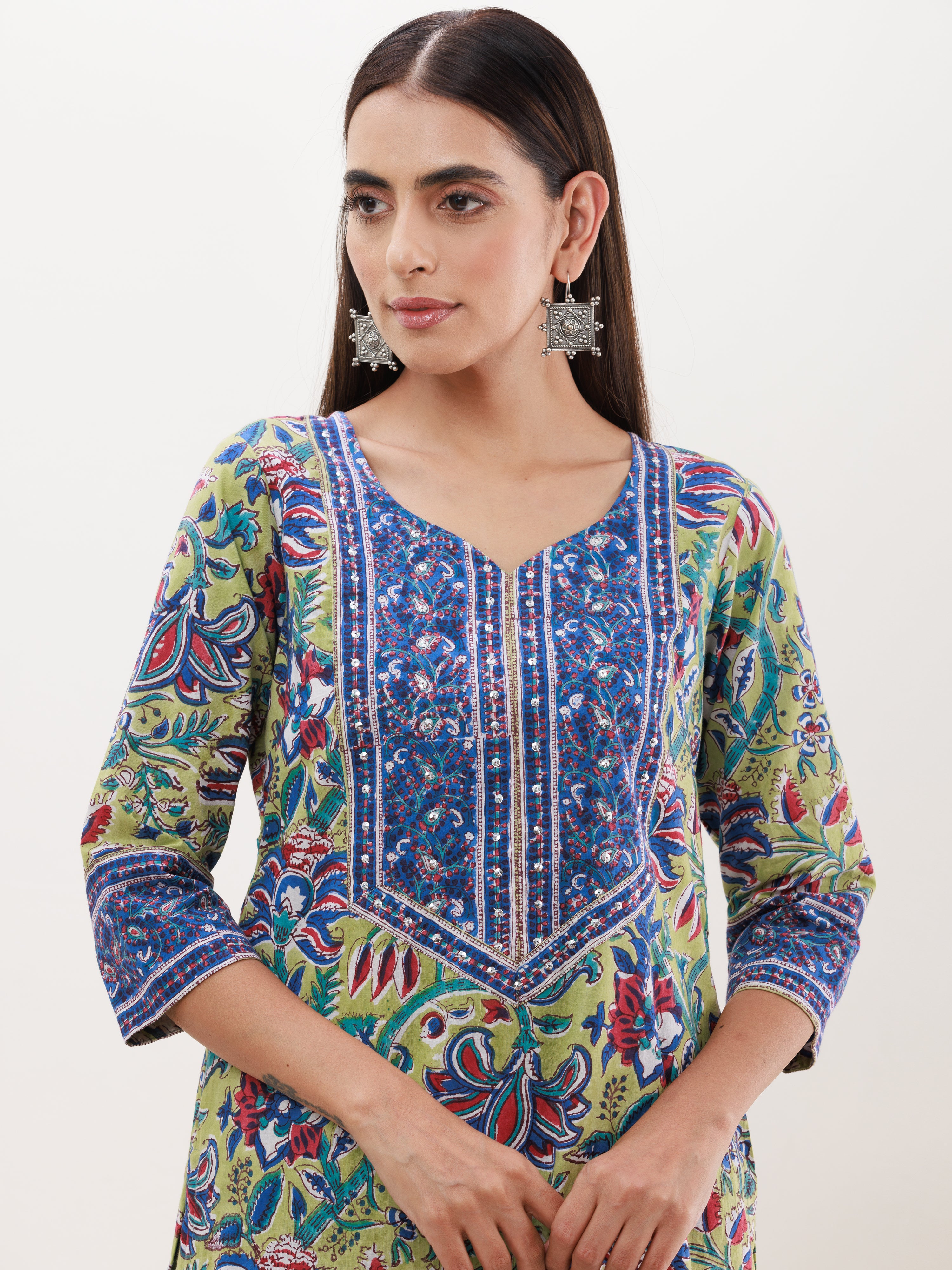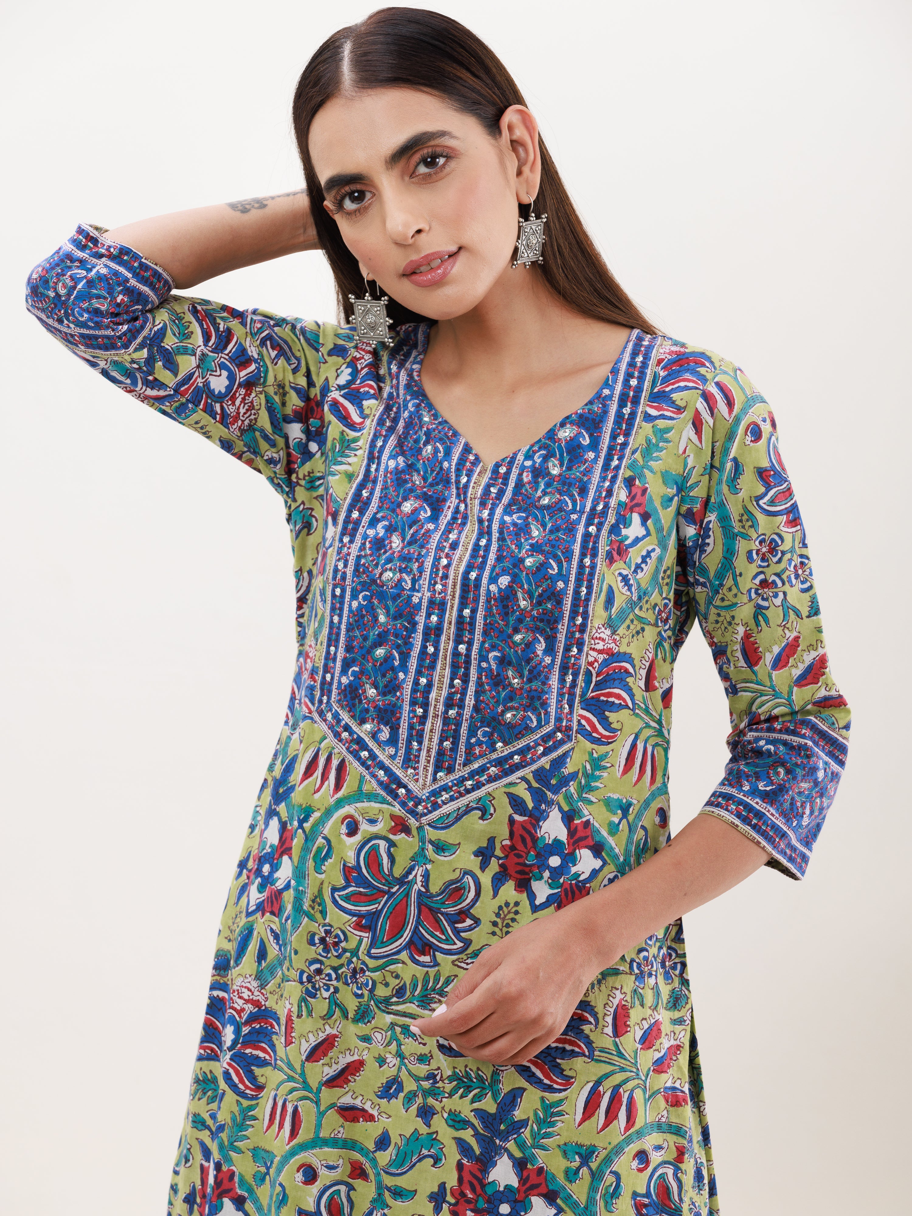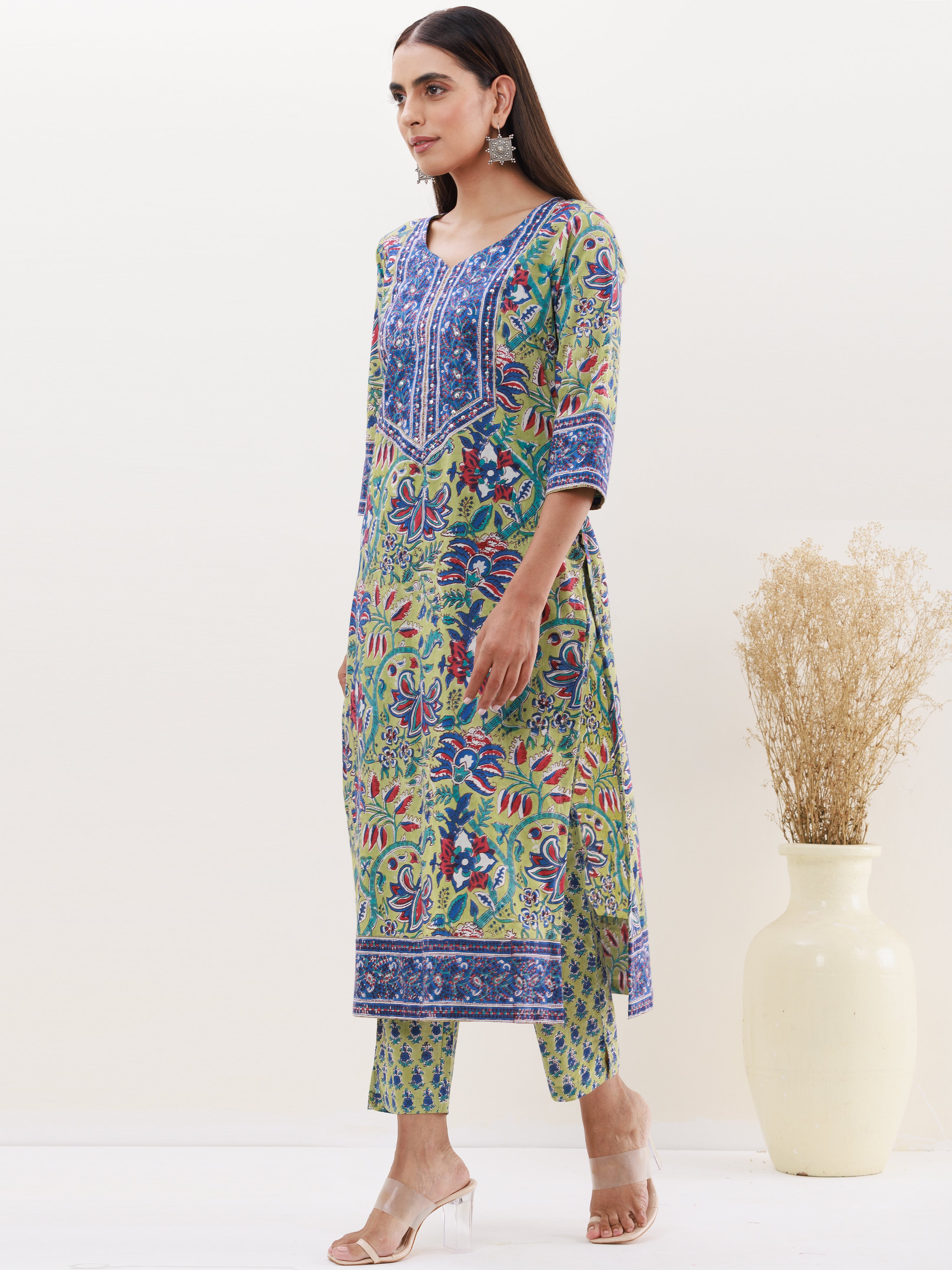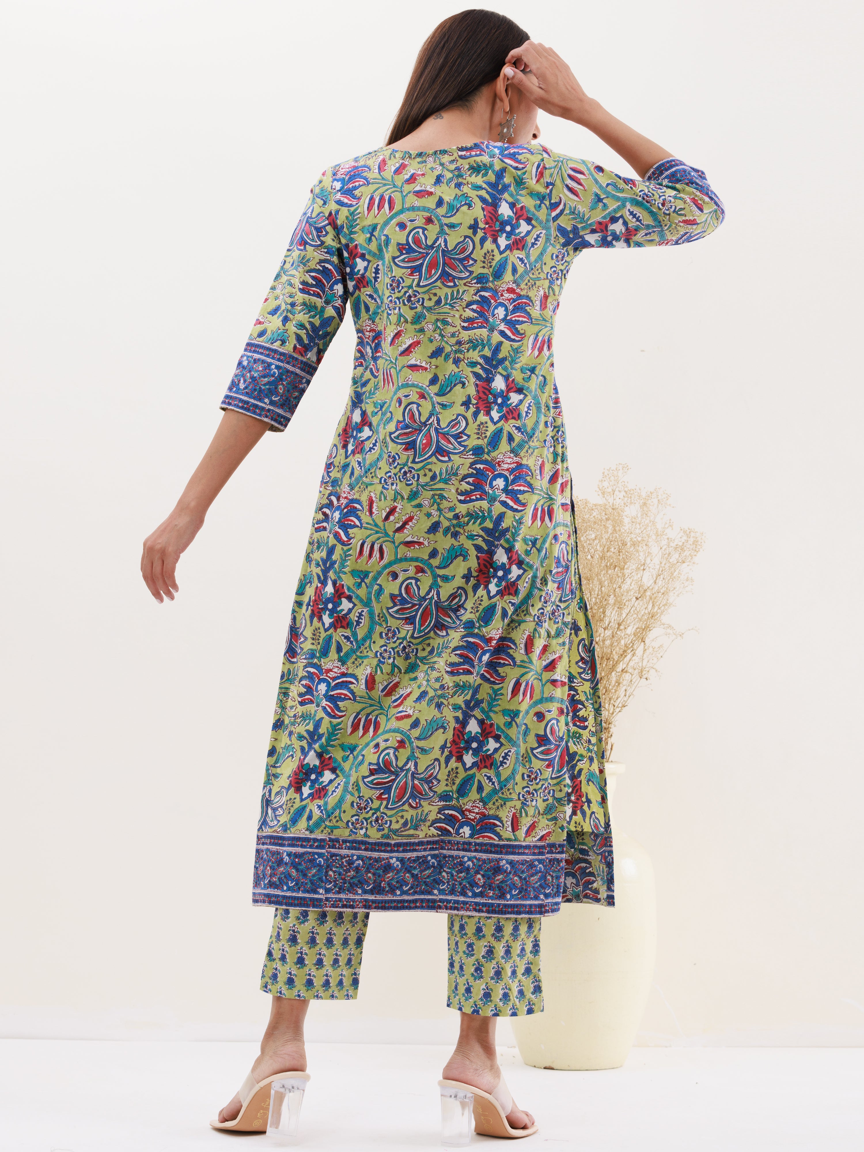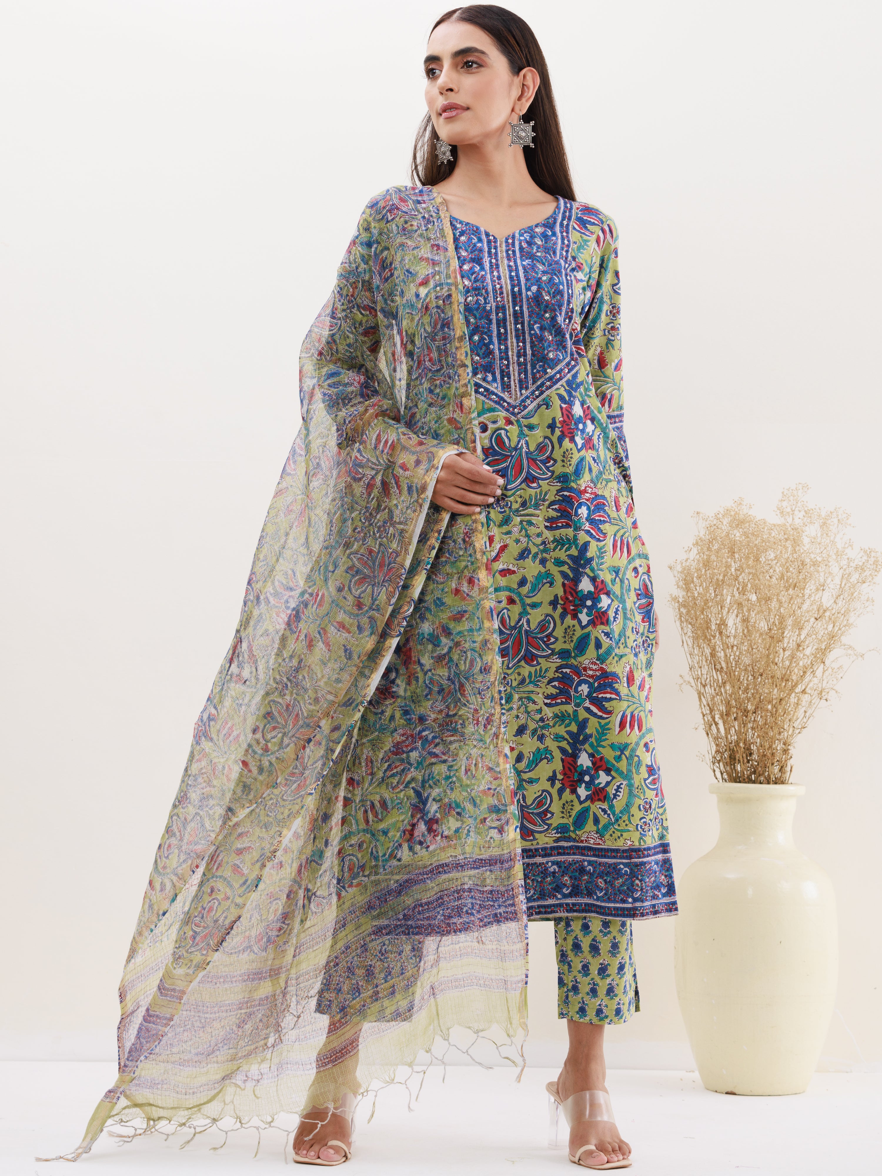 Product: This set contains Handcrafted Sanganeri Premium Cotton Kurta, 100% Cotton Pants and Kota Doria Dupatta.