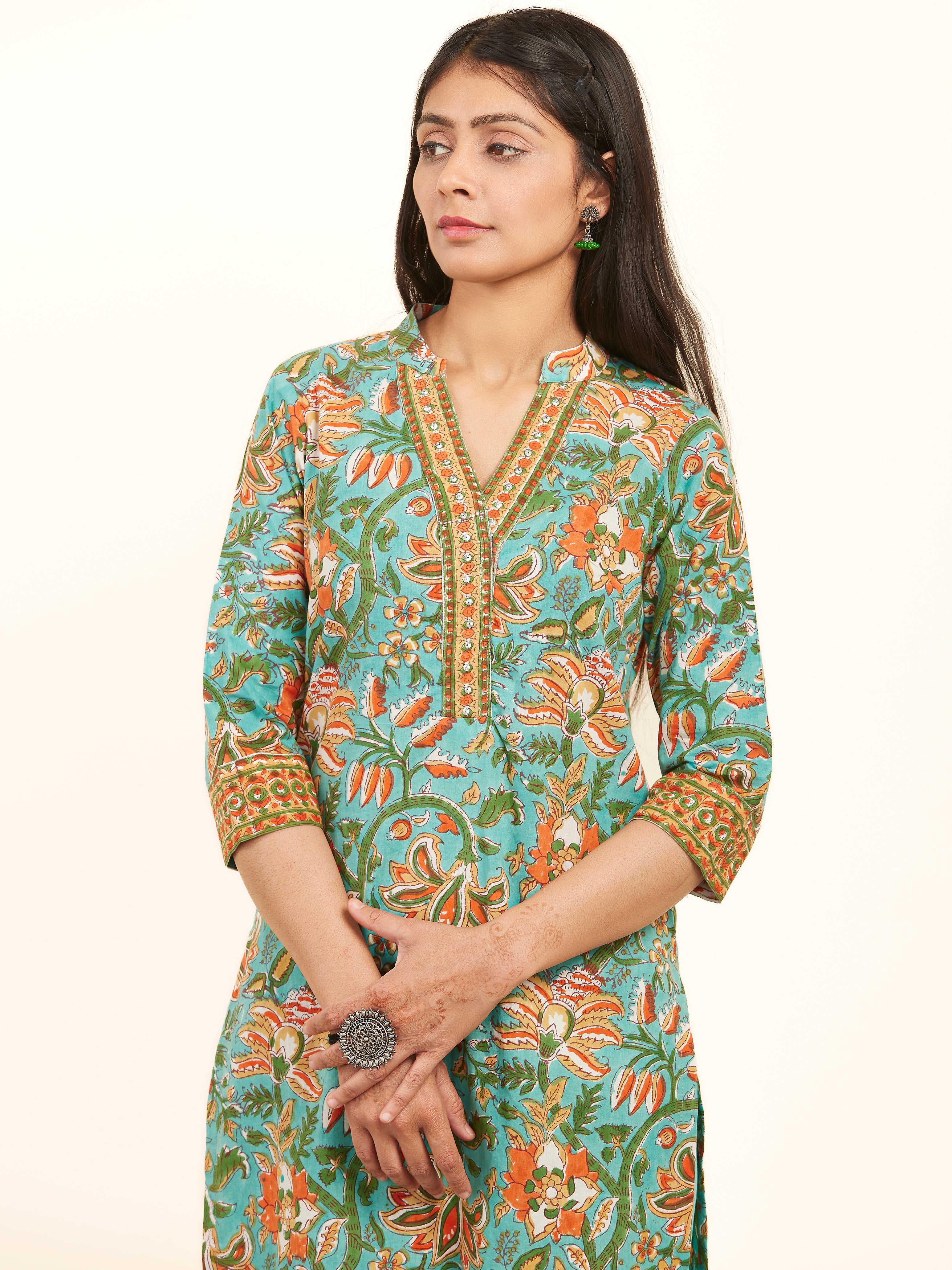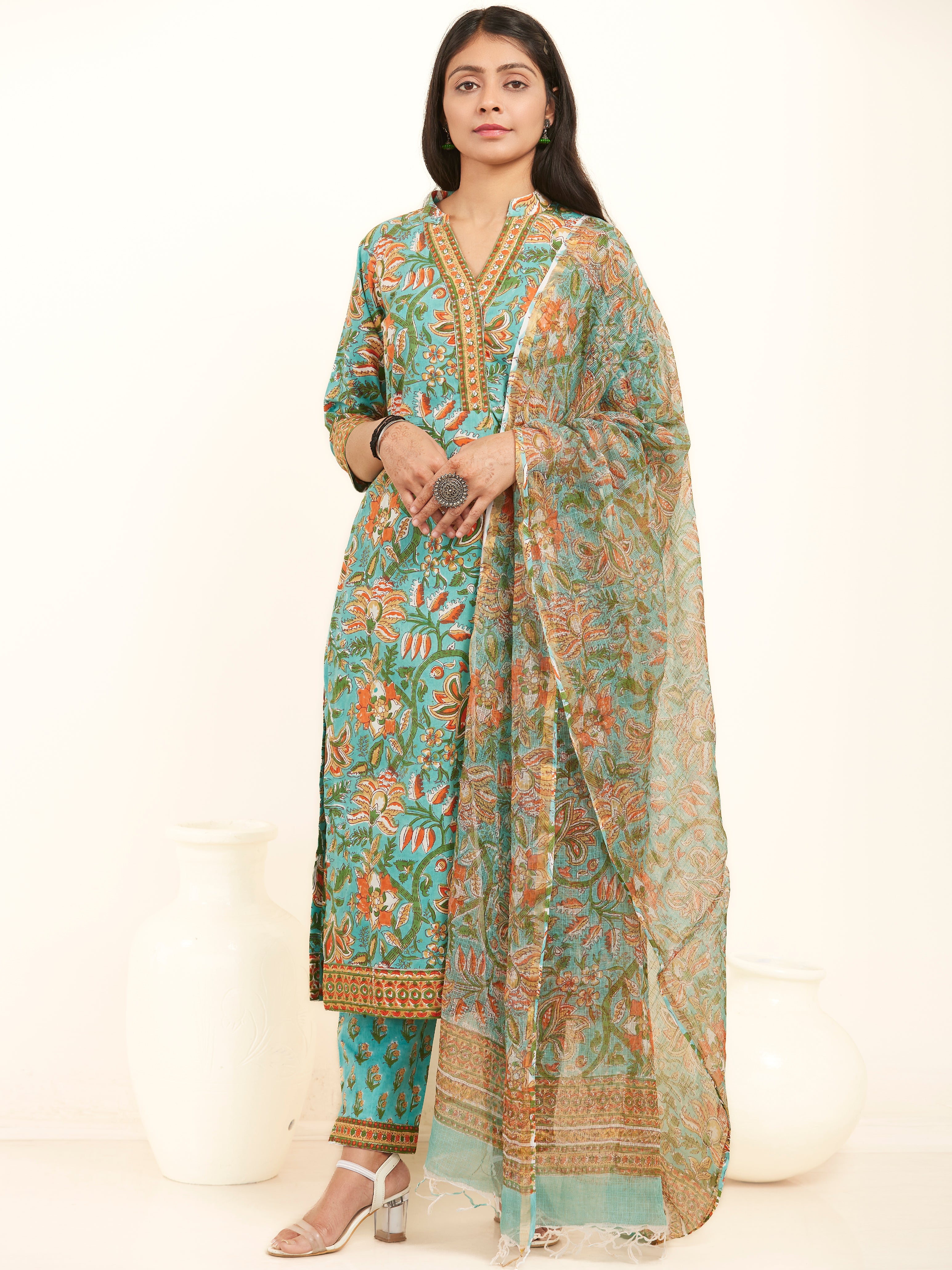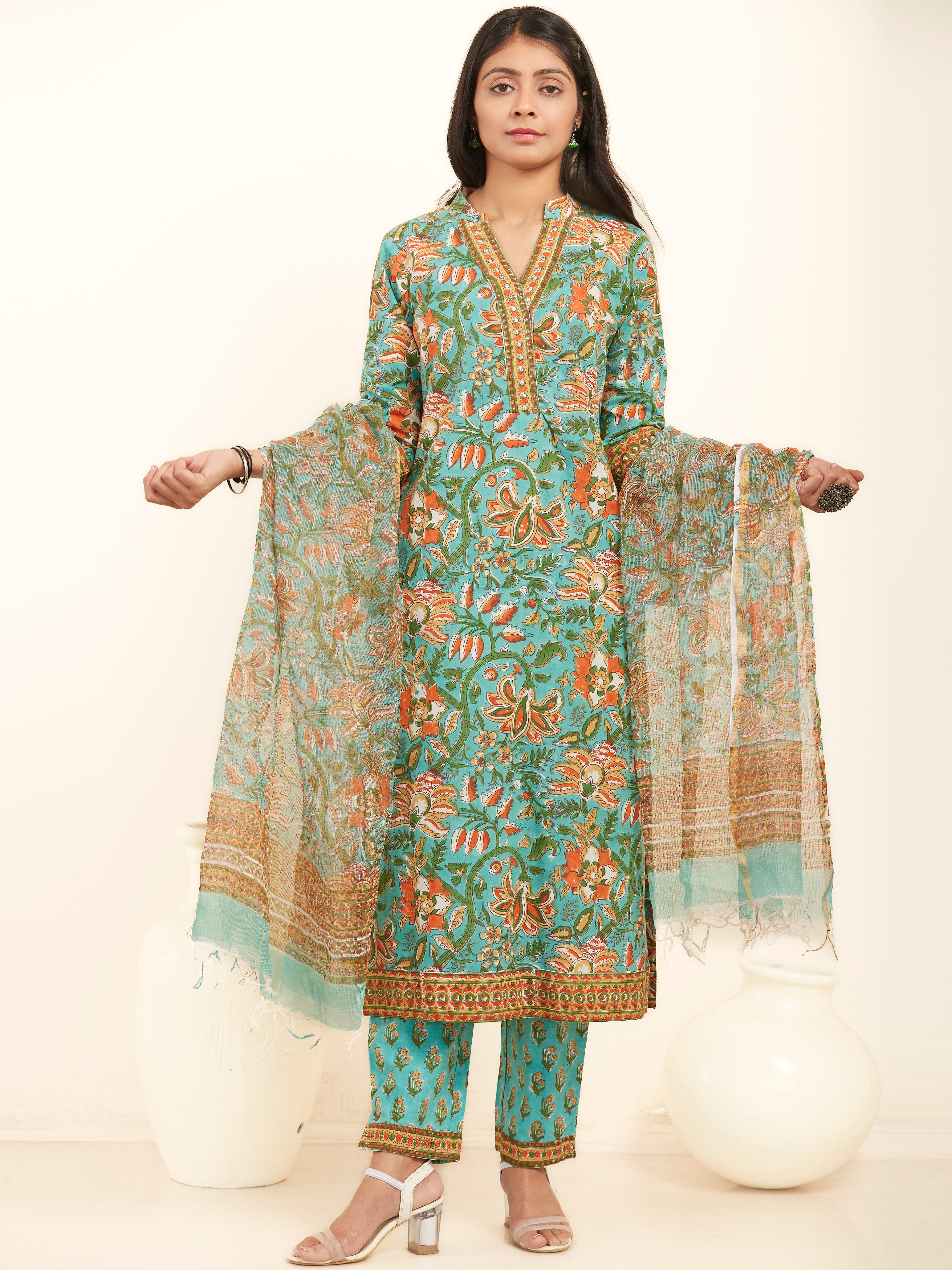 Product: This set contains Handcrafted Sanganeri Premium Cotton Kurta, 100% Cotton Pants and Kota Doria Dupatta.