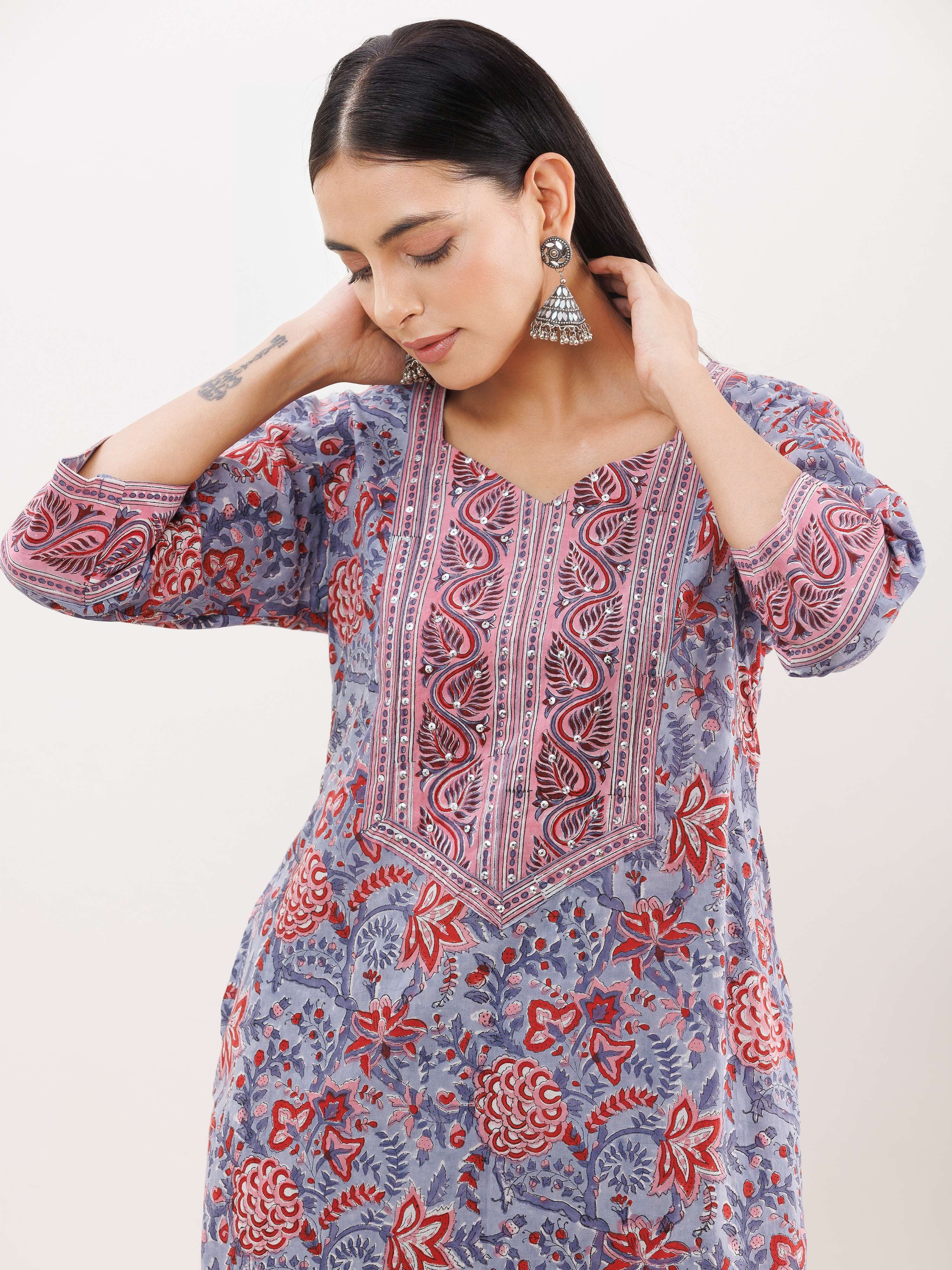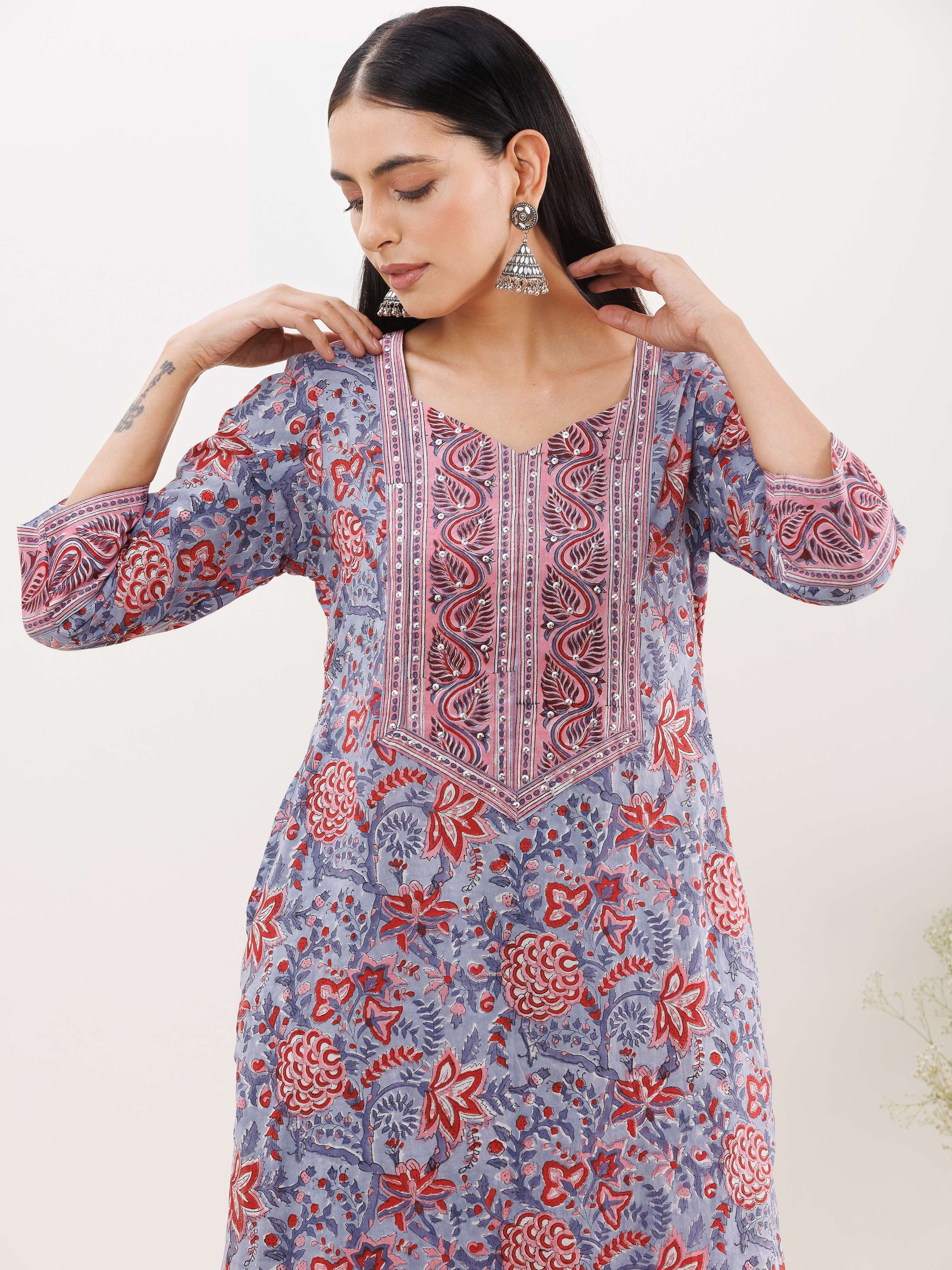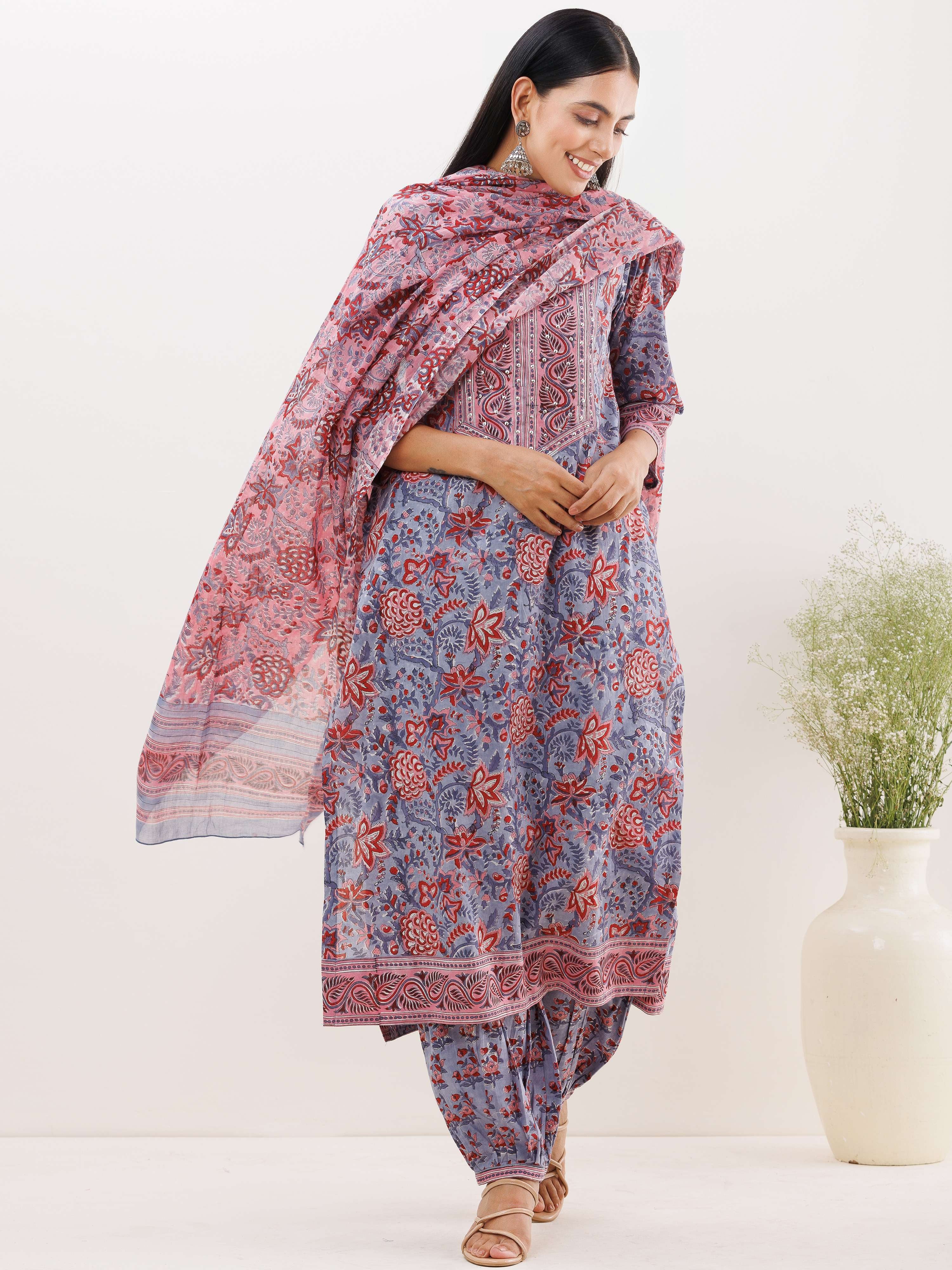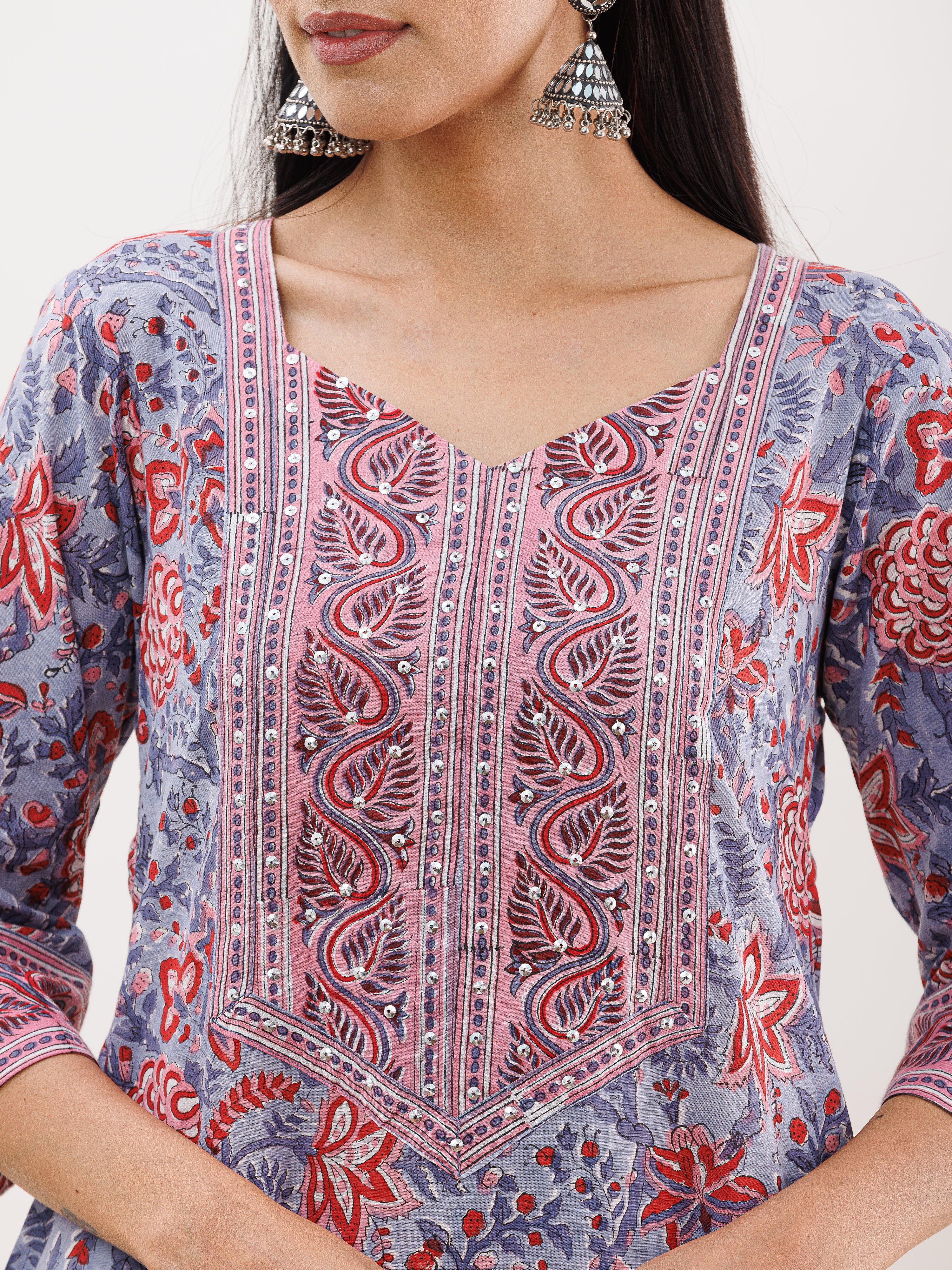 Product: This set contains Handcrafted Sanganeri Premium Cotton Kurta, 100% Cotton Pants and Cotton Mulmul Dupatta.