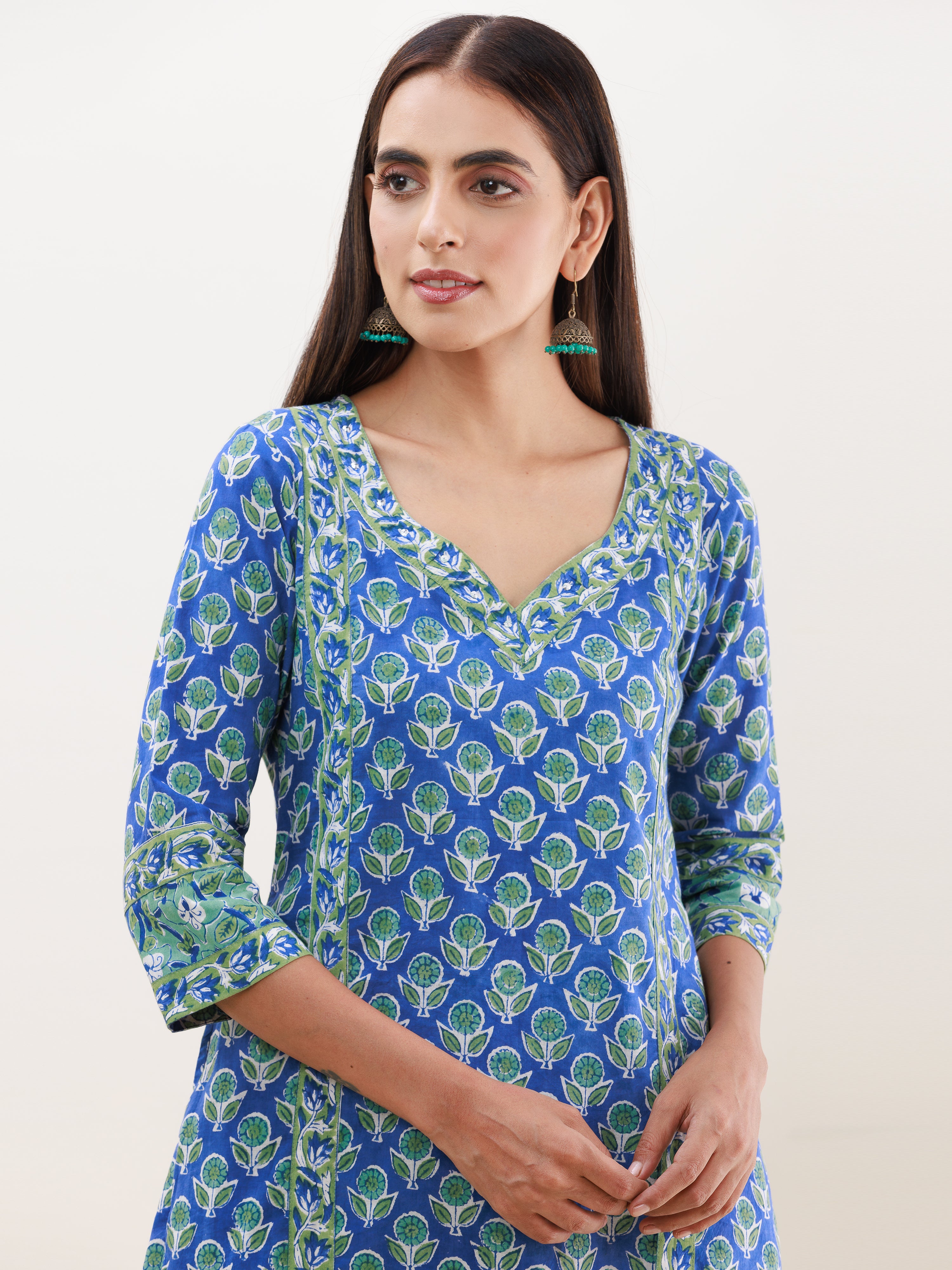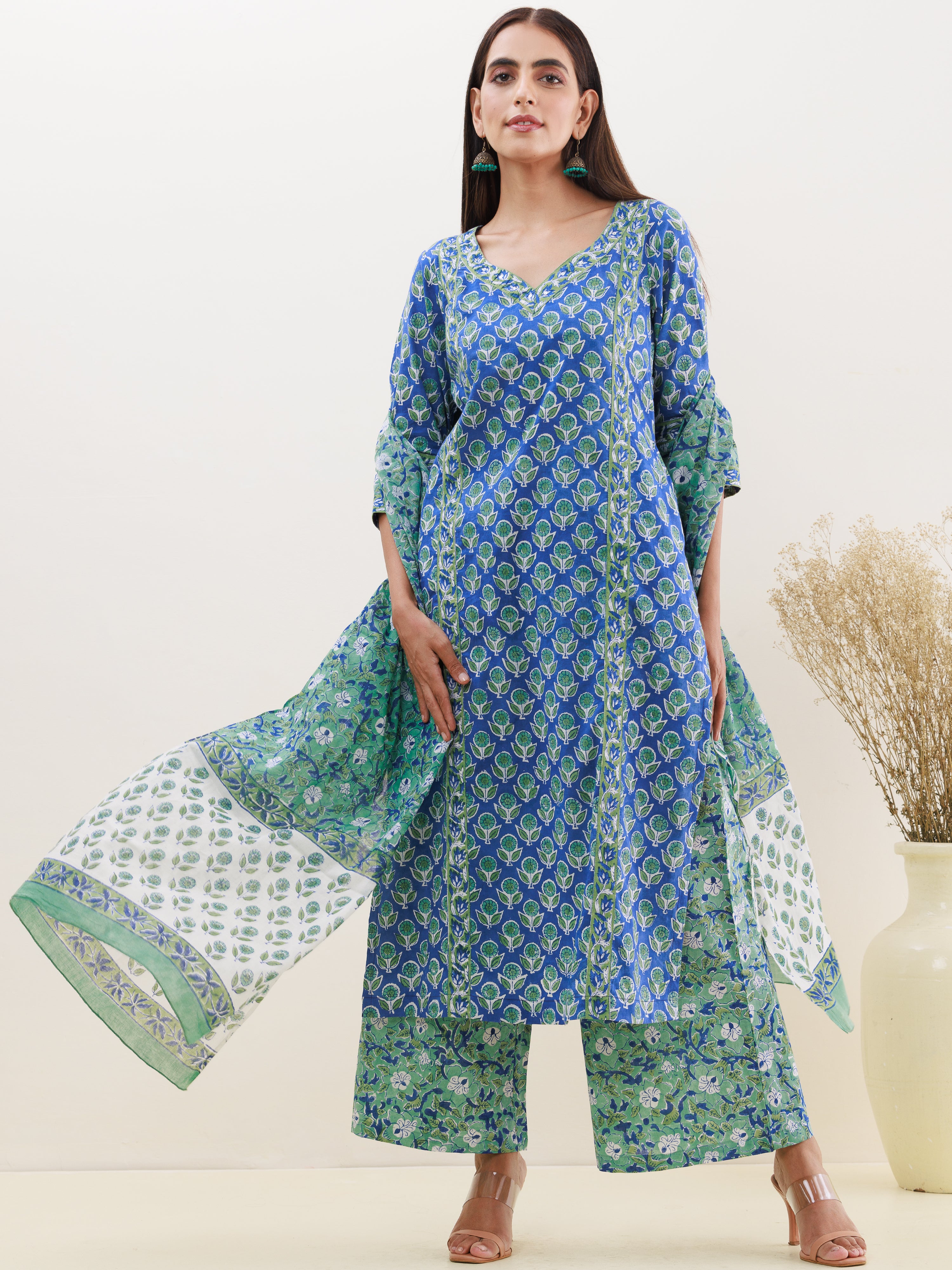 Product: This set contains Handcrafted Sanganeri Premium Cotton Kurta, 100% Cotton Pants and Cotton Mulmul Dupatta.