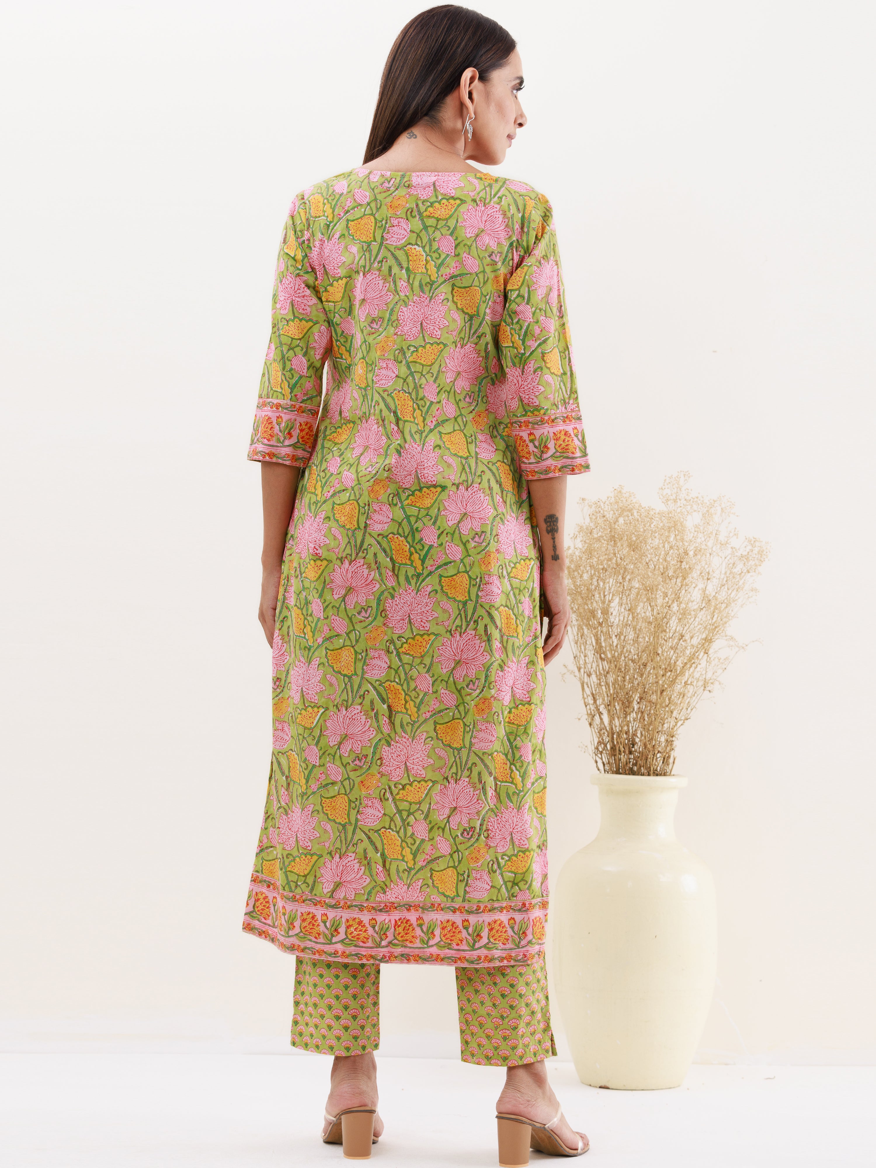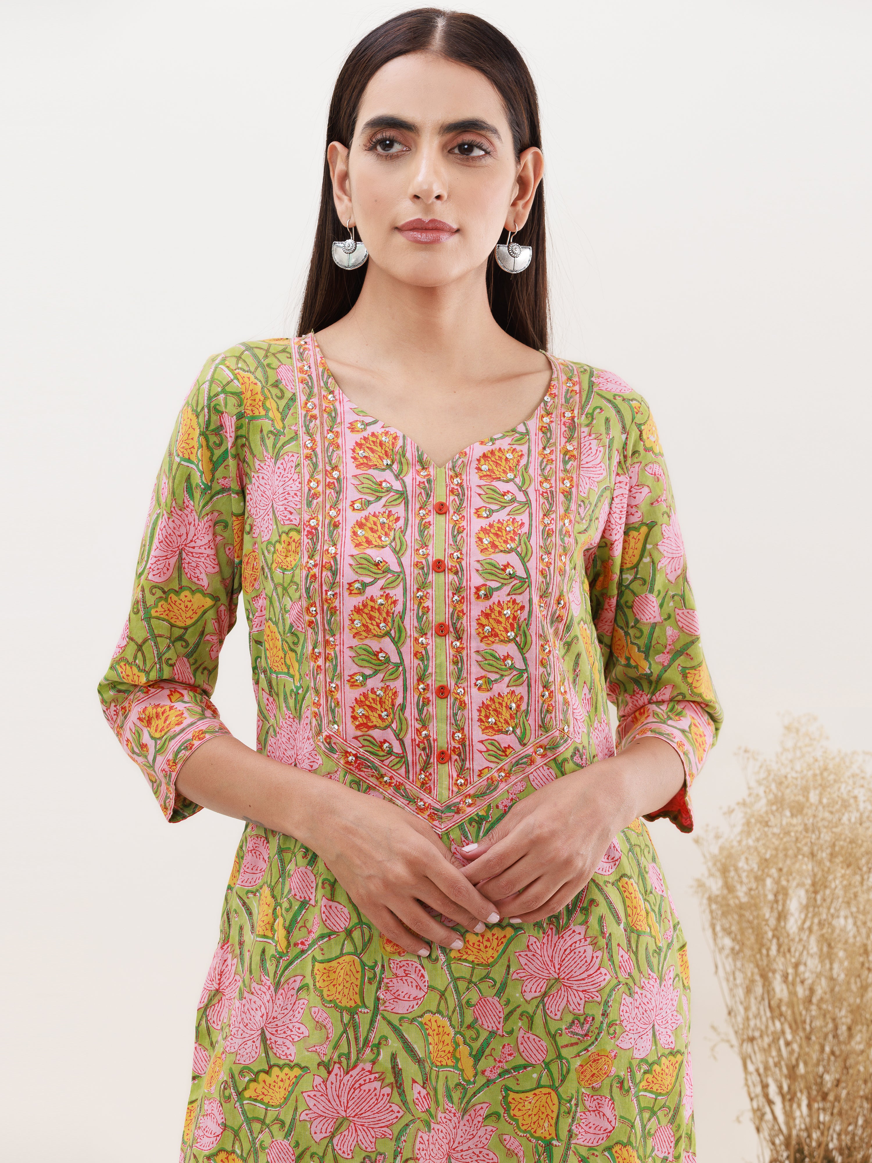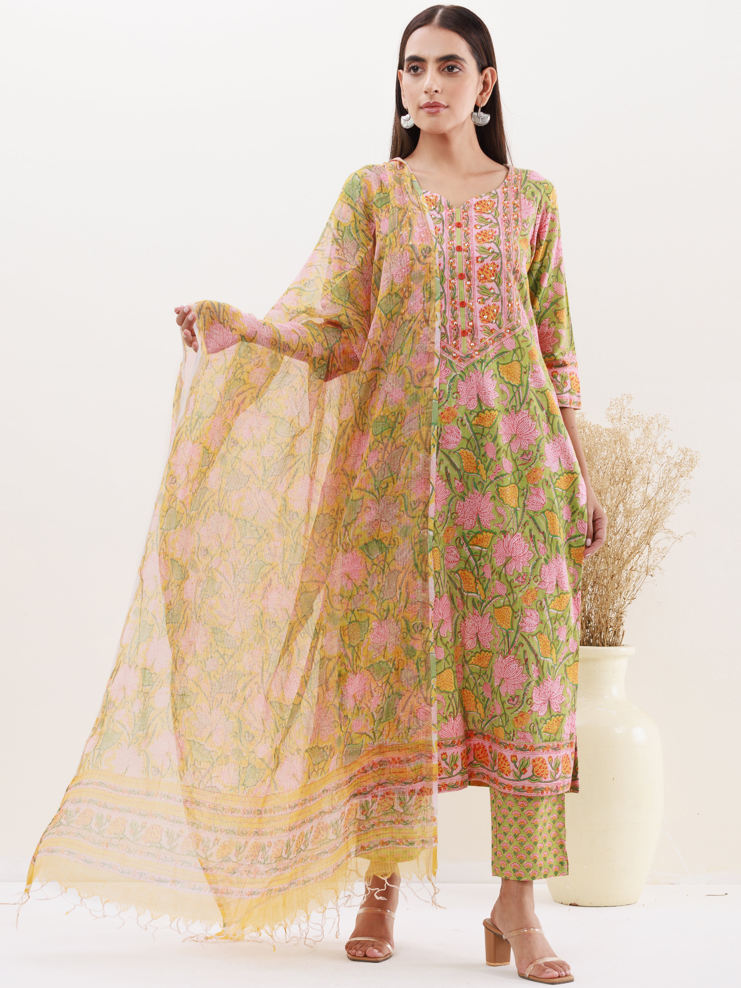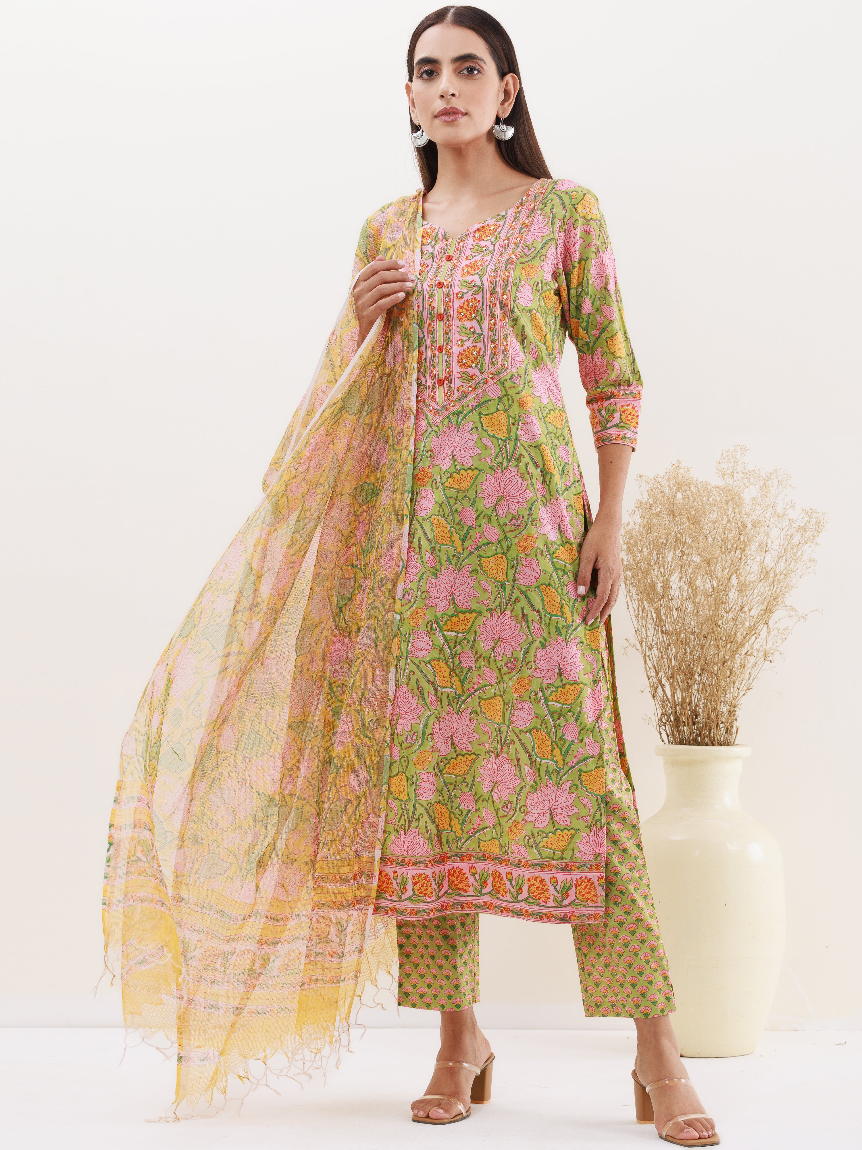 Product: This set contains Handcrafted Sanganeri Premium Cotton Kurta, 100% Cotton Pants and Kota Doria Dupatta.