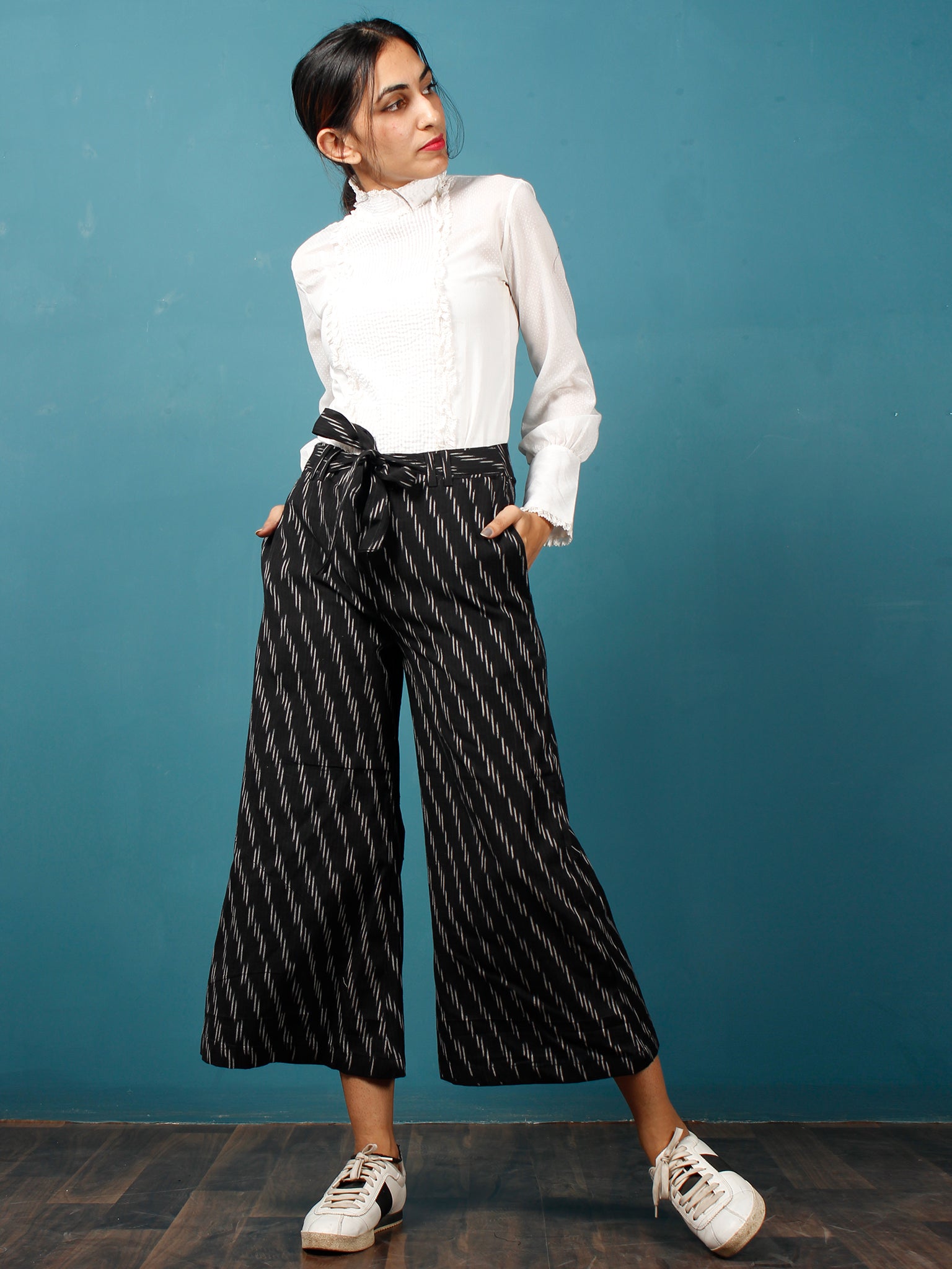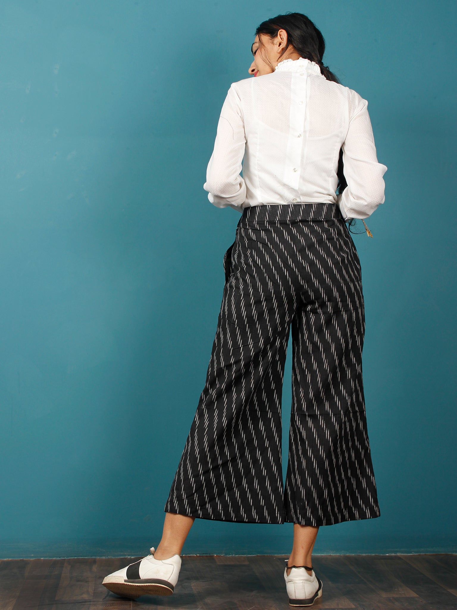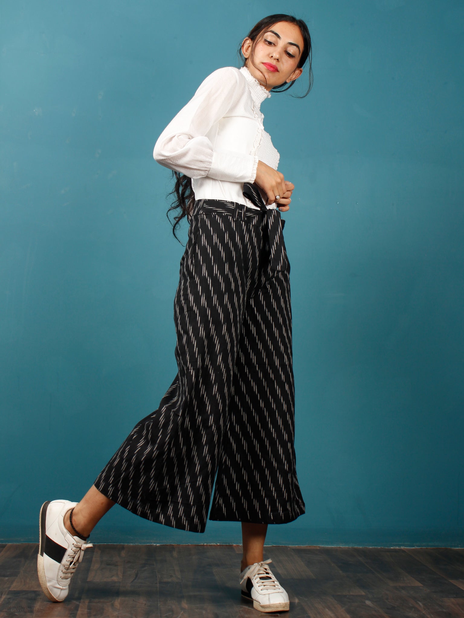 Black Grey Hand Woven Ikat Culottes Trousers With Belt- T032F1251