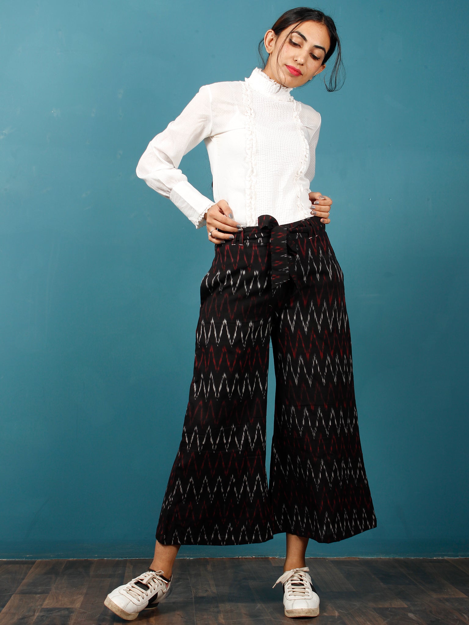 Black Maroon White Hand Woven Ikat Culottes Trousers With Belt- T032F1239