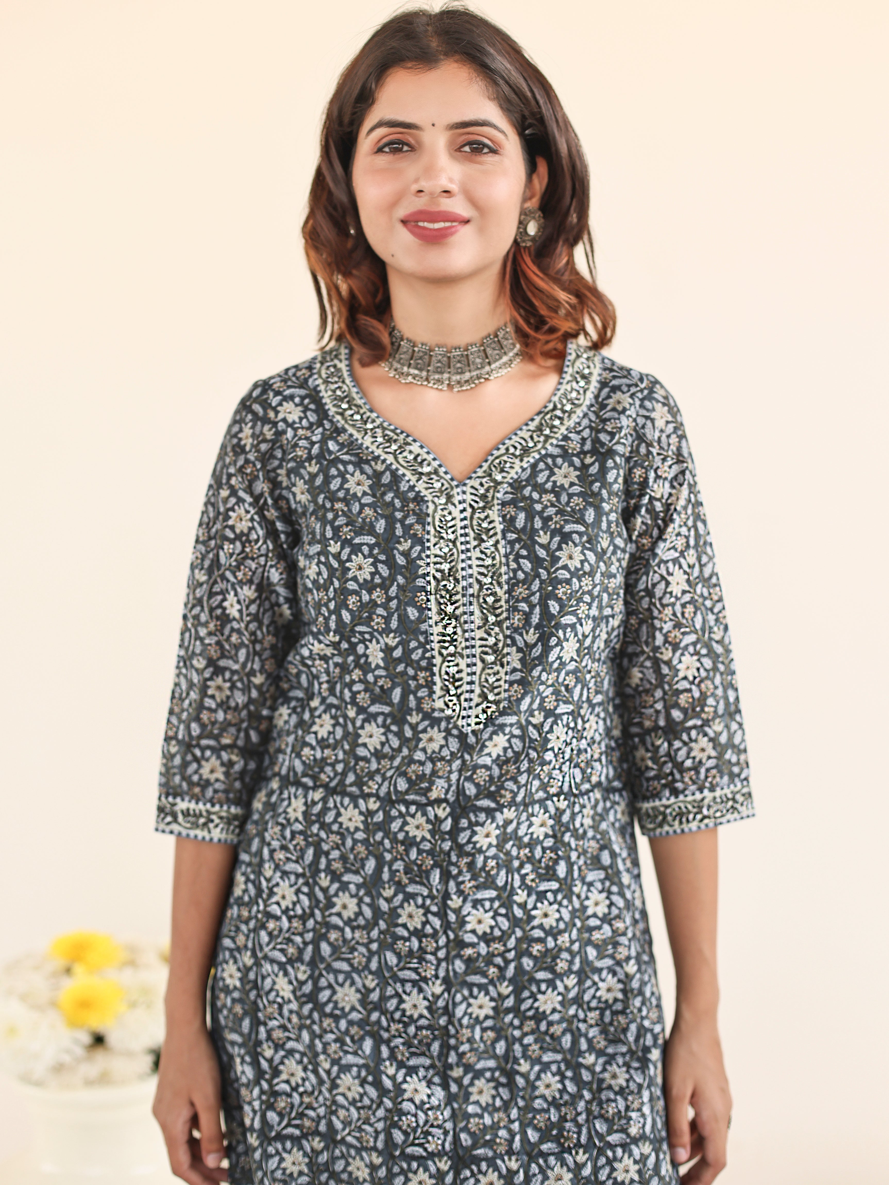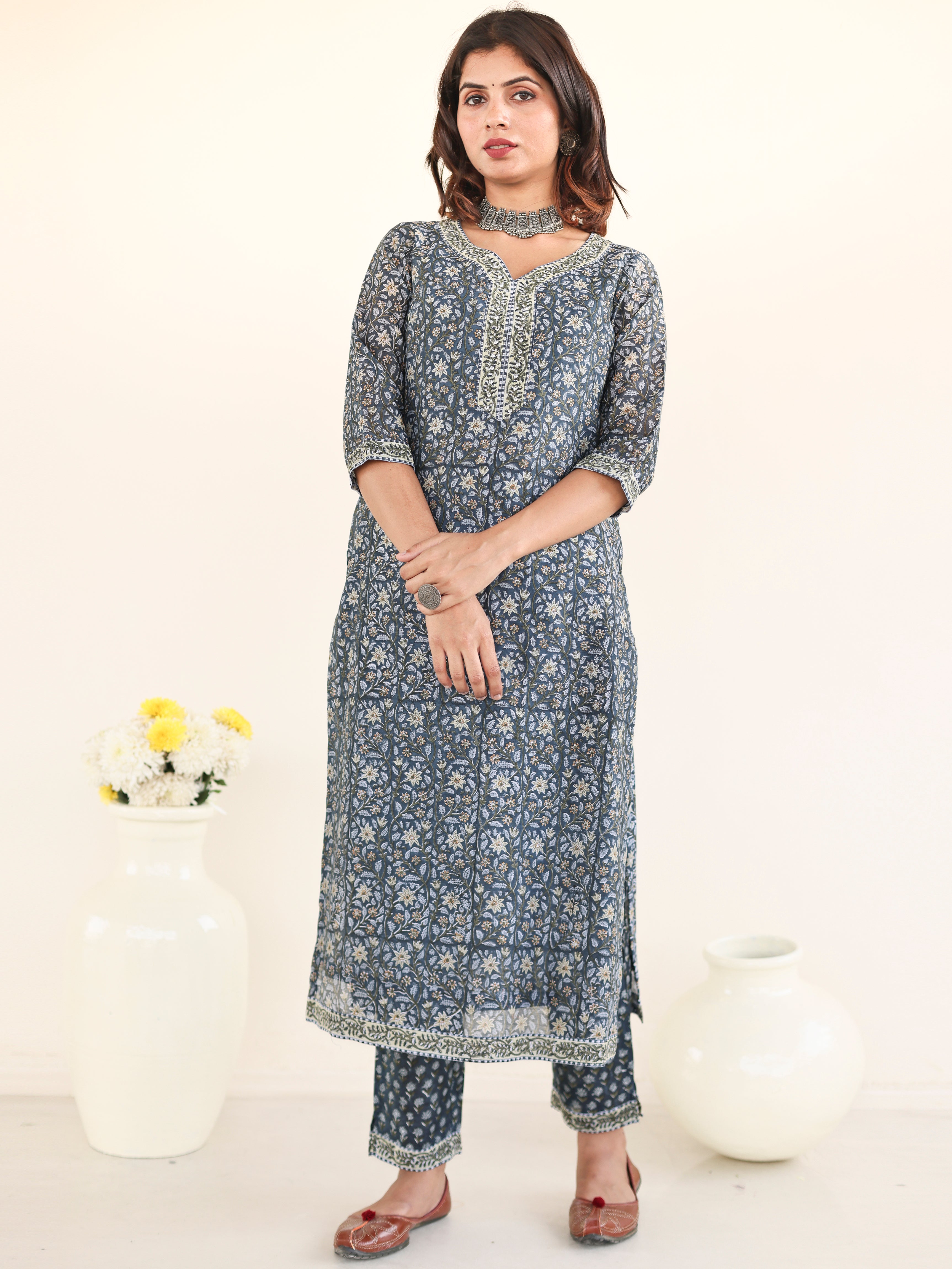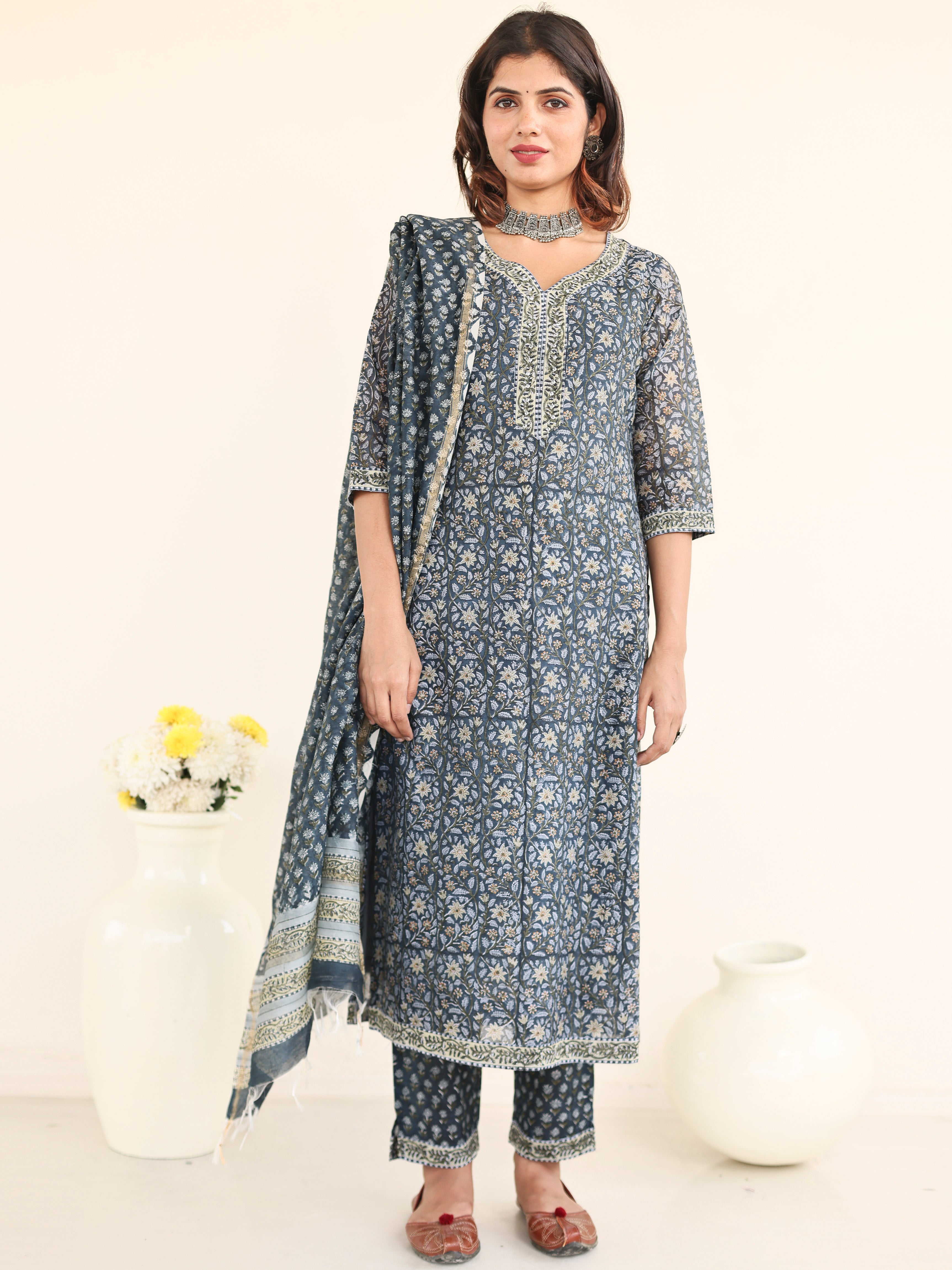 Product: This set contains Handcrafted Sanganeri Premium Chanderi Kurta With Mul lining, Modal Silk Pants and Chanderi Silk Dupatta.