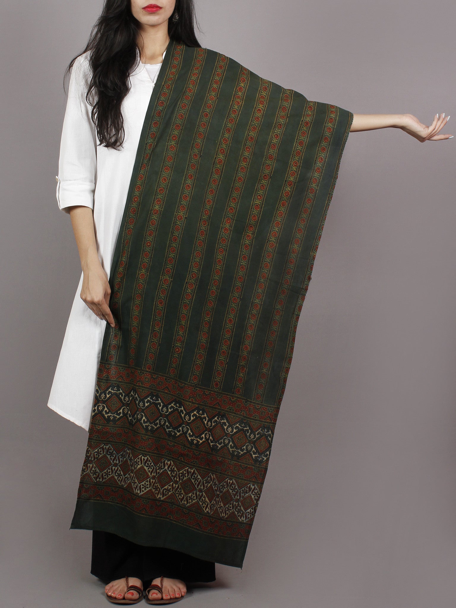 Dark Green Maroon Black Mughal Nakashi Ajrakh Hand Block Printed Cotton Stole - S63170132