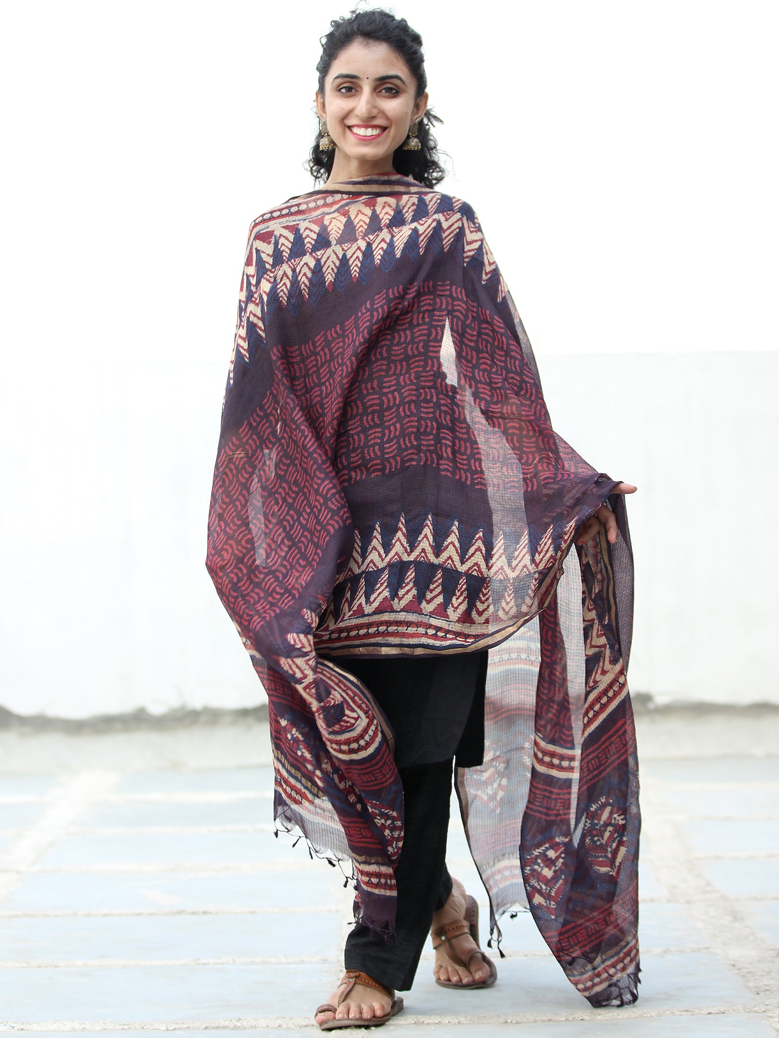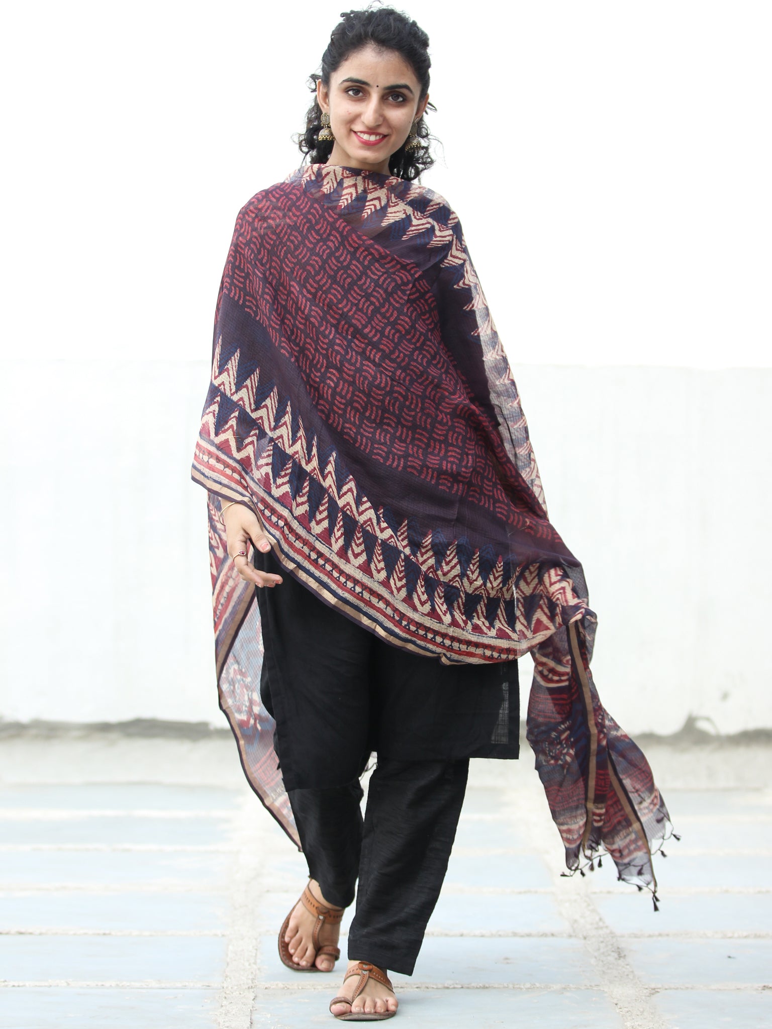Deep Indigo Ivory Wine Kota Silk Hand Block Printed Dupatta - D04170509