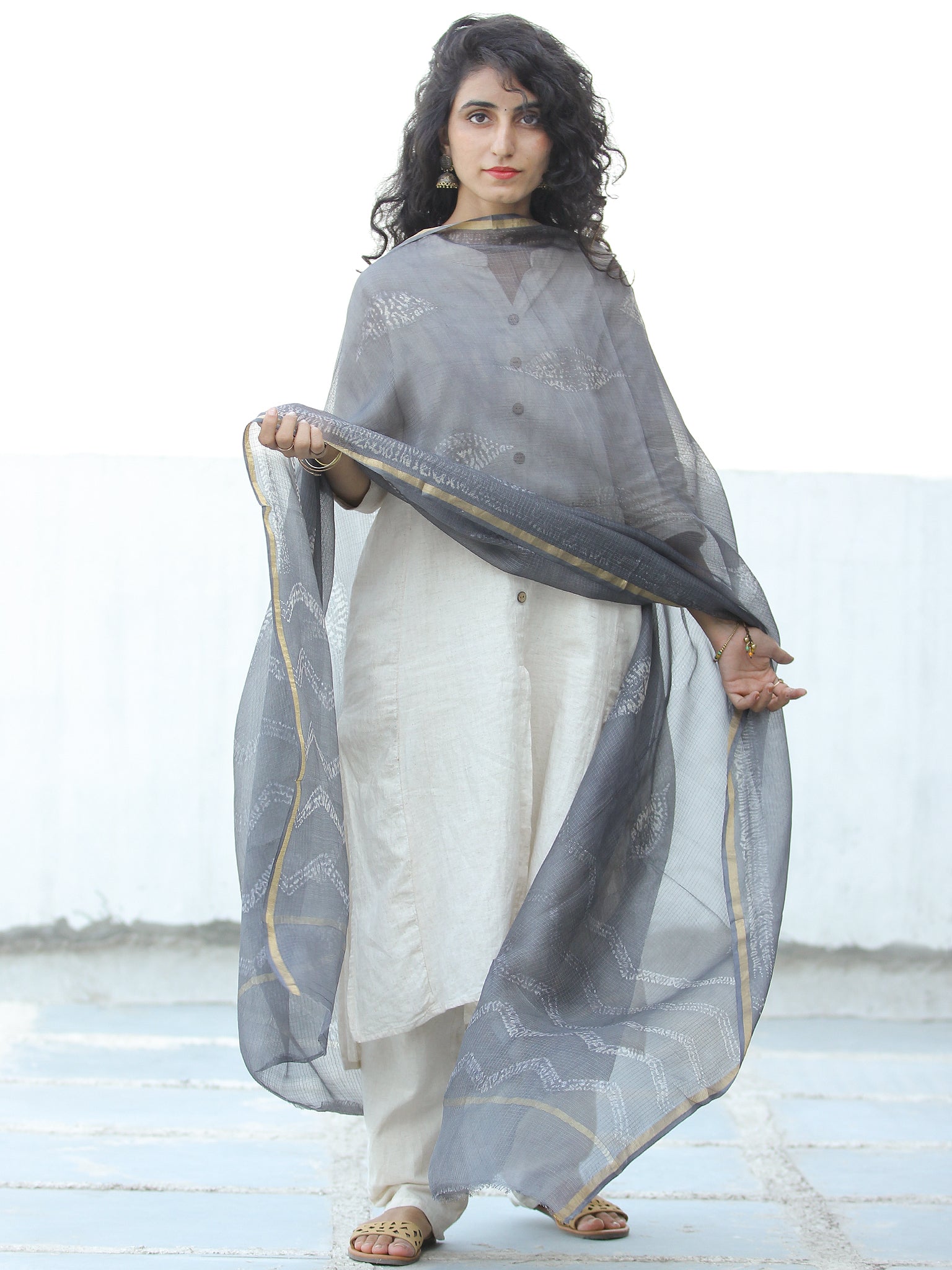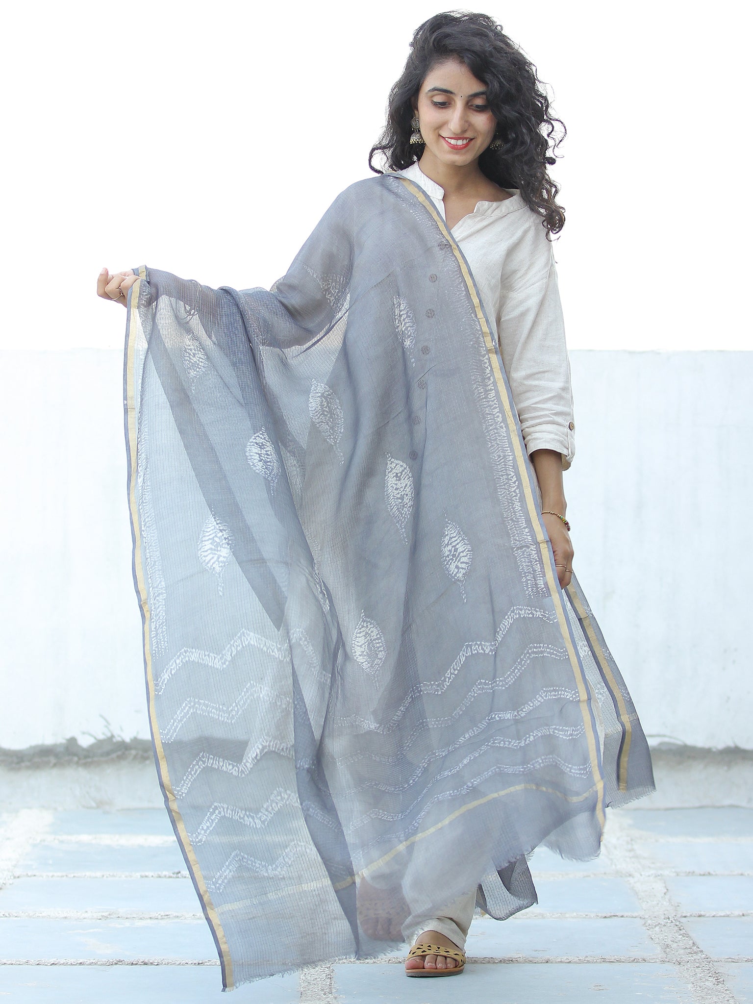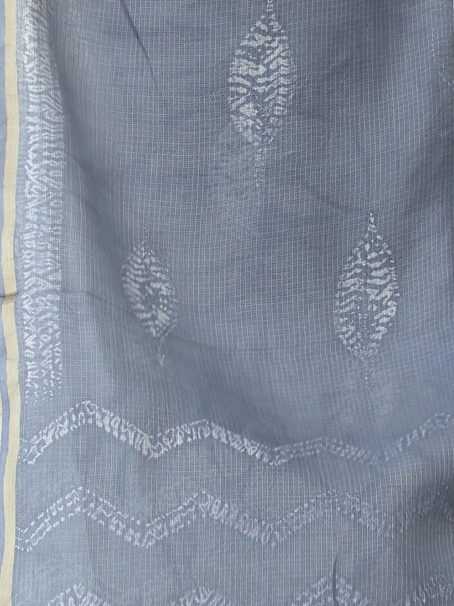 Grey White Shibori Kota Silk Hand Block Printed Dupatta - D04170647