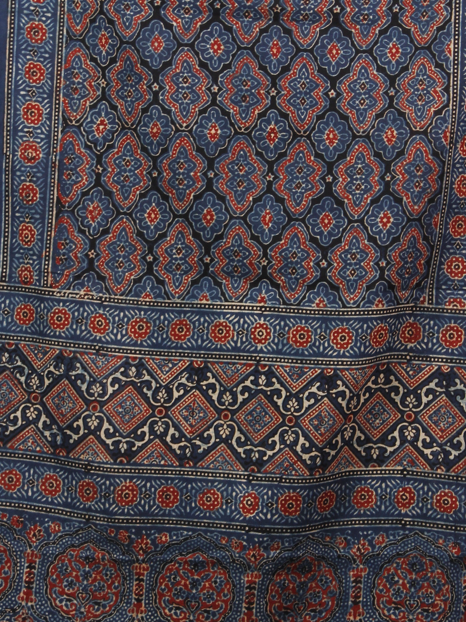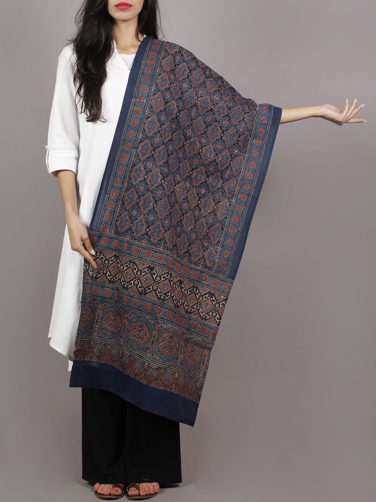 Indigo Maroon Ivory Black Mughal Nakashi Ajrakh Hand Block Printed Cotton Stole - S63170142