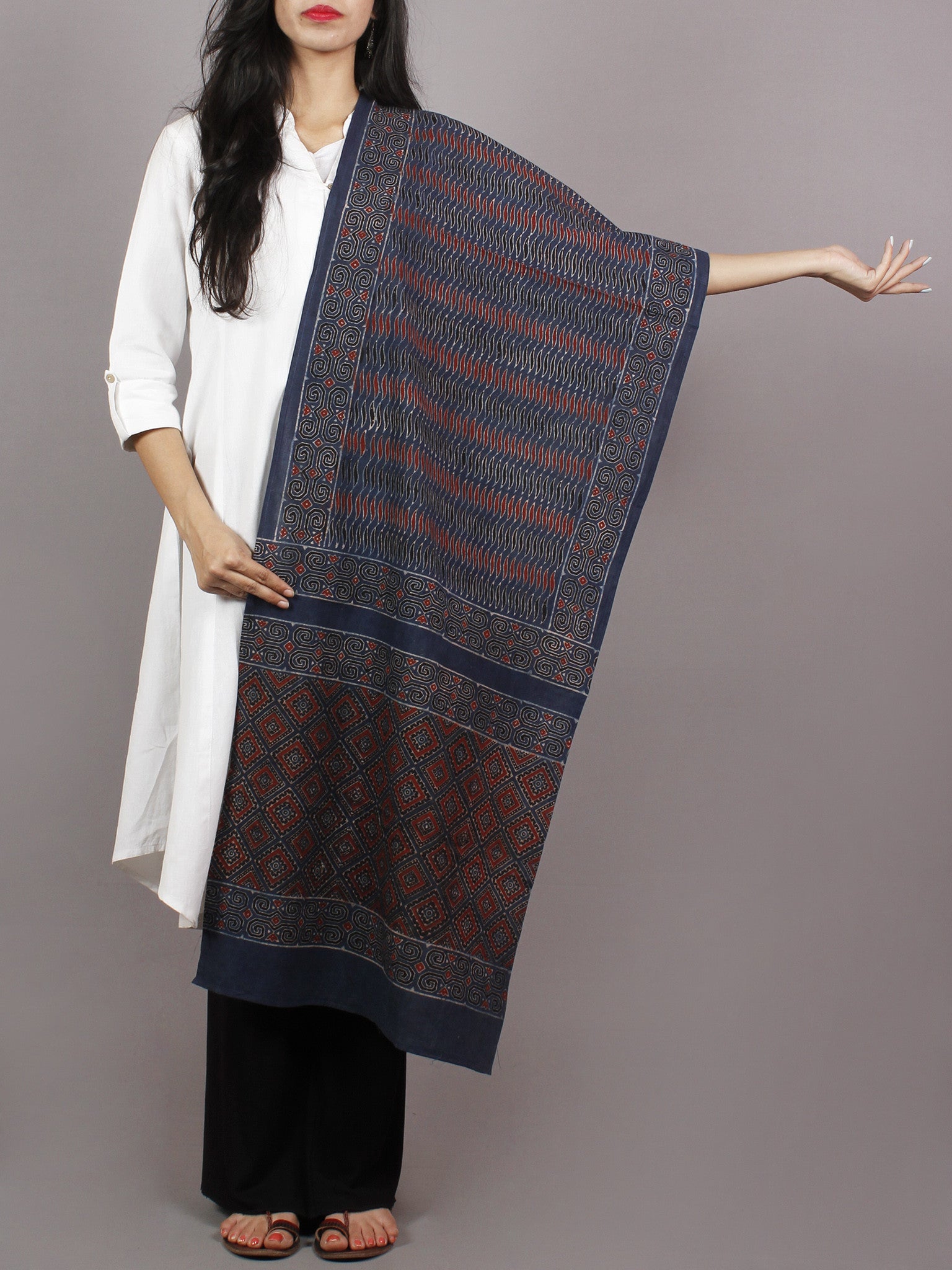 Indigo Maroon Ivory Black Mughal Nakashi Ajrakh Hand Block Printed Cotton Stole - S63170151