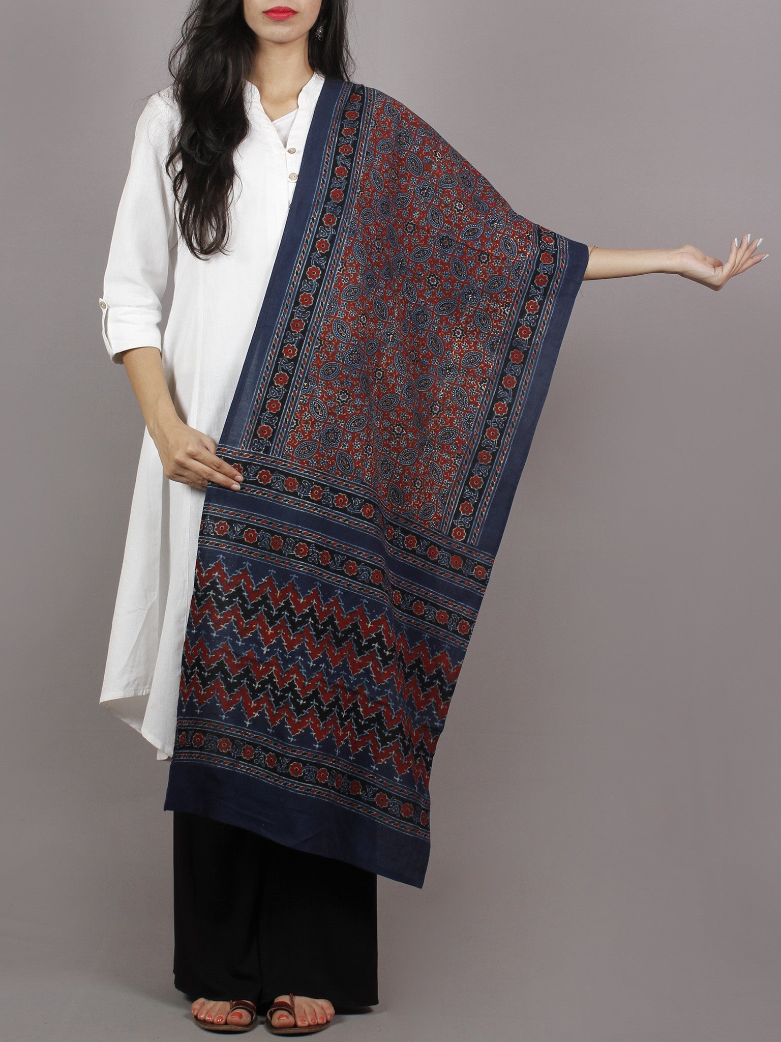 Indigo Maroon Ivory Black Mughal Nakashi Ajrakh Hand Block Printed Cotton Stole - S63170155