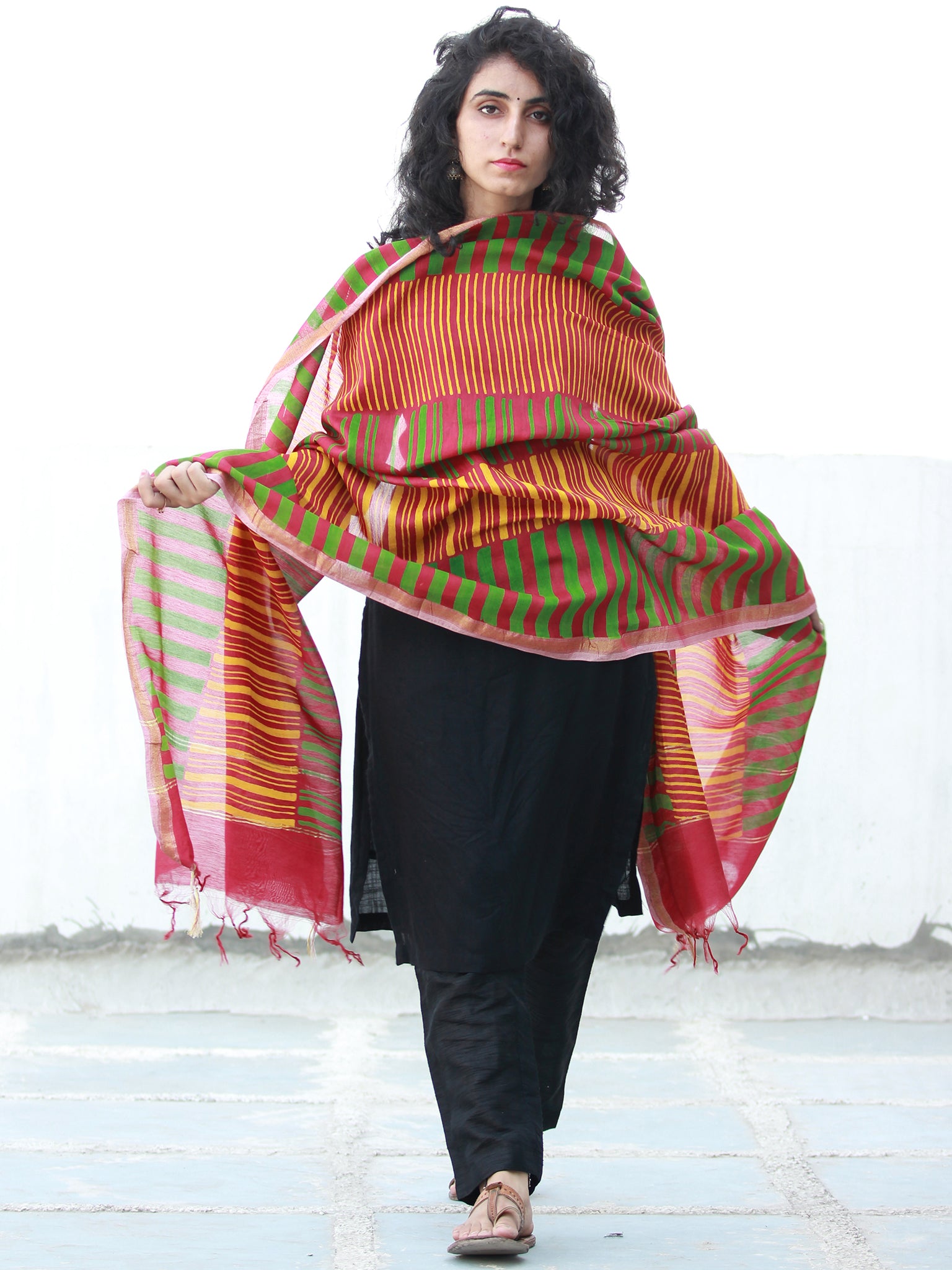 Red Green Yellow Chanderi Hand Block Printed Dupatta - D04170493