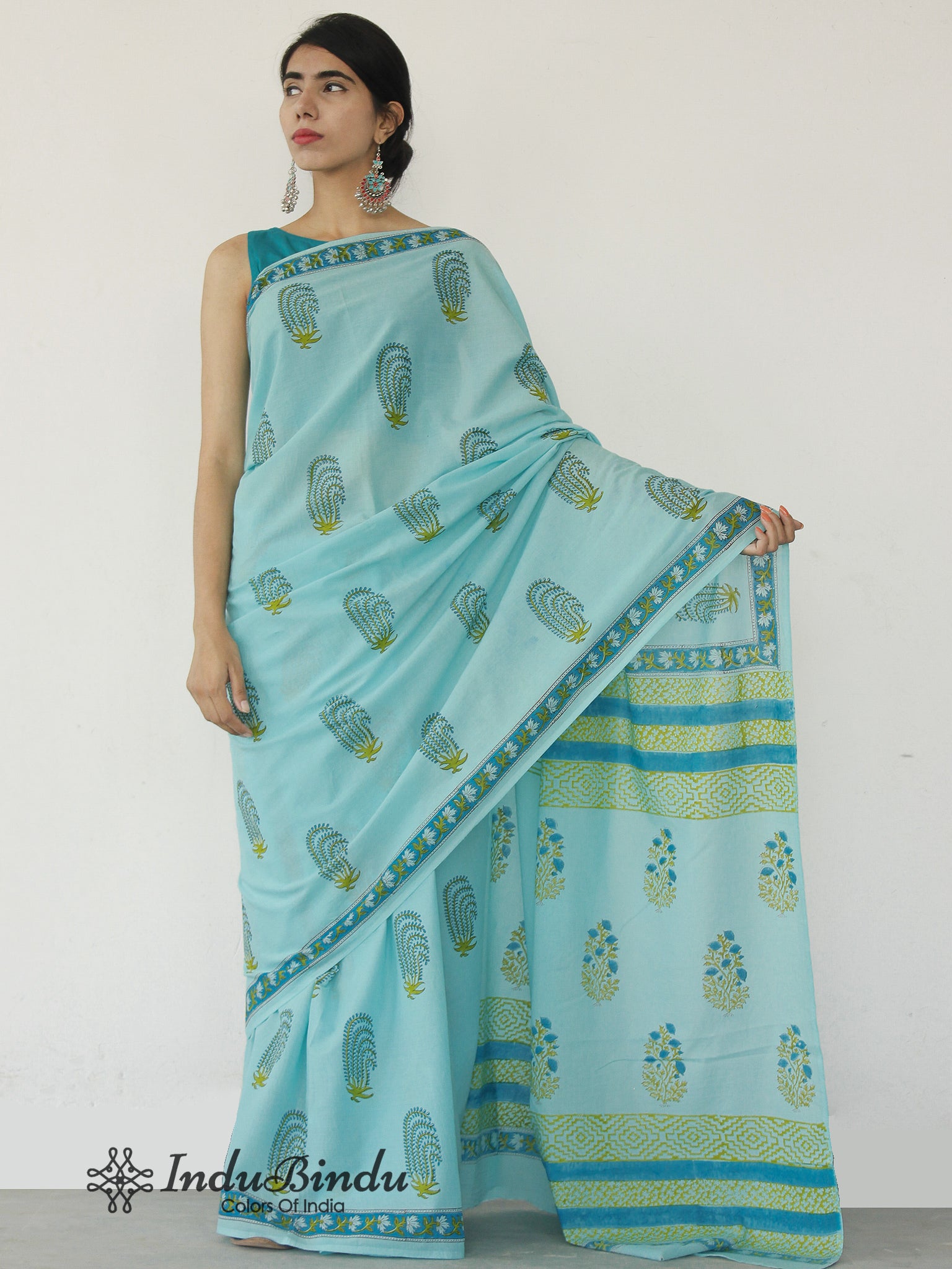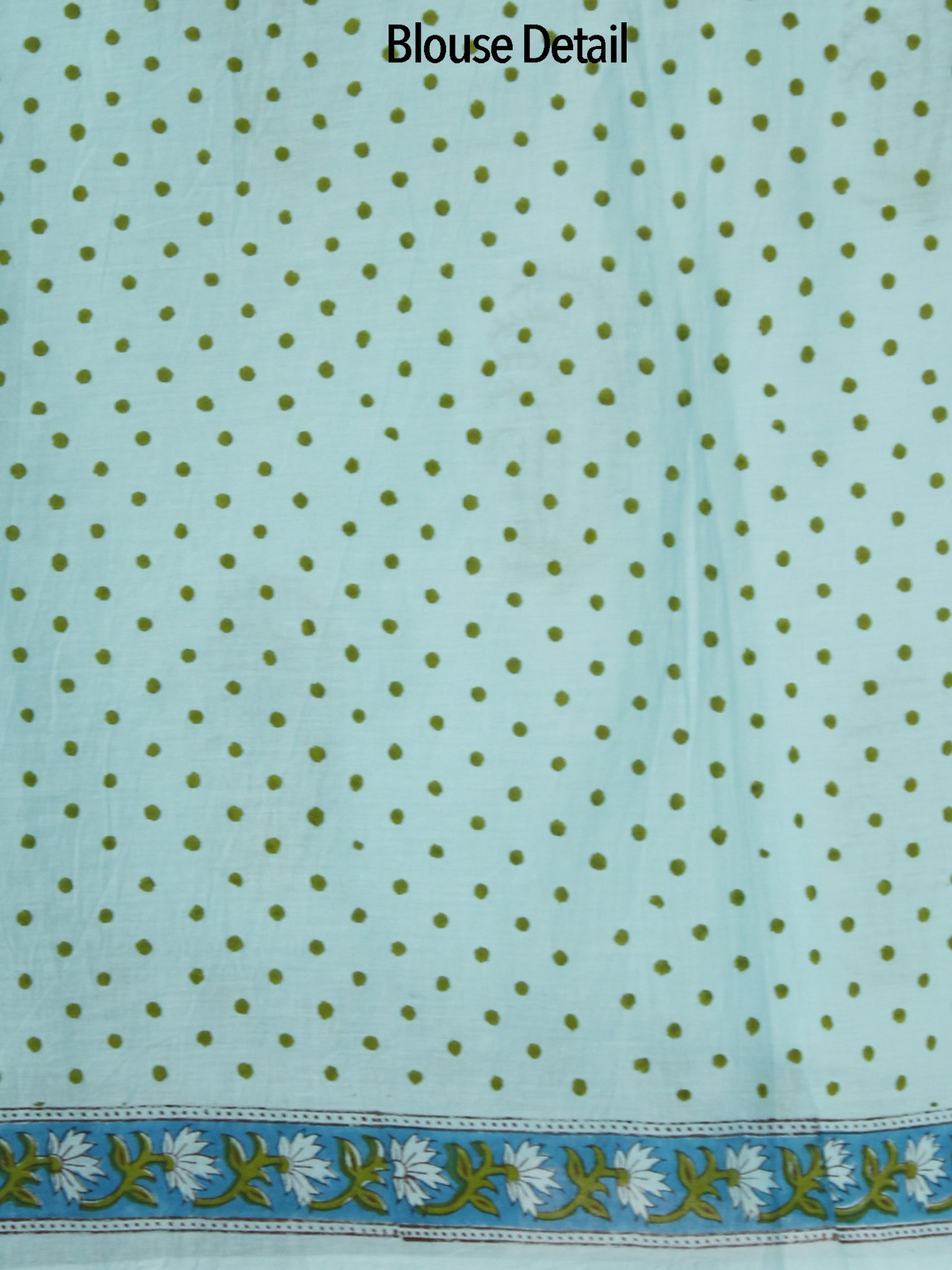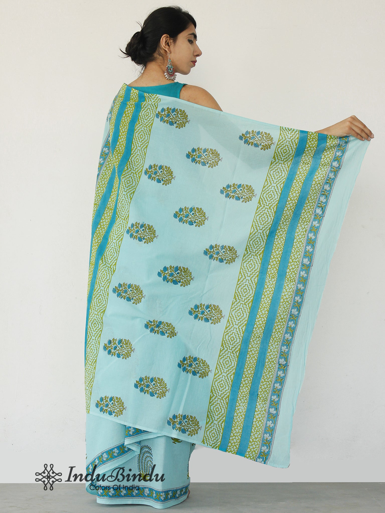 Arctic Blue Green Hand Block Printed Cotton Mul Saree - S031702524