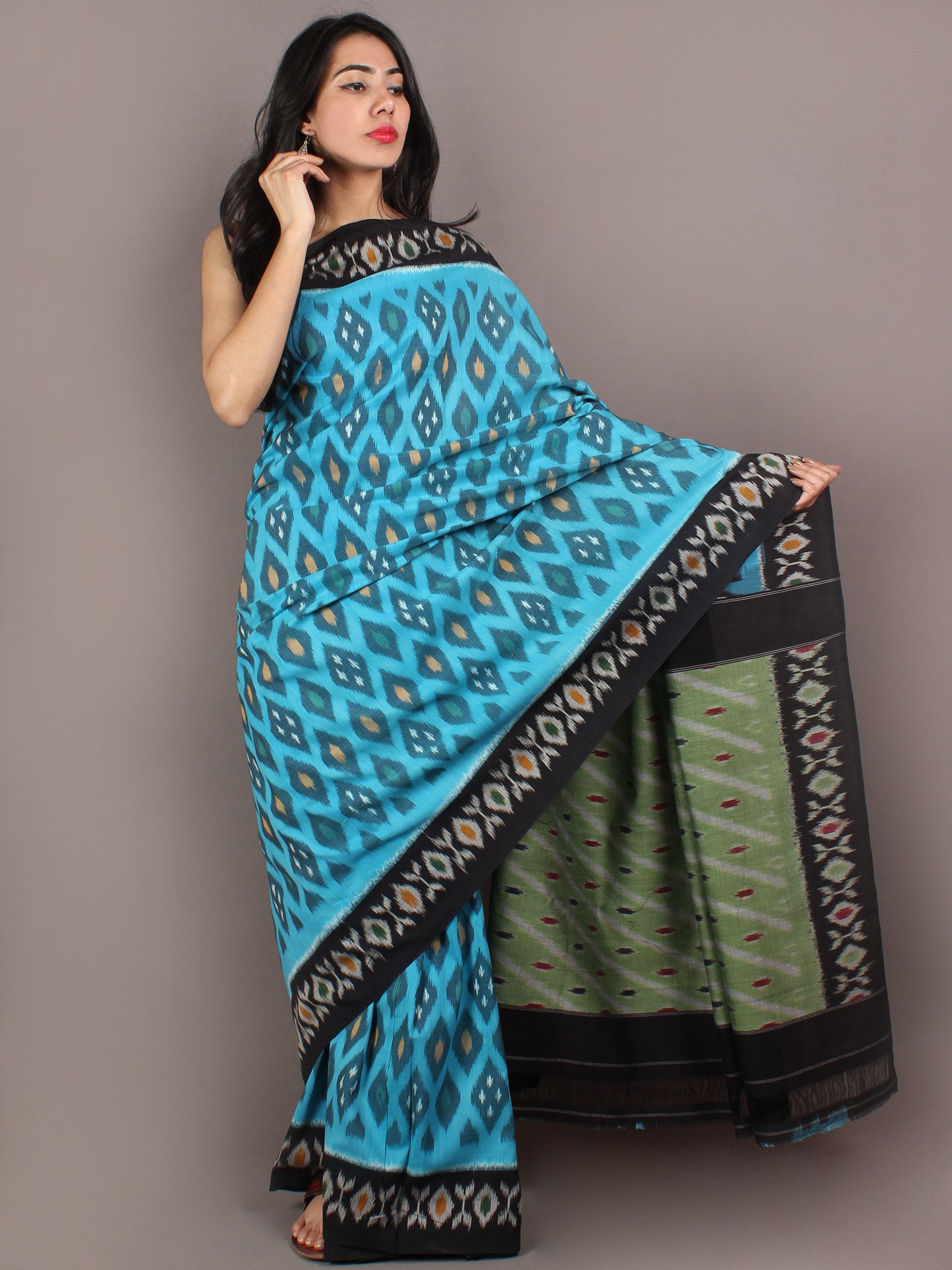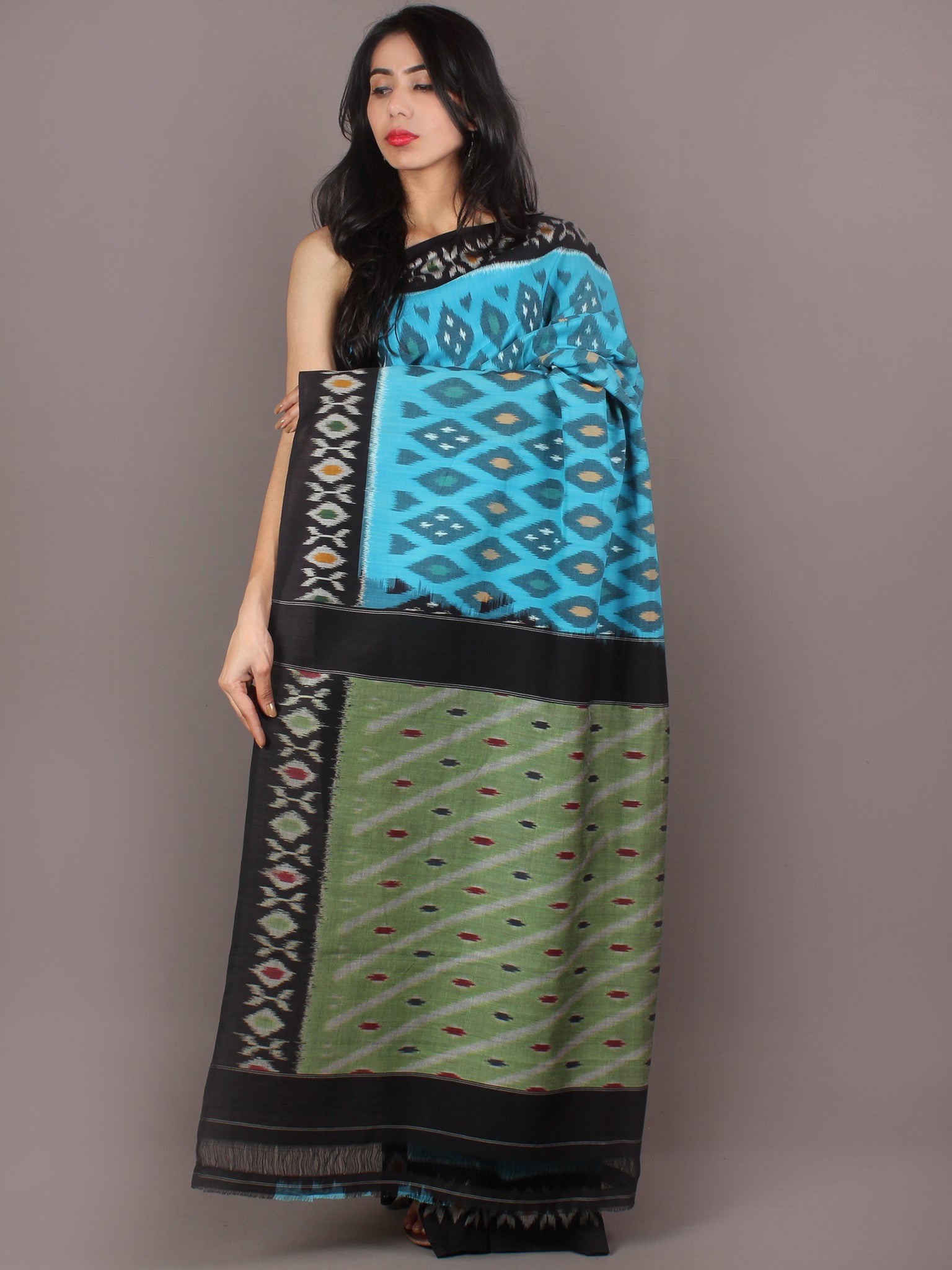Azure Black Green Ikat Handwoven Pochampally Cotton Saree - S031701064