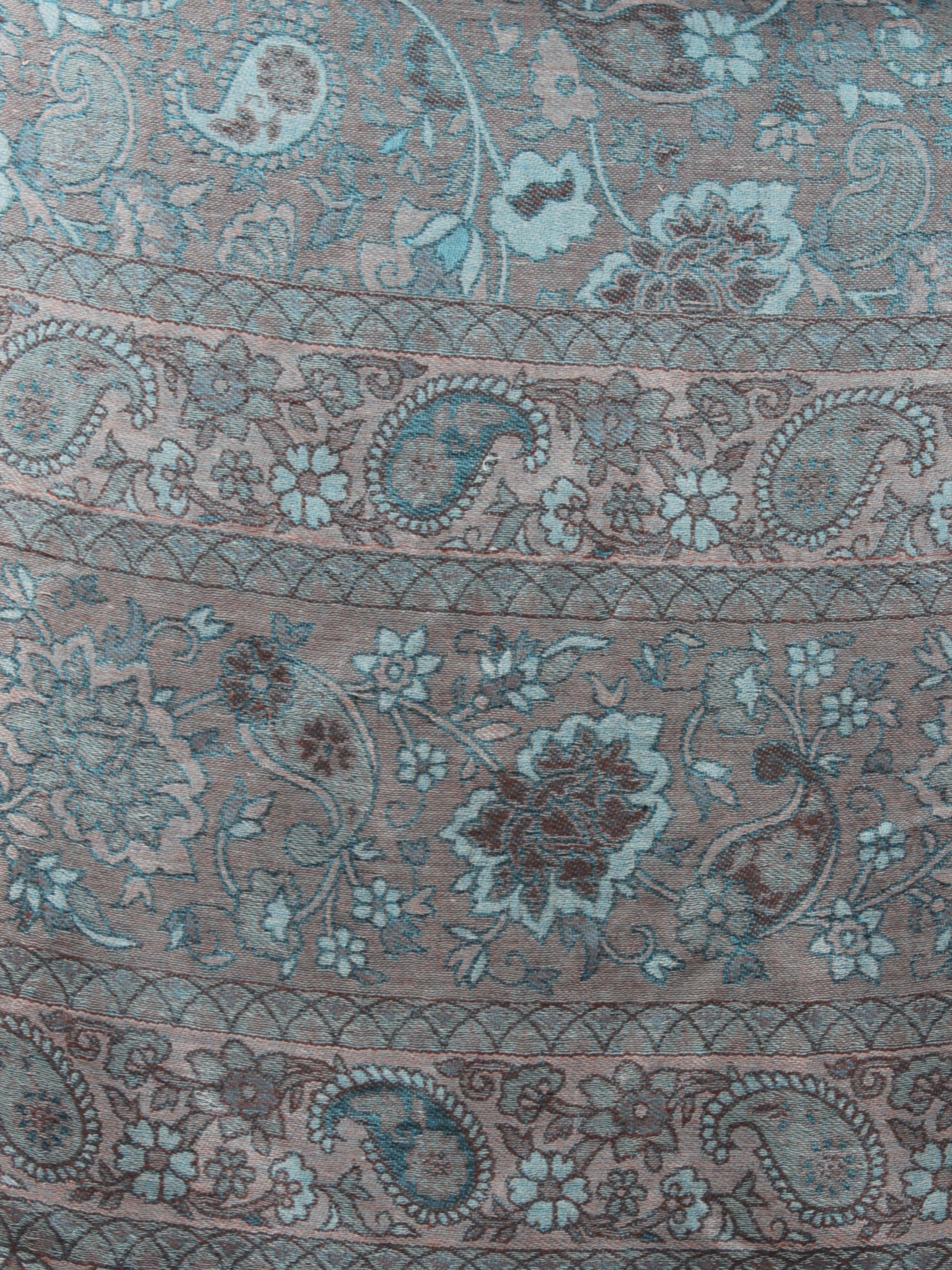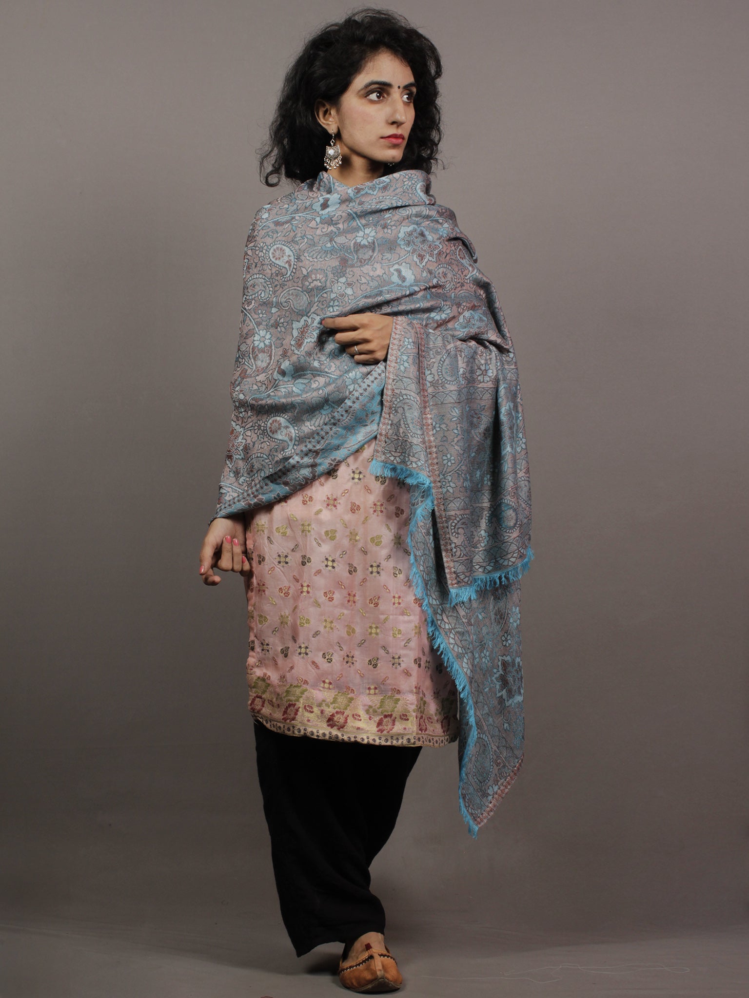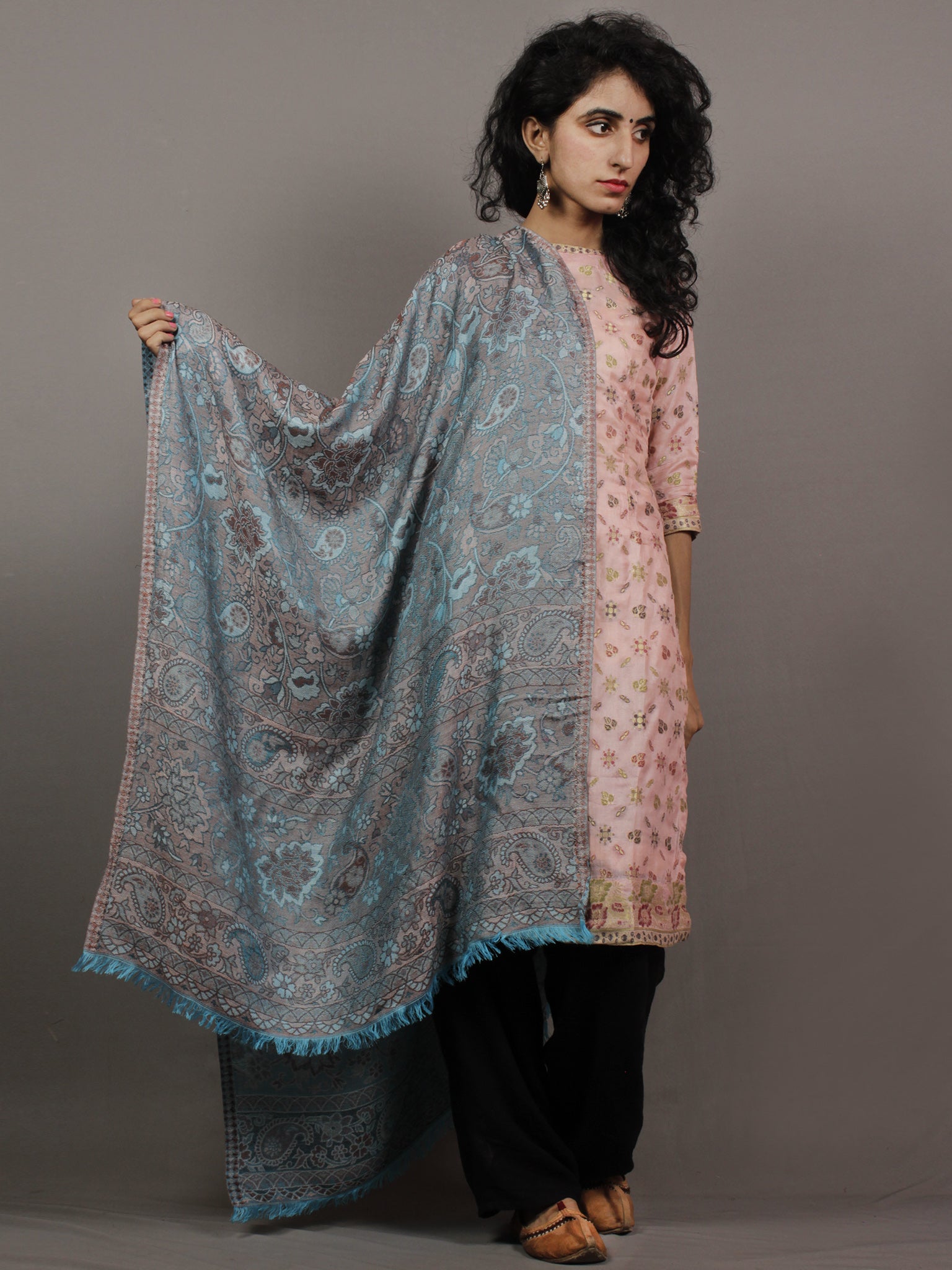 Azure Blue Brown Cashmere Jamawar Silk Woolen Stole - S6317204