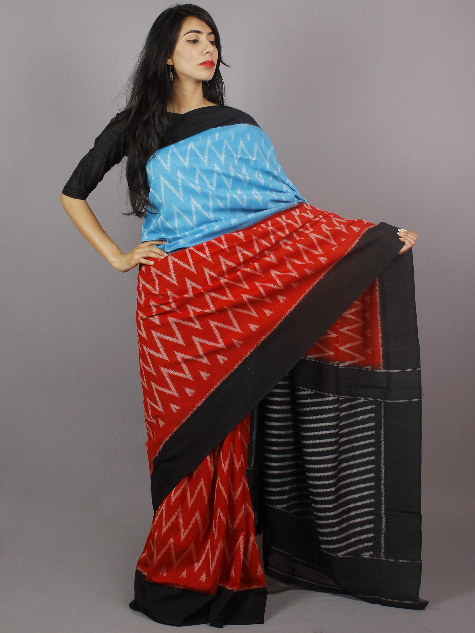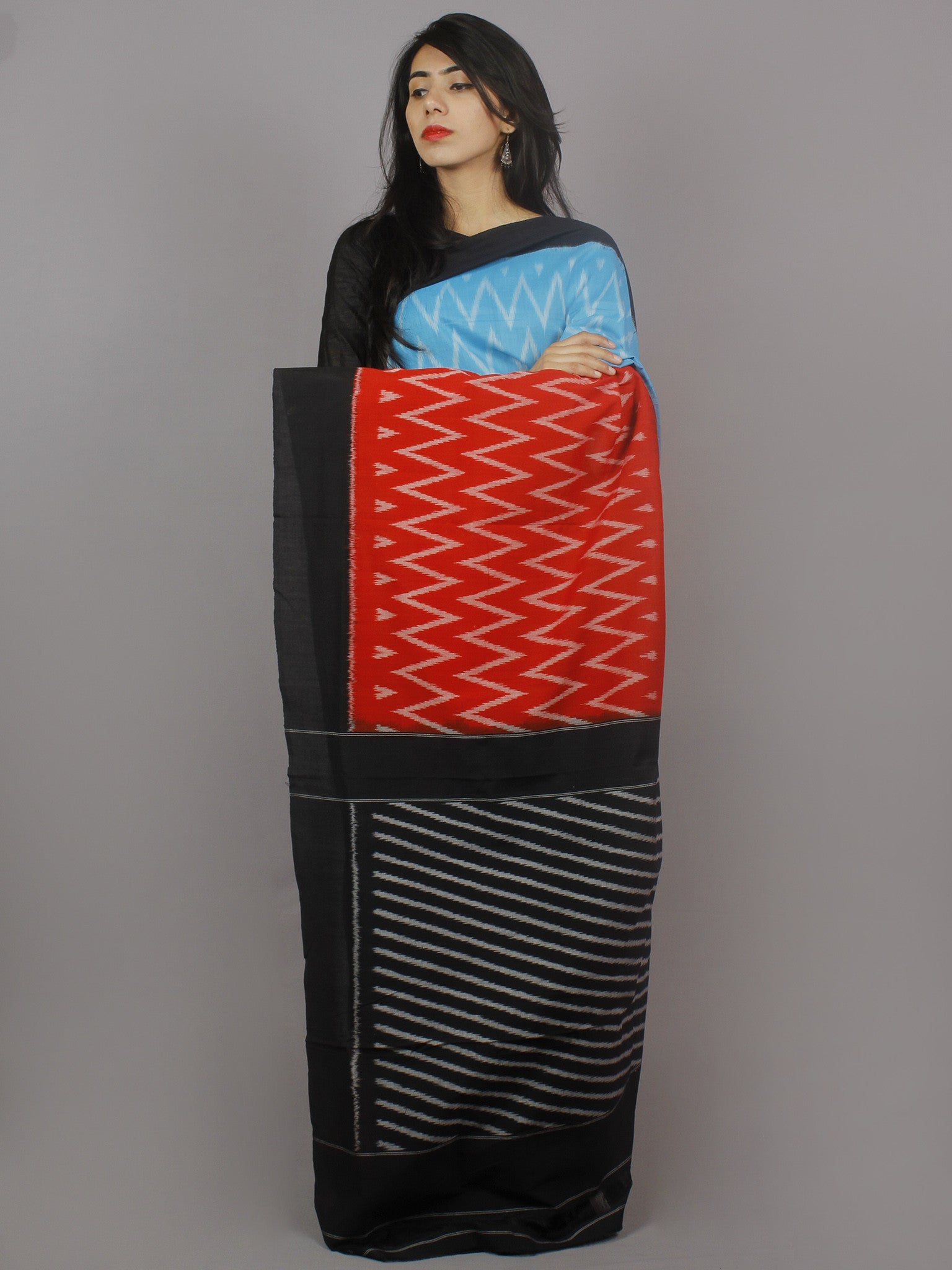 Azure Red Black Grey Ikat Handwoven Pochampally Mercerized Cotton Saree - S031701246