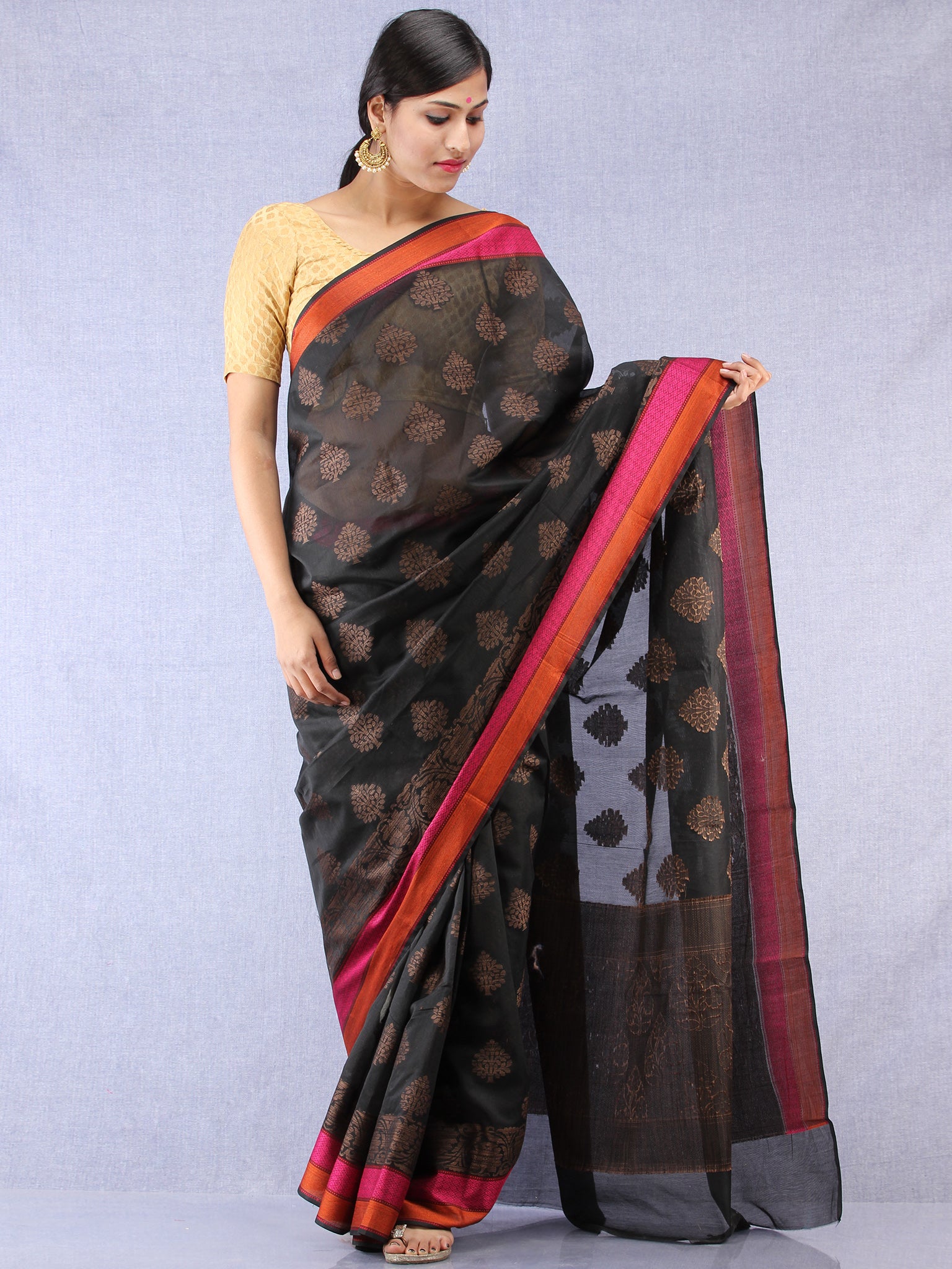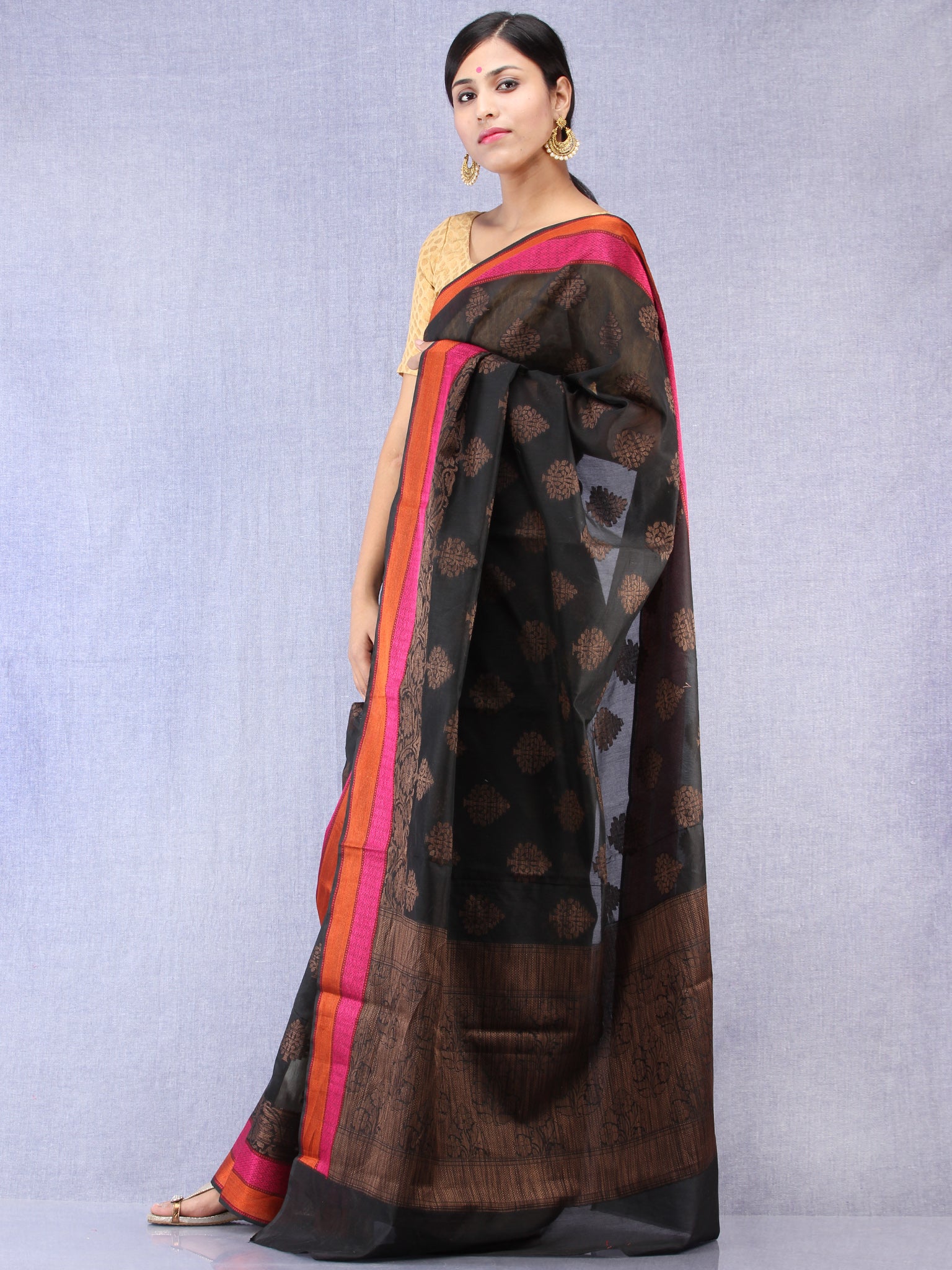 Banarasee Chanderi Silk Saree With Resham Border - Black Pink Copper - S031704322