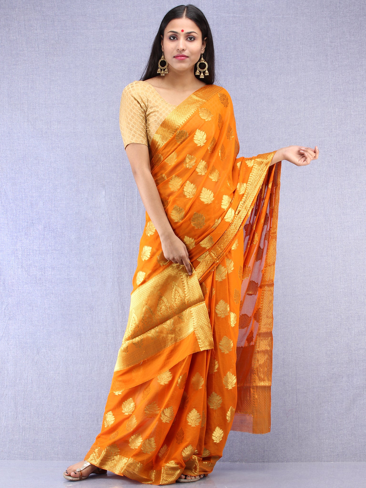 Banarasee Chiffon Saree With Golden Zari Weave - Rust Orange & Gold - S031704401