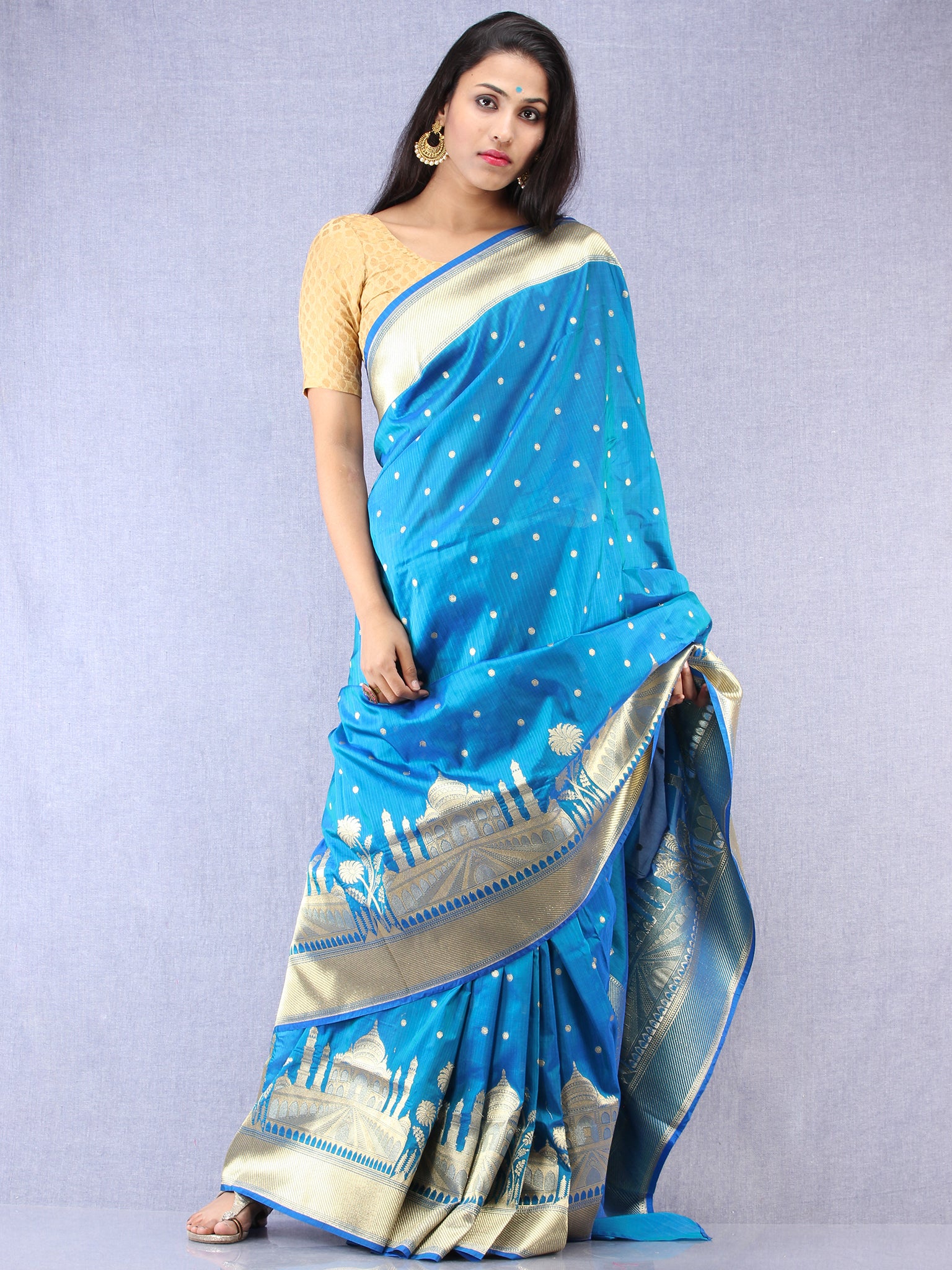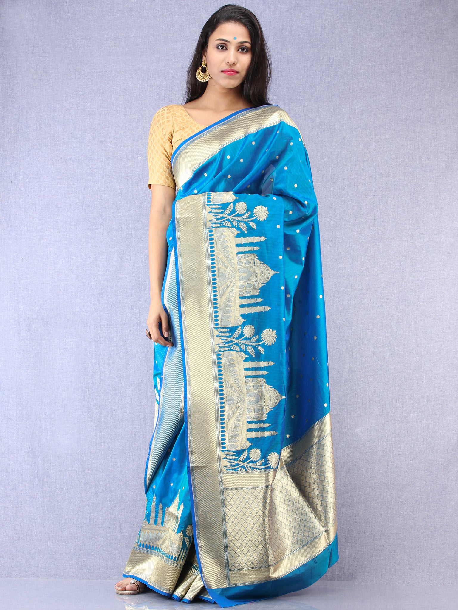 Banarasee Silk Saree With Taj Mahal Motiff & Zari Work - Turquoise Blue & Gold - S031704336