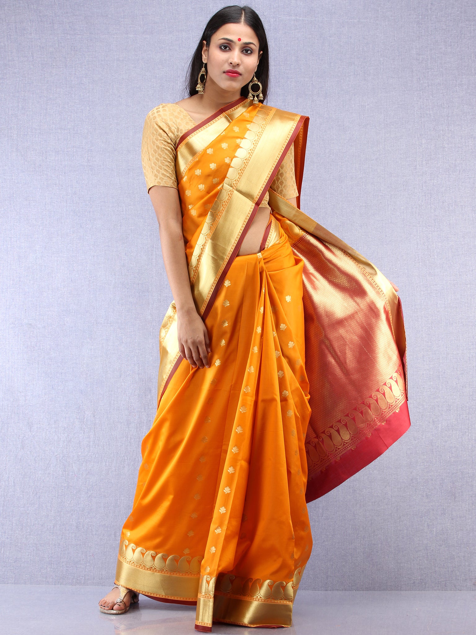 Banarasee Art Silk Saree With Zari Work - Mustard Yellow Maroon & Gold - S031704418