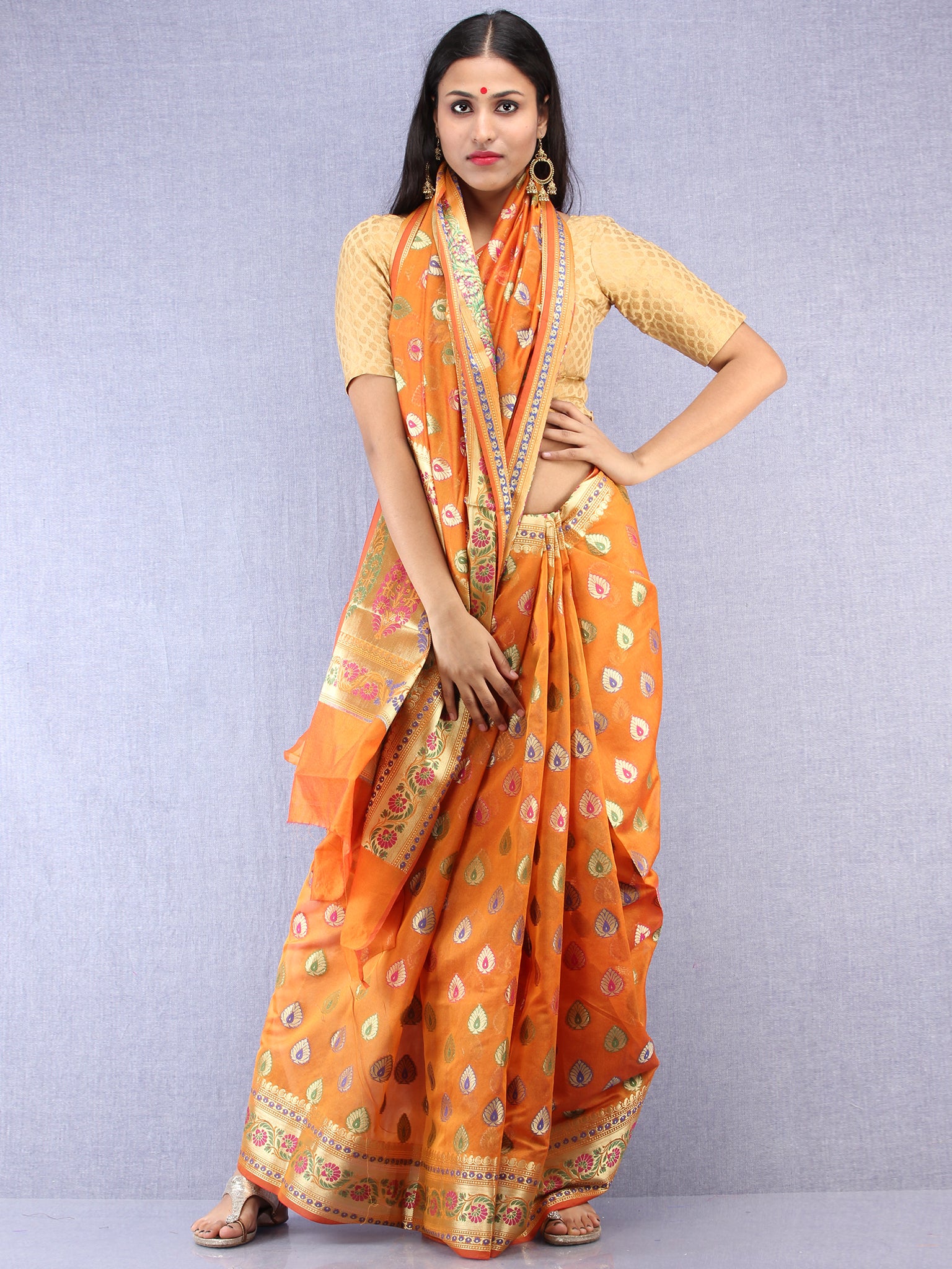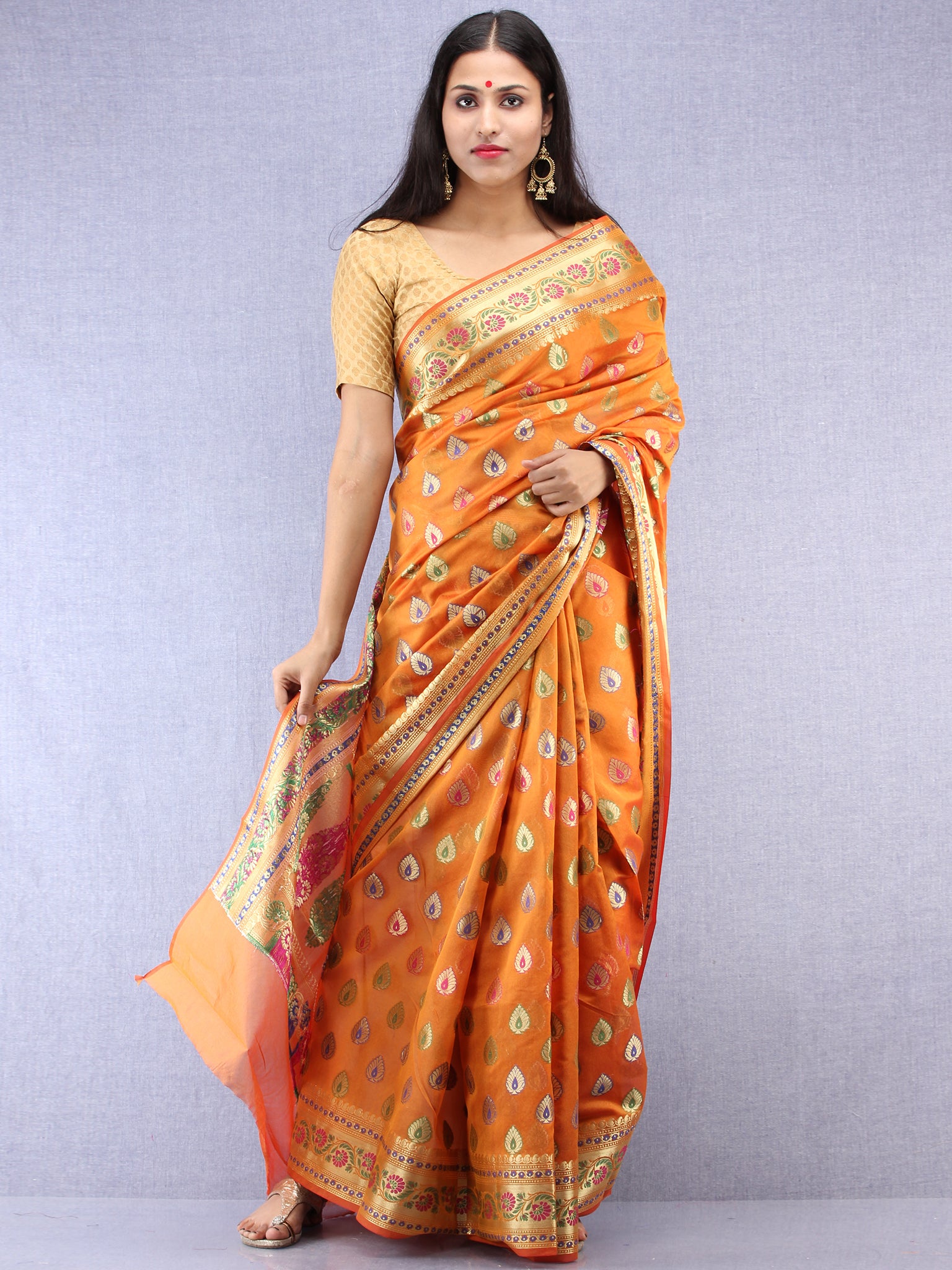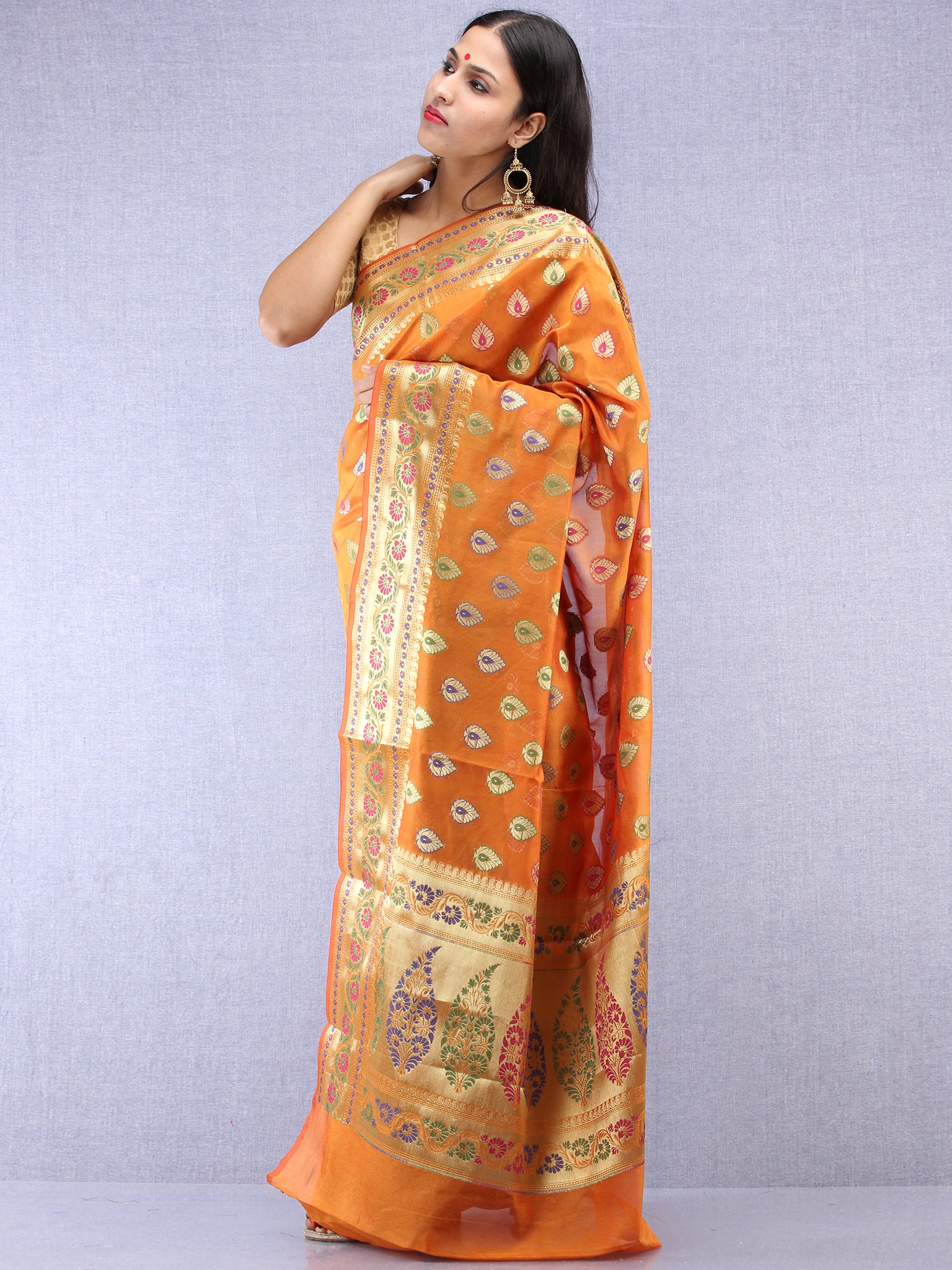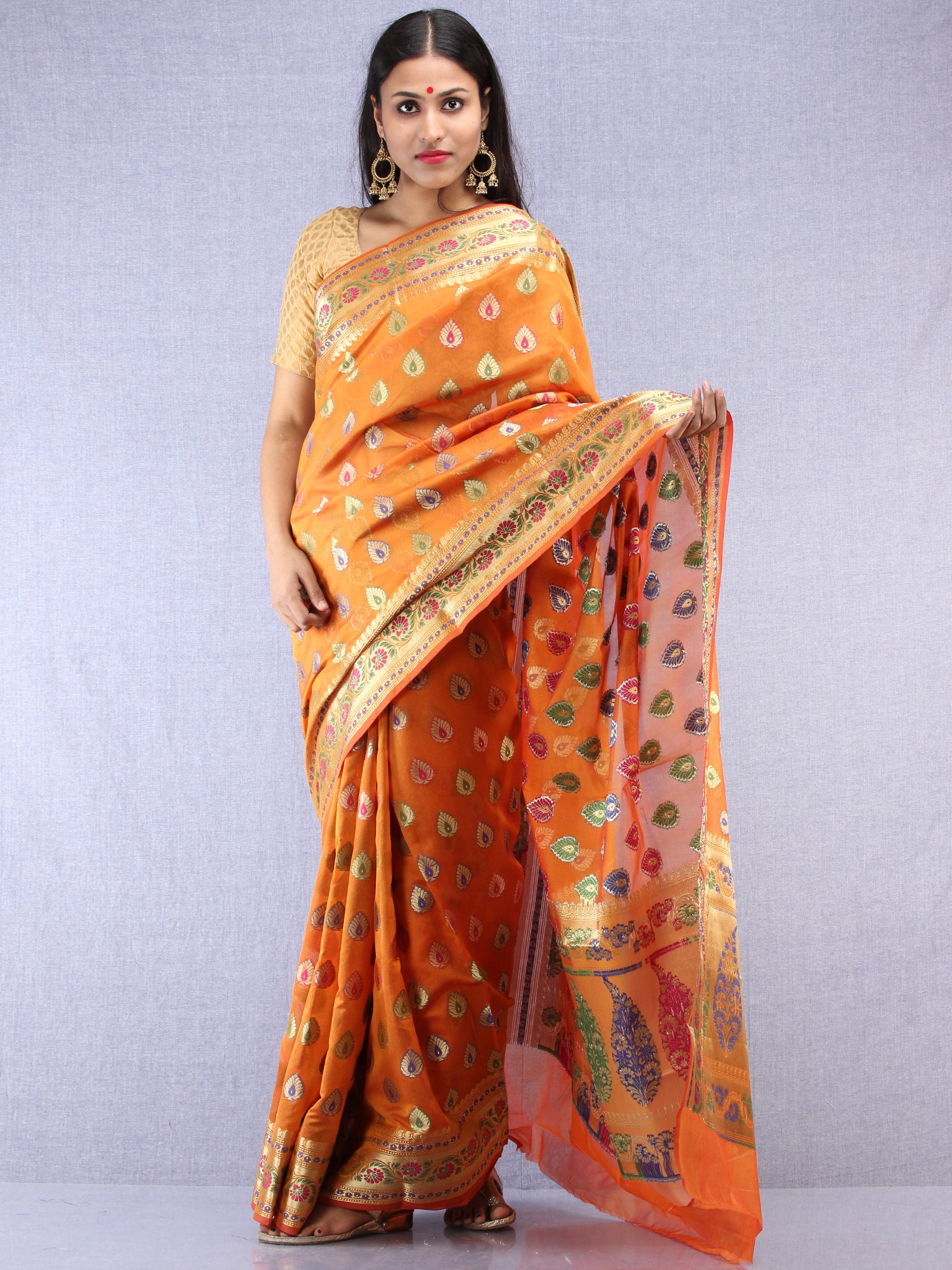 Banarasee Chanderi Saree With Meenakari Work - Orange & Gold - S031704423