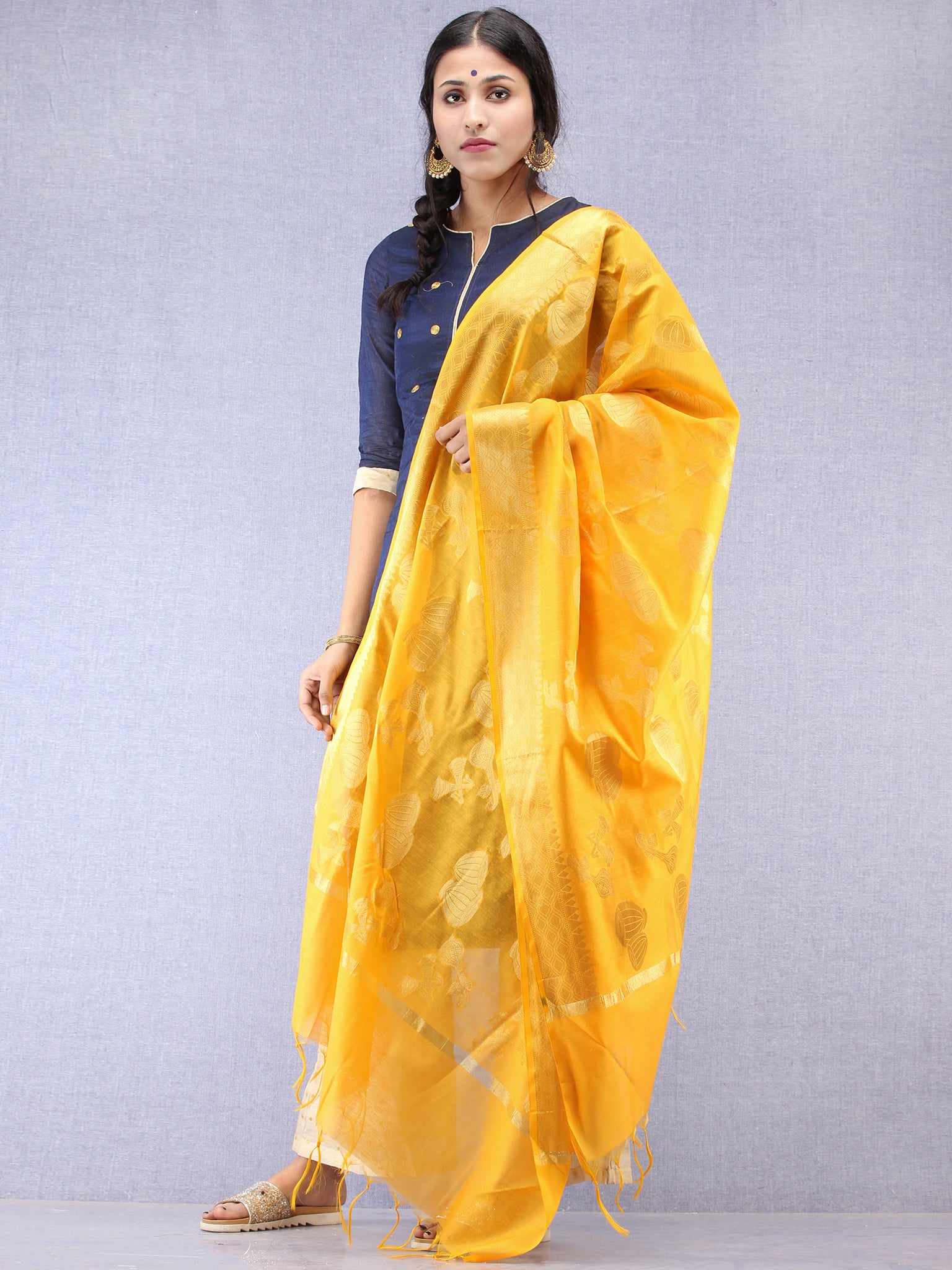 Banarasi Chanderi Dupatta With Zari Work - Bright Yellow & Gold - D04170806