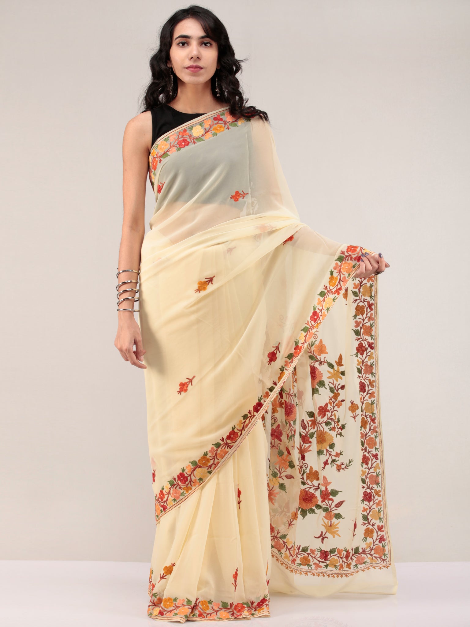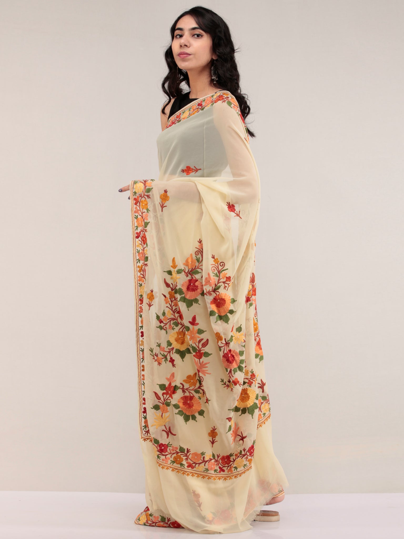 Beige Aari Embroidered Georgette Saree From Kashmir - S031704664