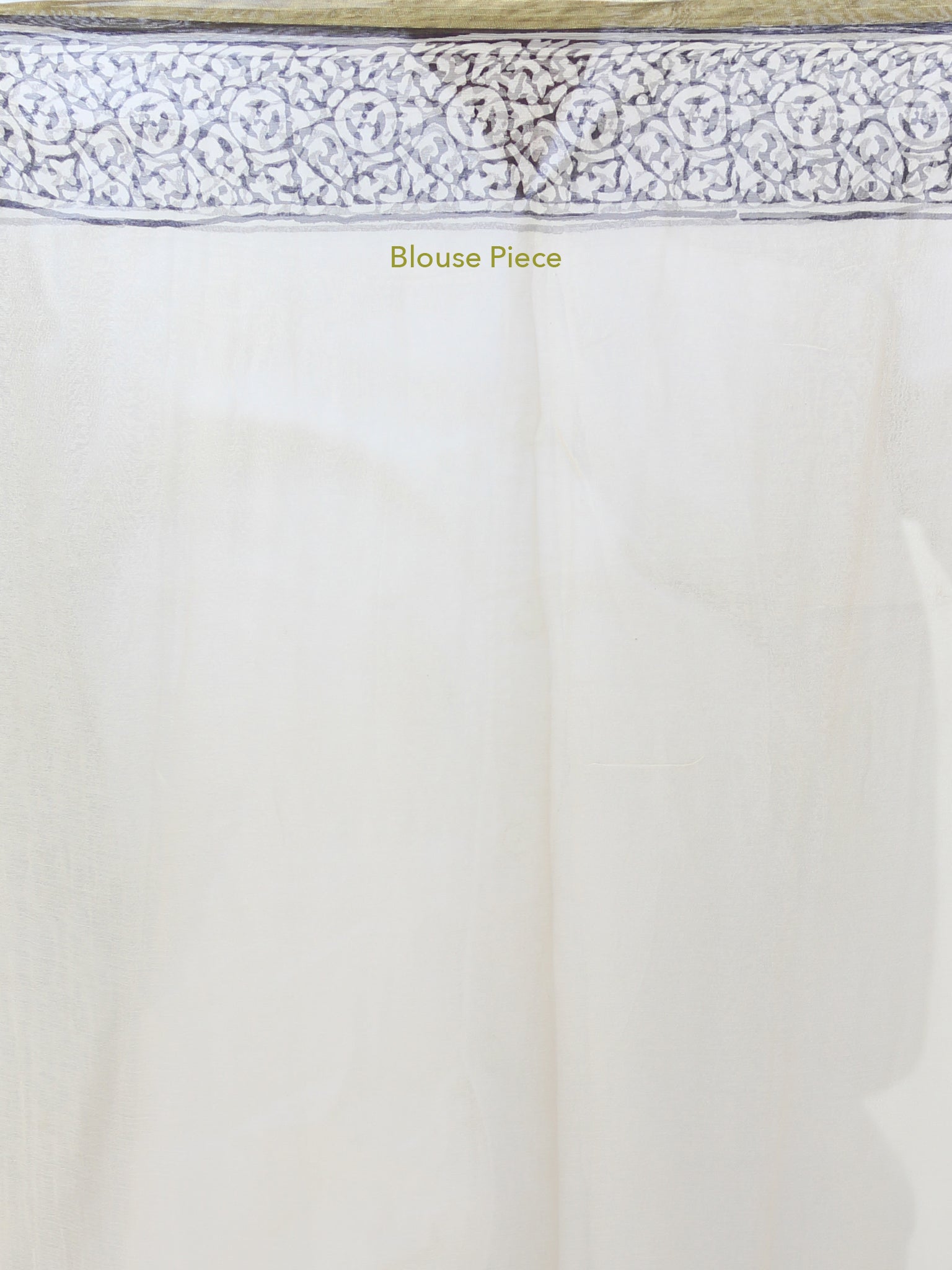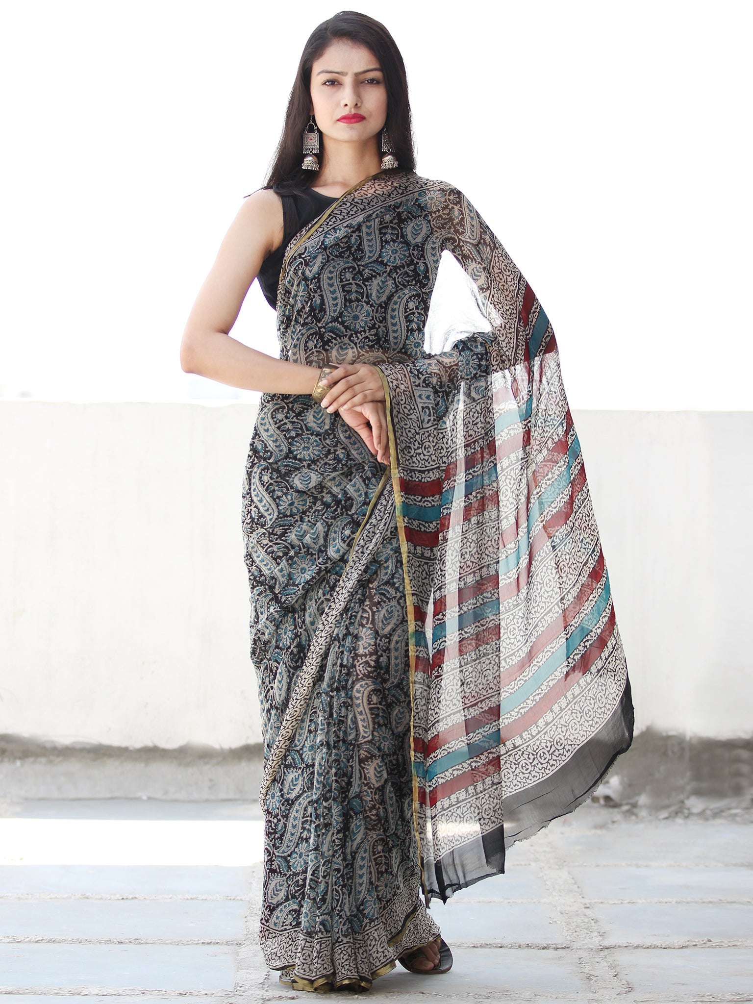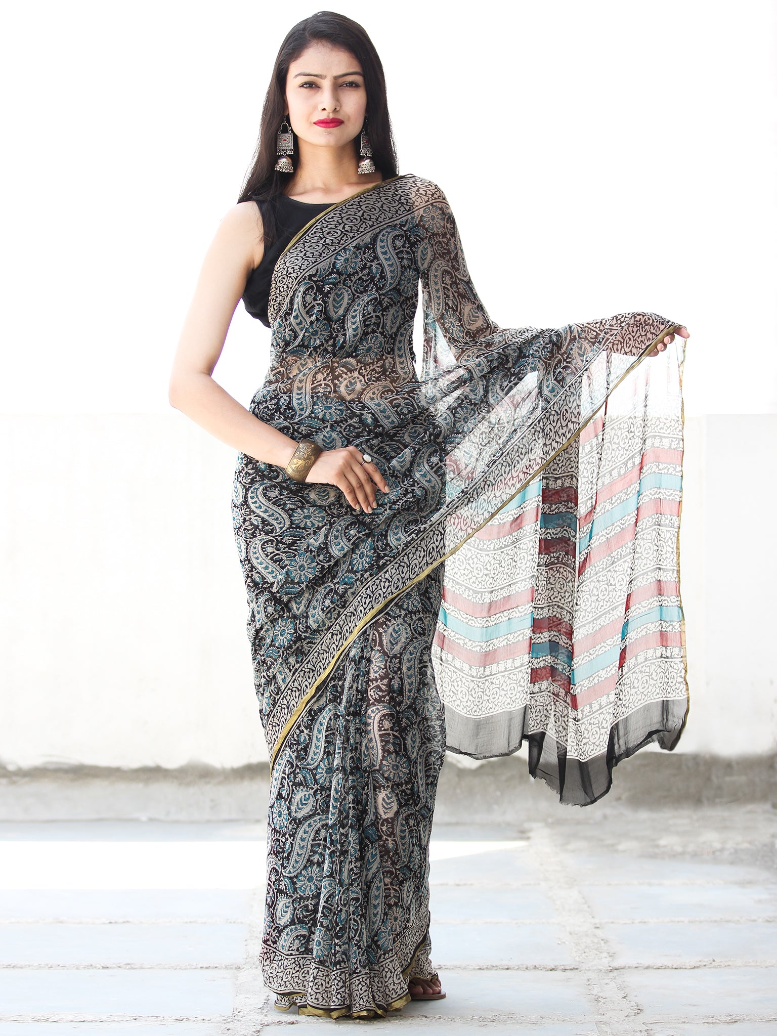 Beige Black Blue Hand Block Printed Chiffon Saree with Zari Border - S031703910