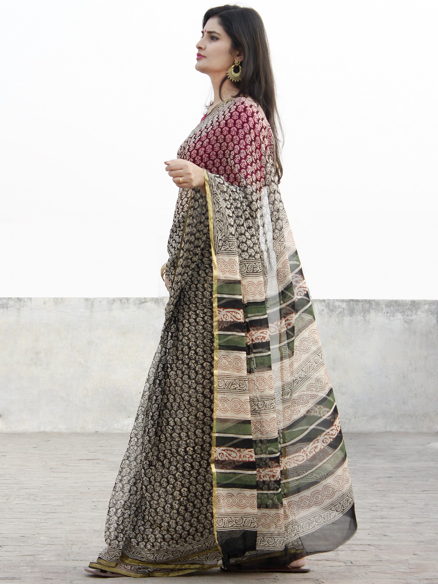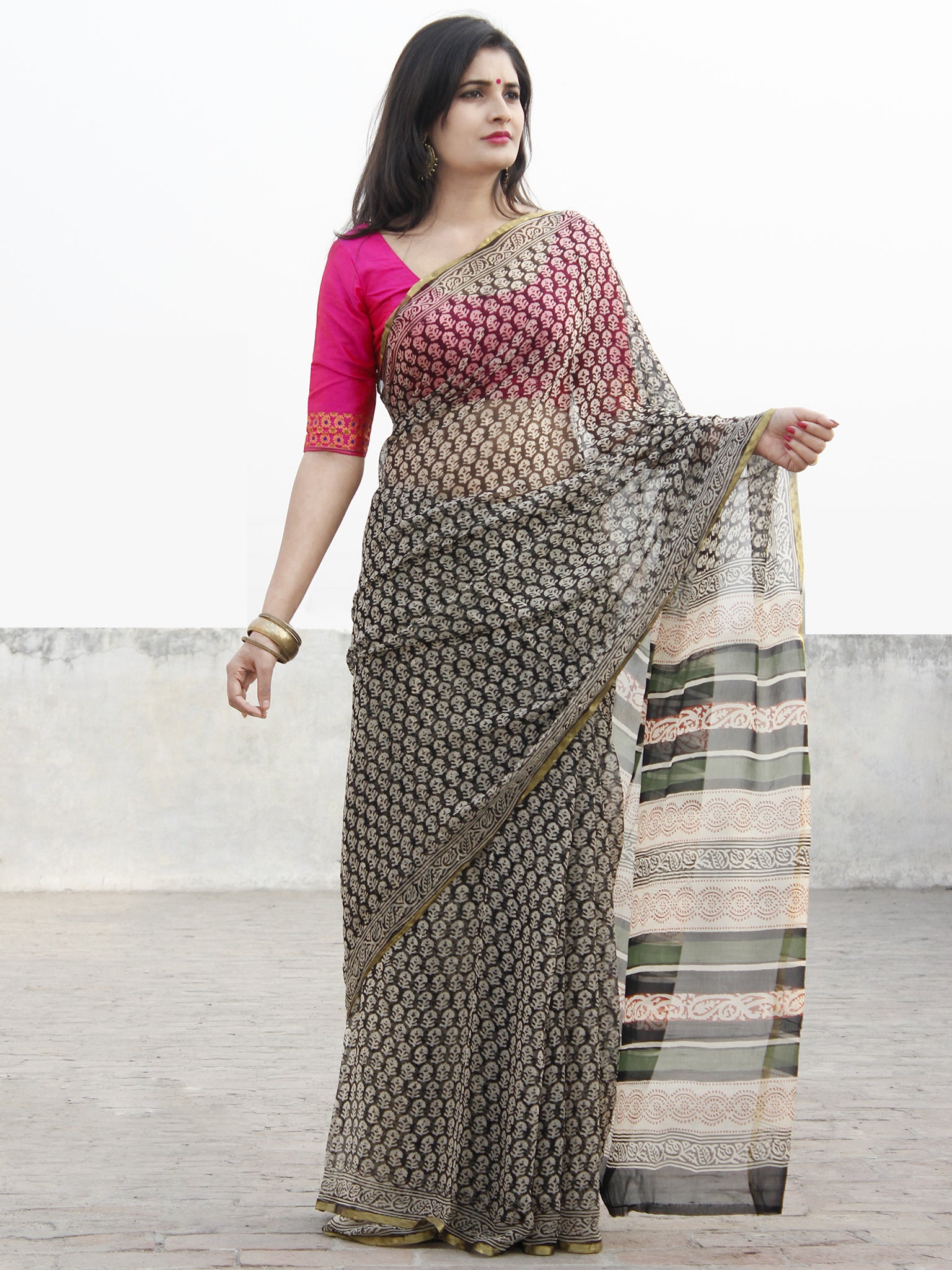 Beige Black Green Hand Block Printed Chiffon Saree - S031702572