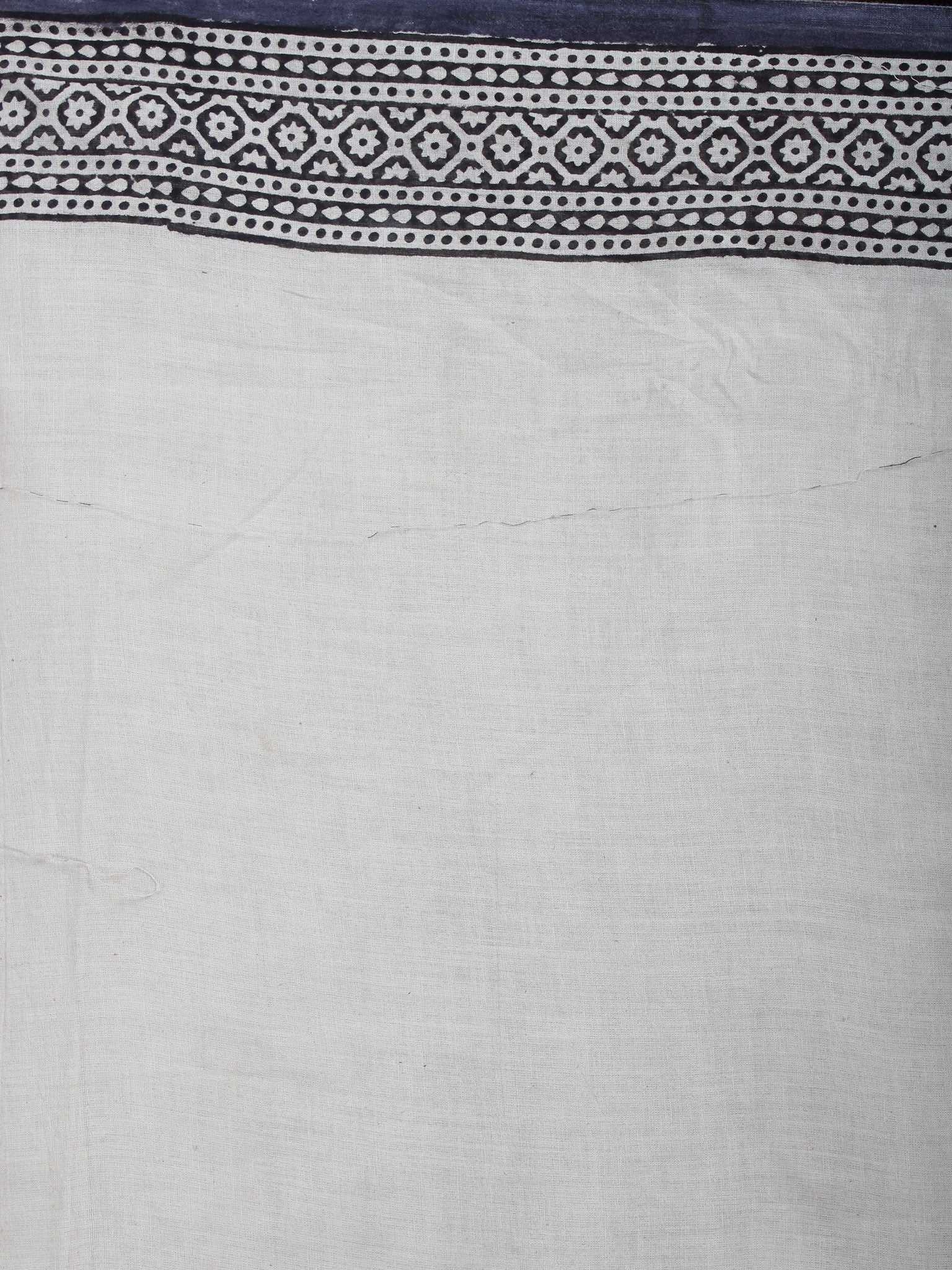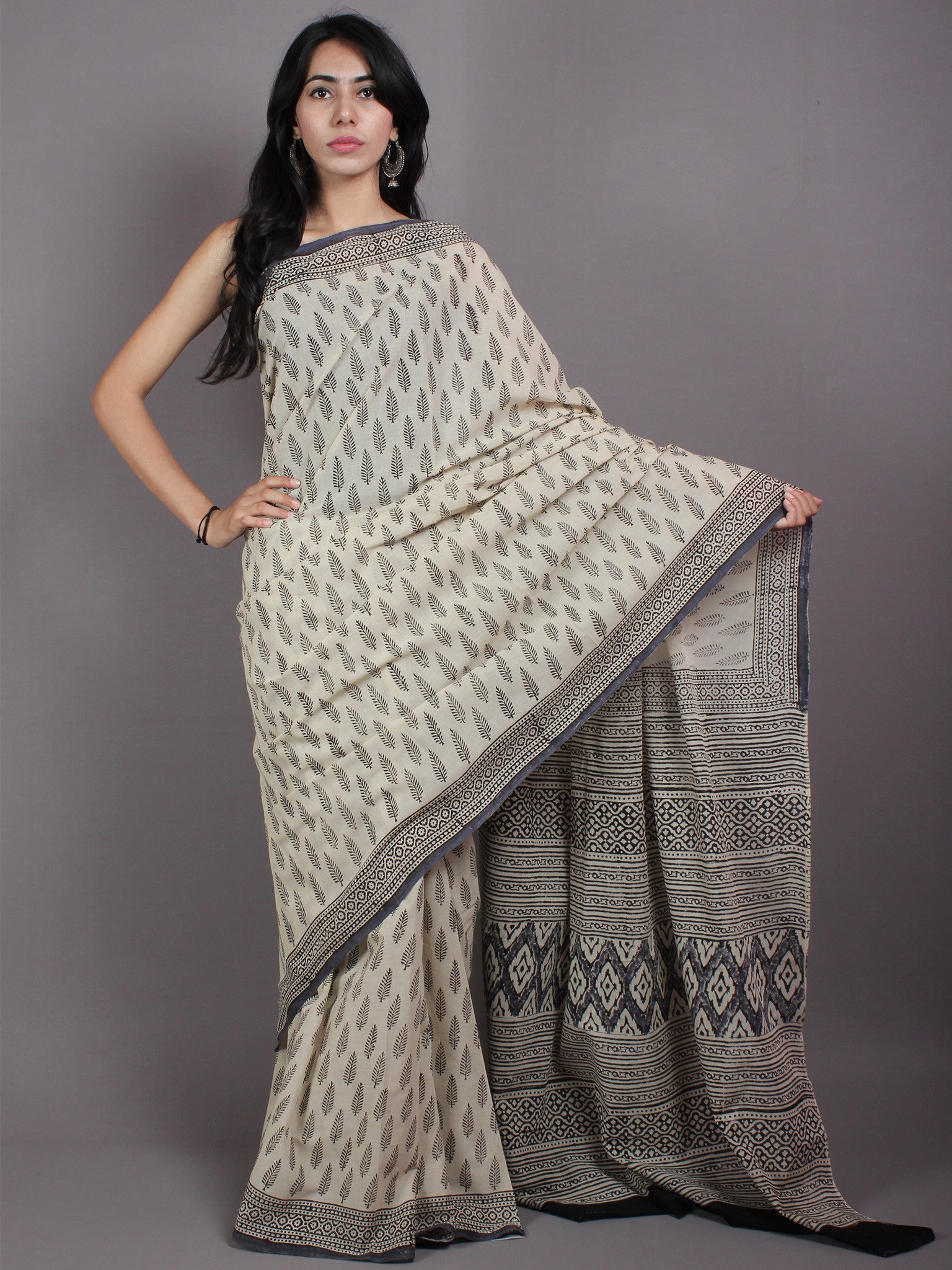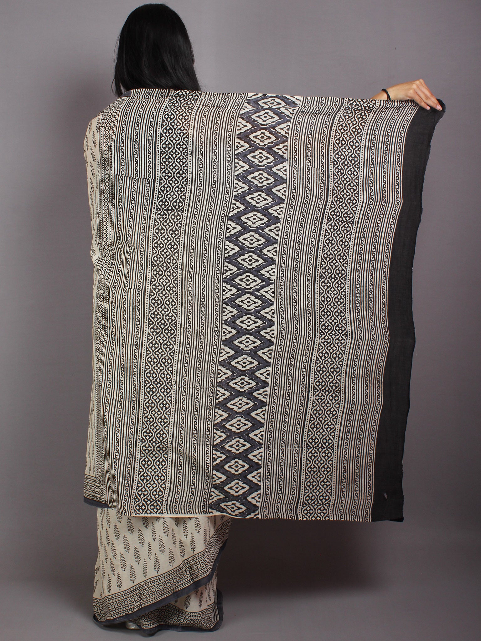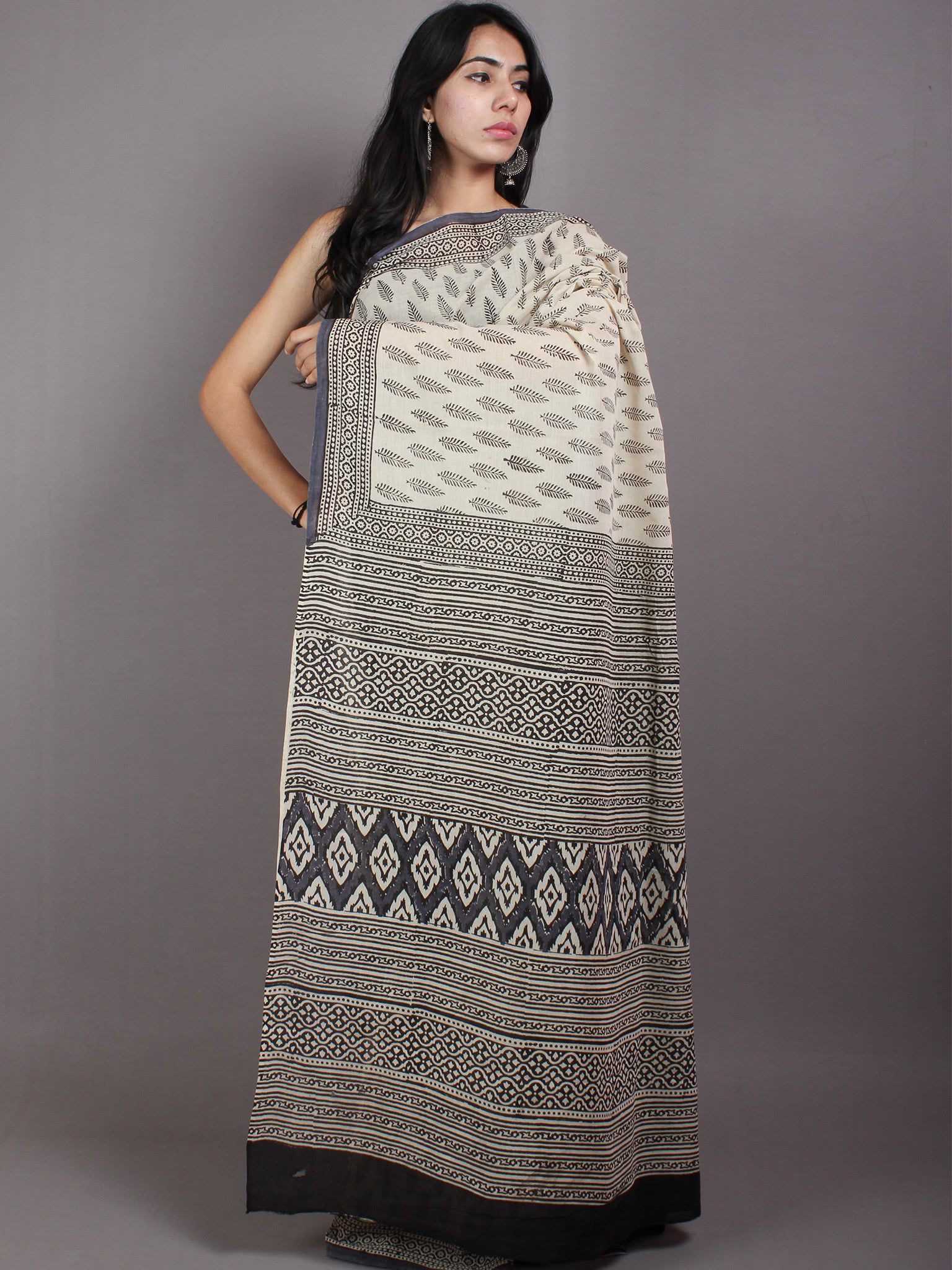 Beige Black Grey Hand Block Printed Cotton Saree in Natural Colors - S03170571
