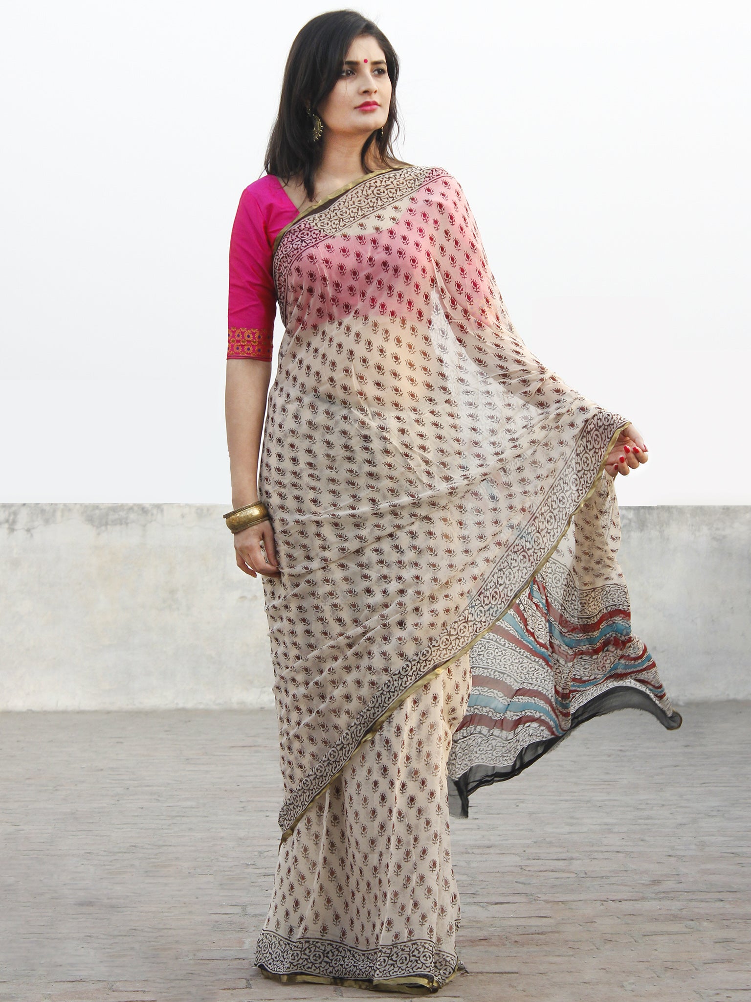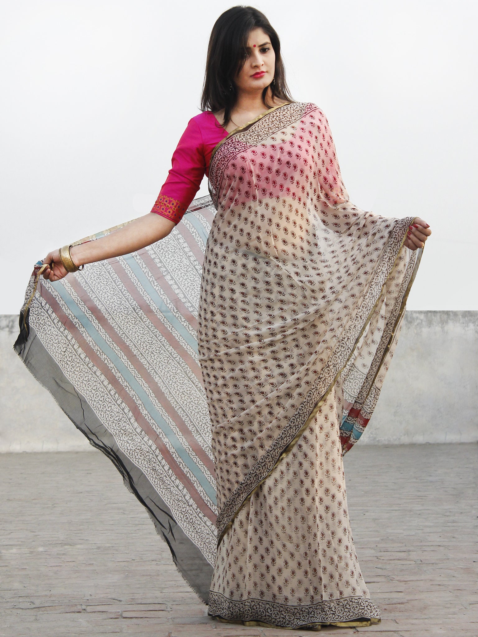 Beige Black Hand Block Printed Chiffon Saree With Zari Border- S031702575