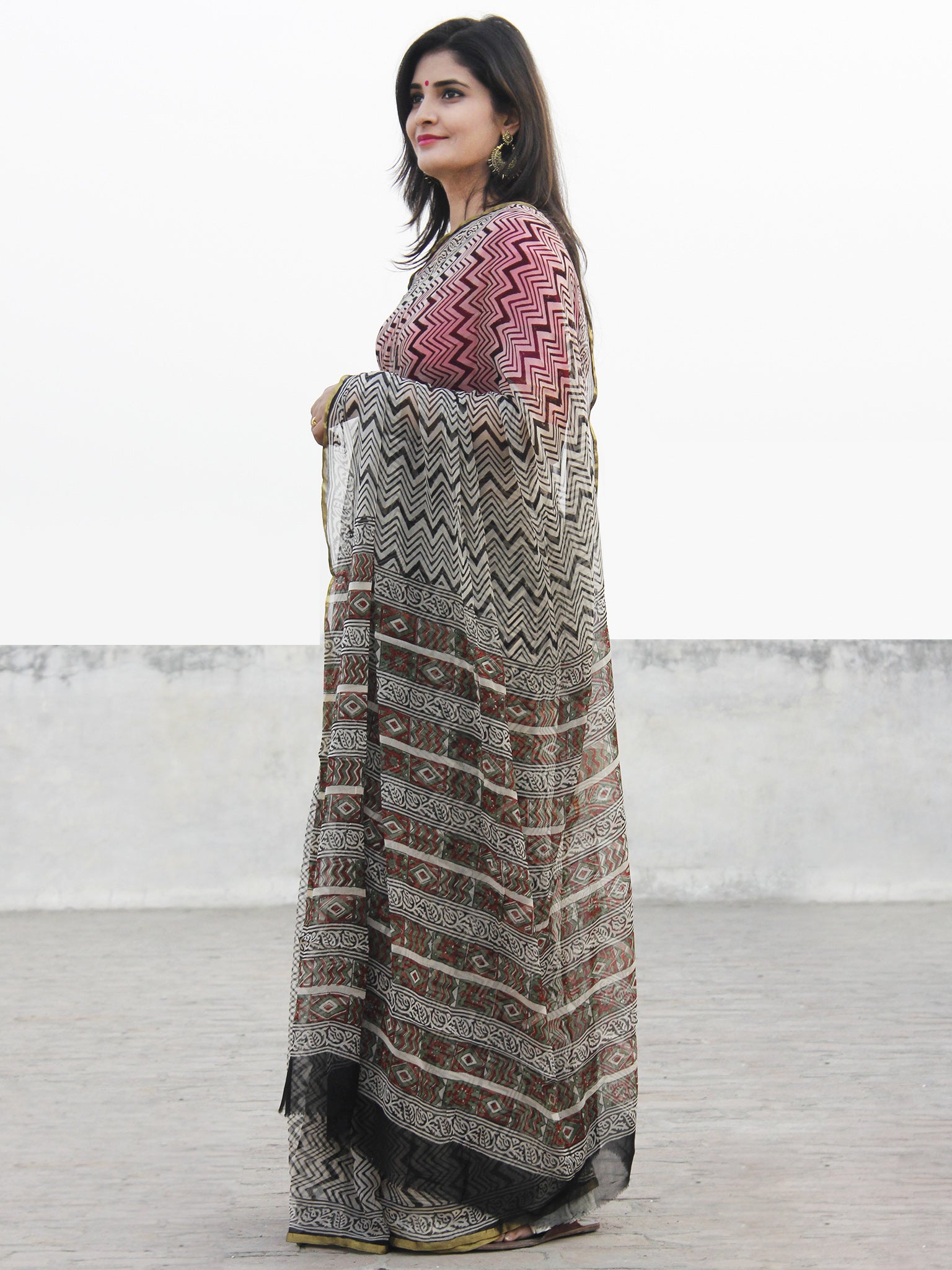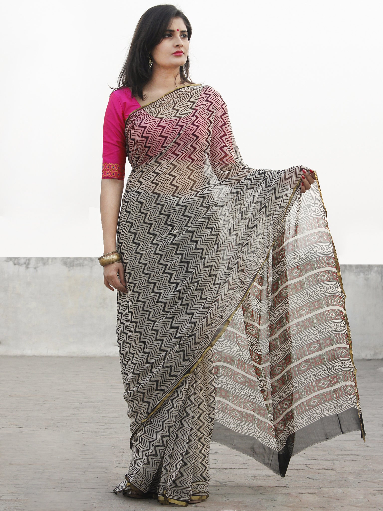 Beige Black Hand Block Printed Chiffon Saree With Zari Border- S031702577