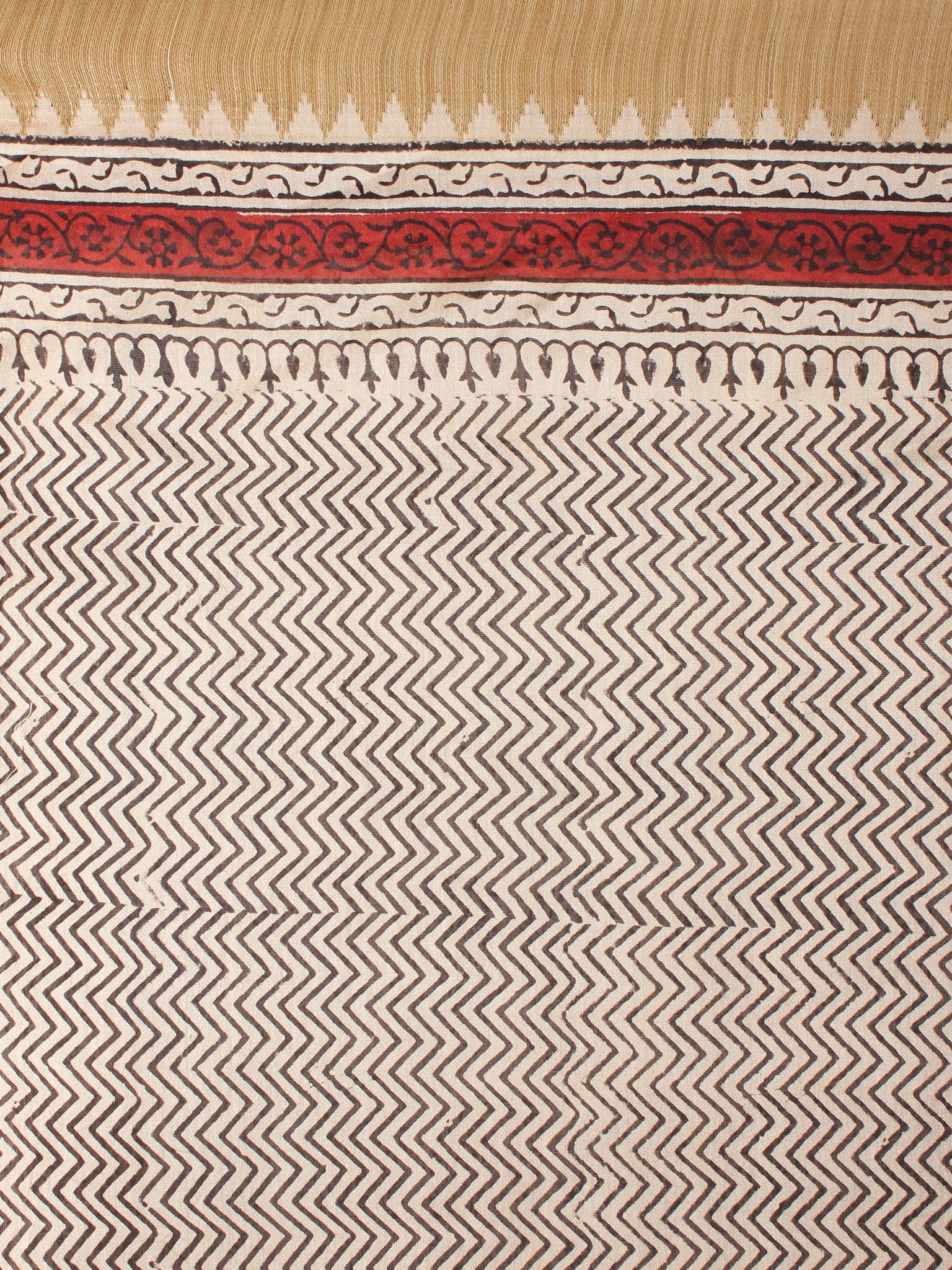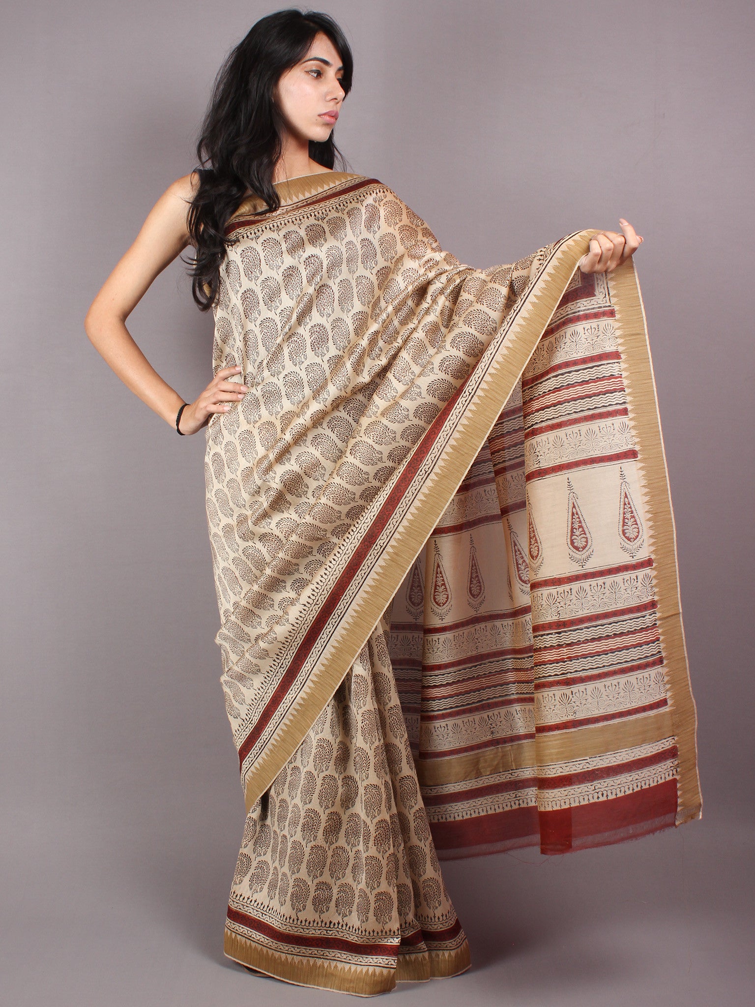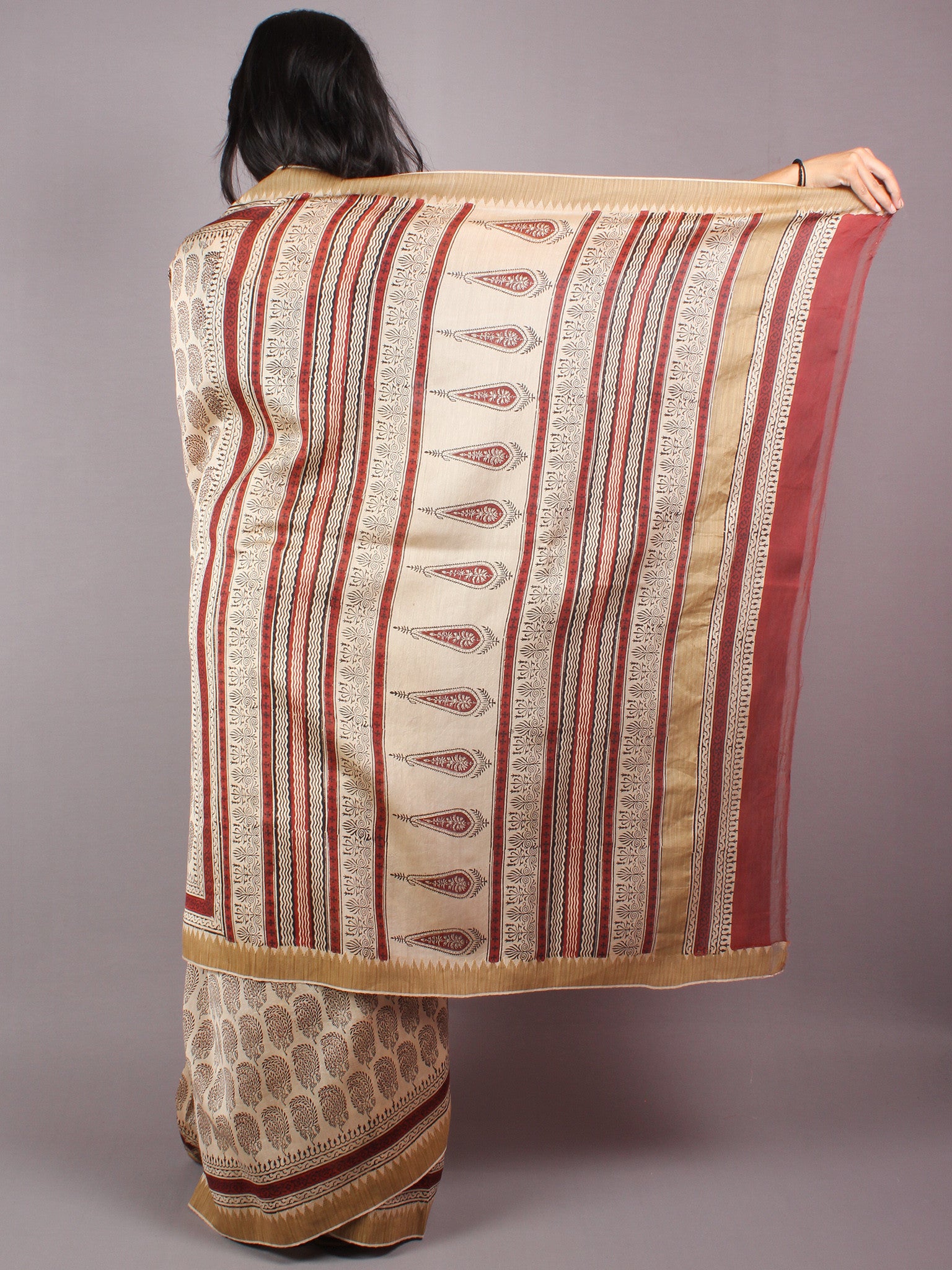 Beige Red Bagru Hand Block Printed Chanderi Saree With Geecha Border - S03170300