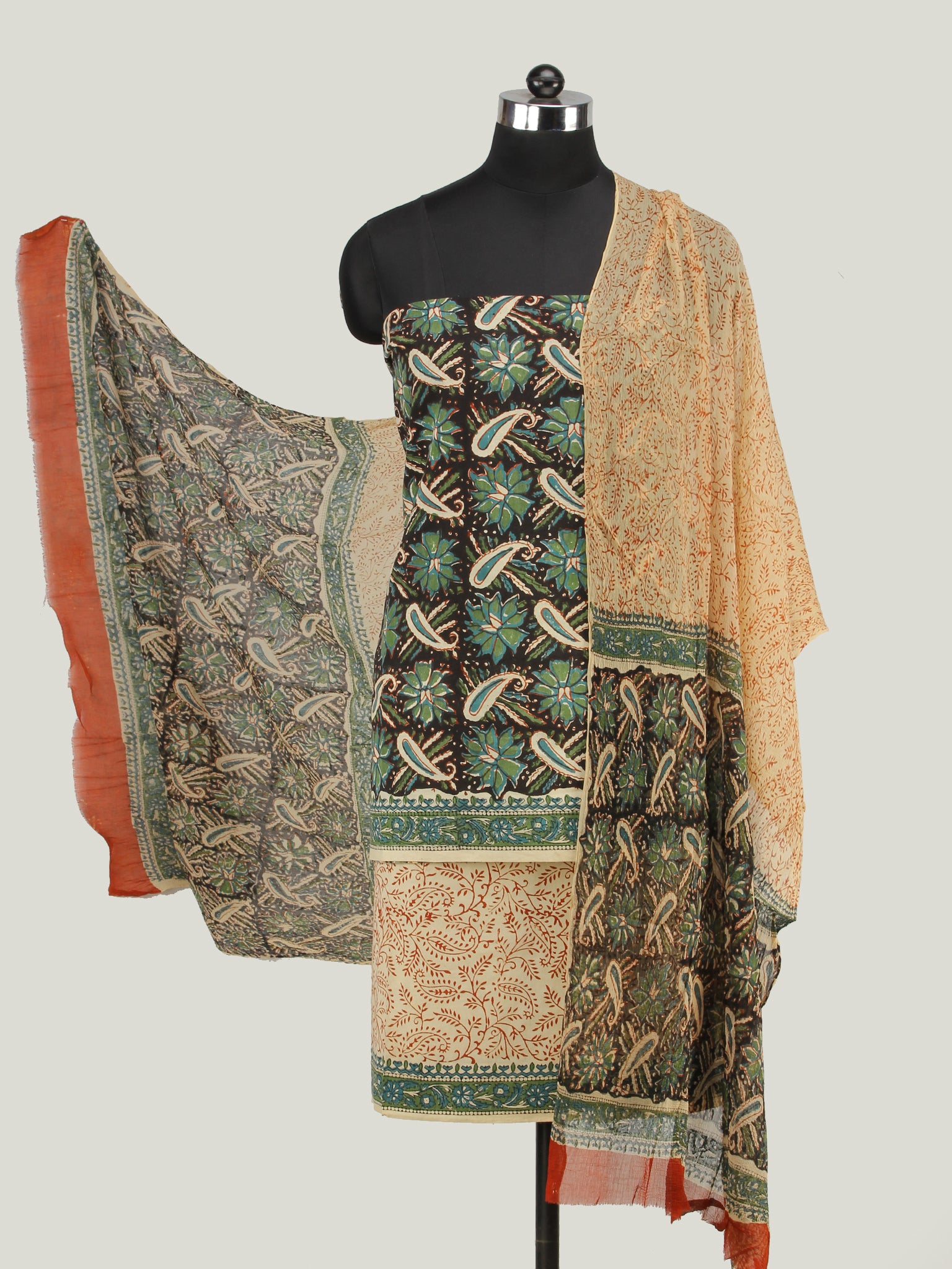 PRODUCT: Fabric is Hand Block printed & dyed in natural vegetable colors by Artisans in Bagru, Rajasthan. Set of three. Cotton Suit/Kurta & Salwar & Chiffon Dupatta