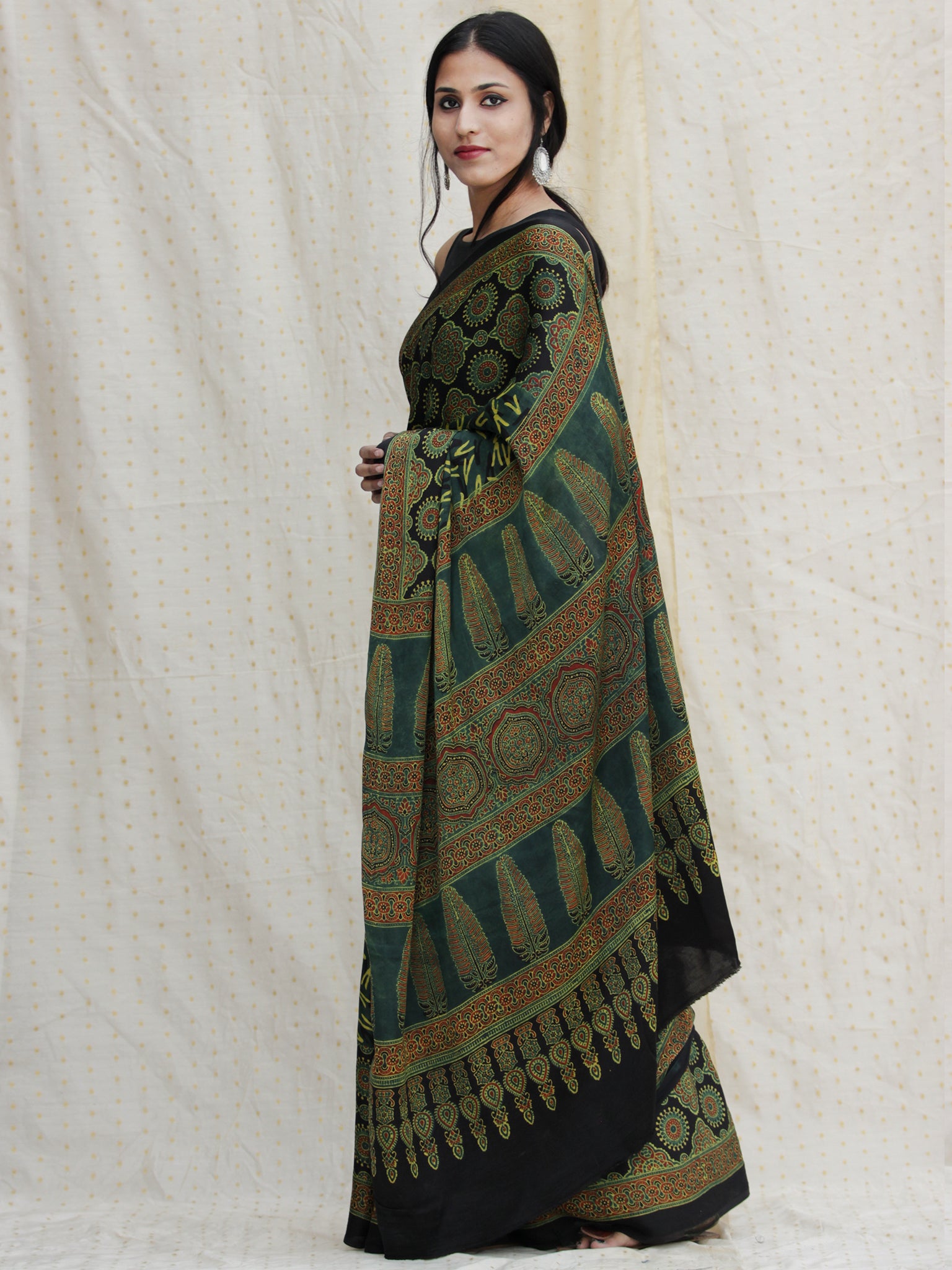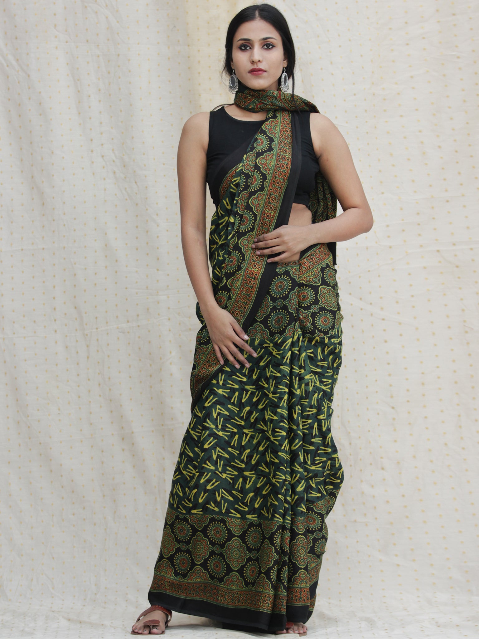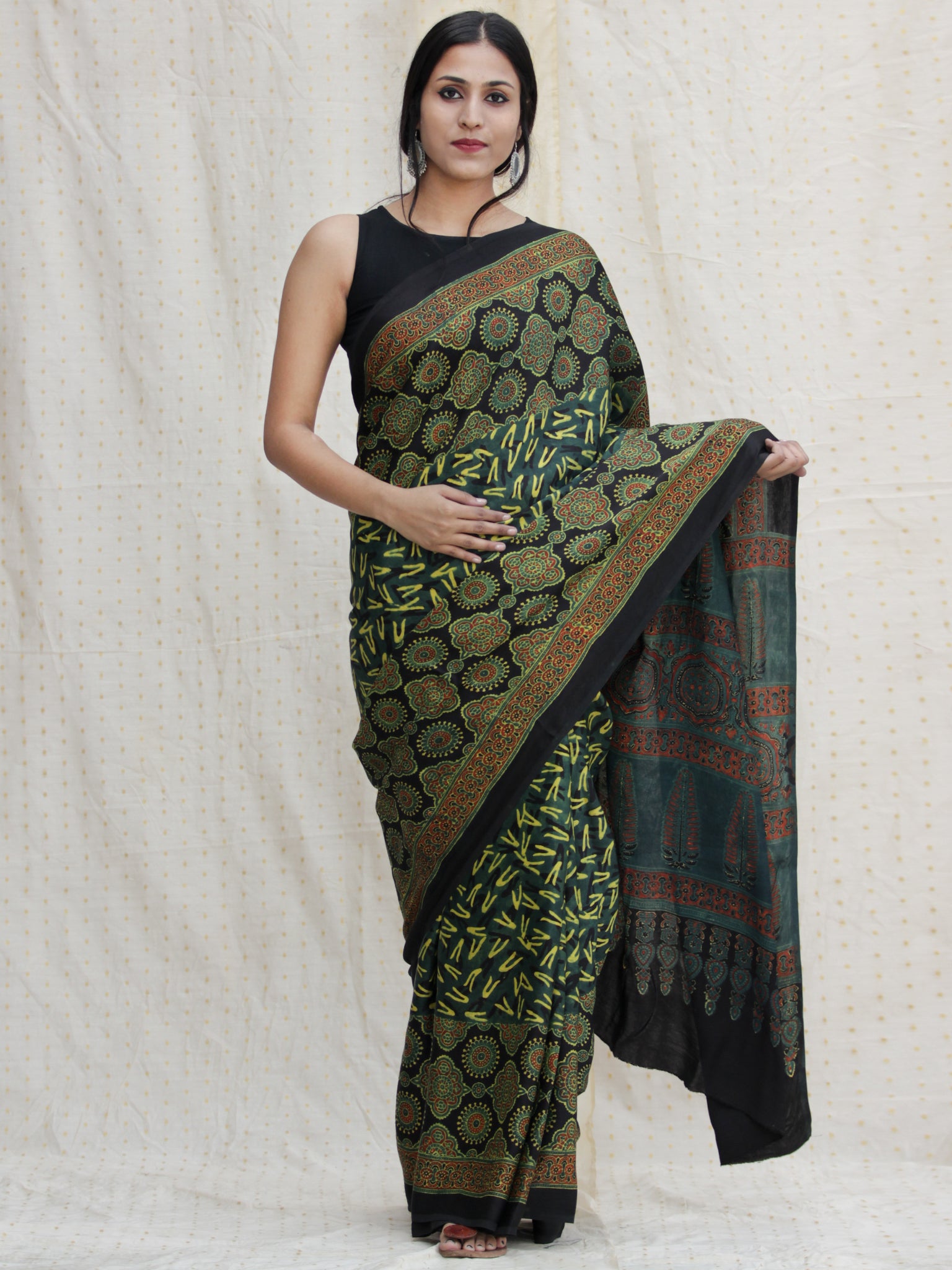 Black Green Red Ajrakh Hand Block Printed Modal Silk Saree - S031704136