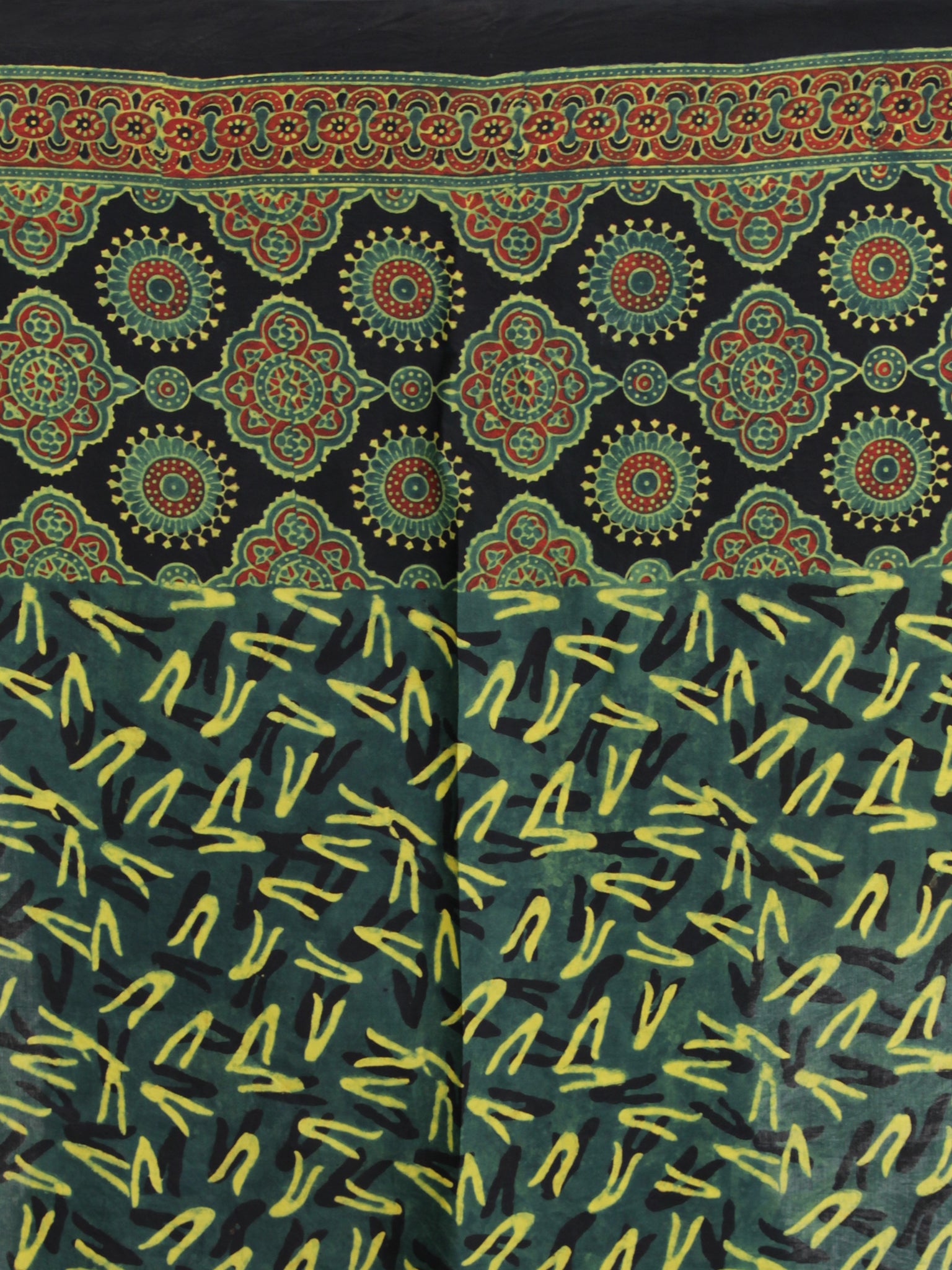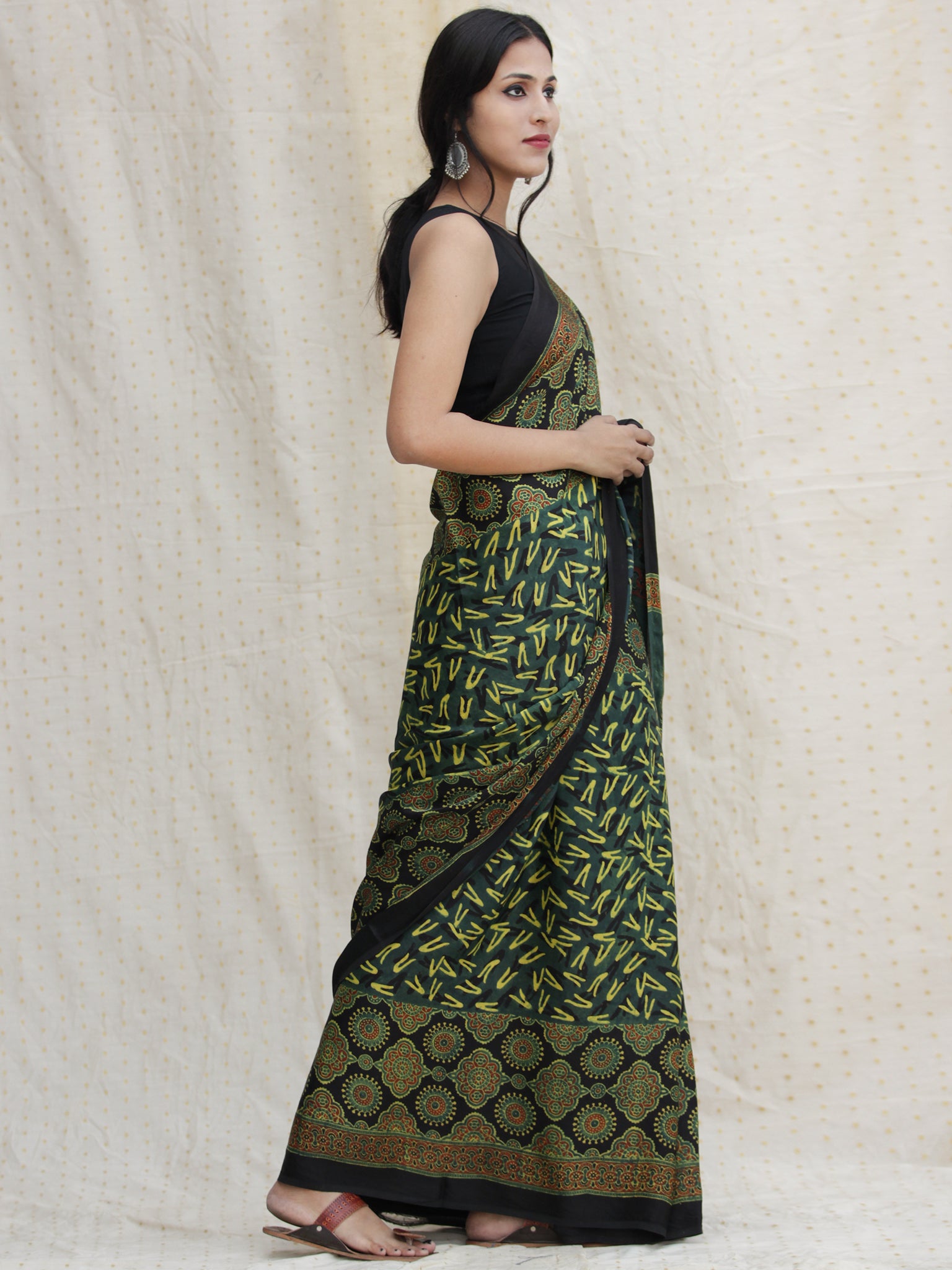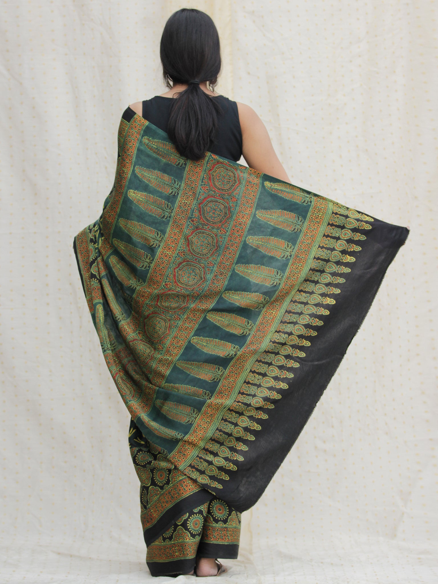Black Green Red Ajrakh Hand Block Printed Modal Silk Saree - S031704136