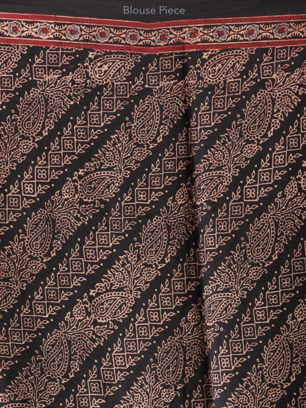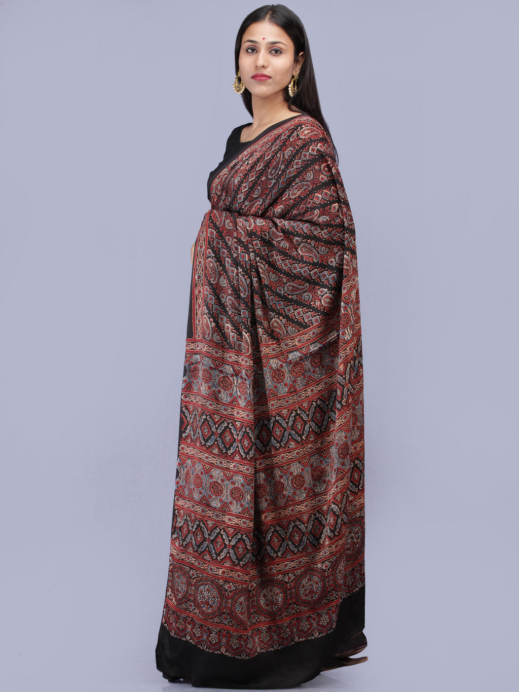 Black Maroon Indigo Ajrakh Hand Block Printed Modal Silk Saree - S031704223