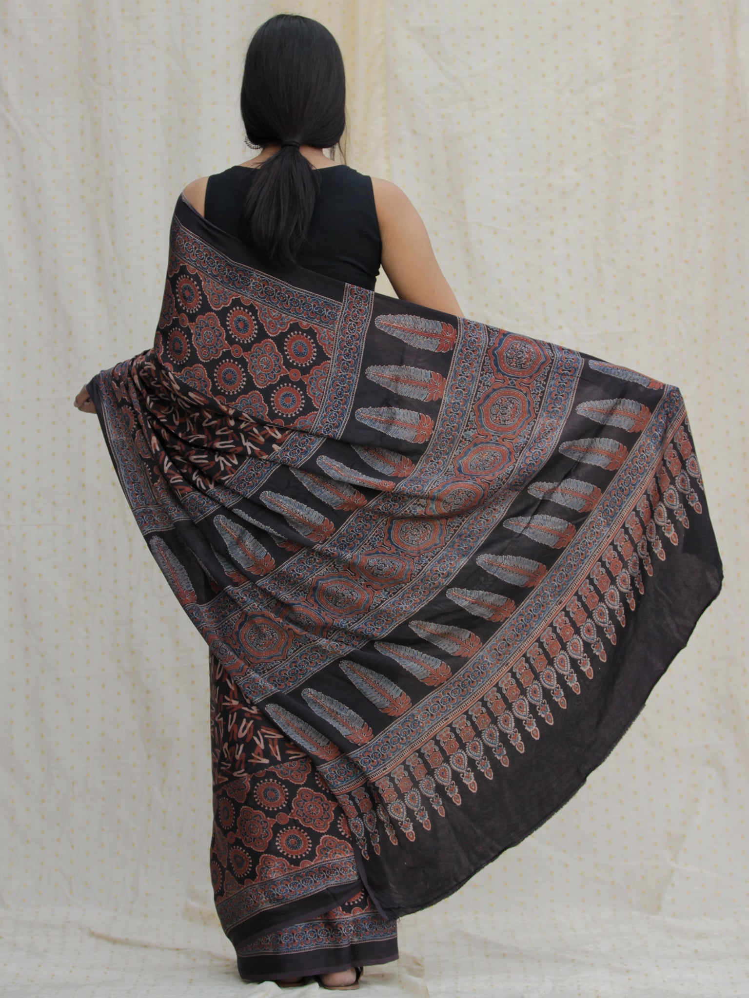Black Red Ivory Indigo Ajrakh Hand Block Printed Modal Silk Saree - S031704133