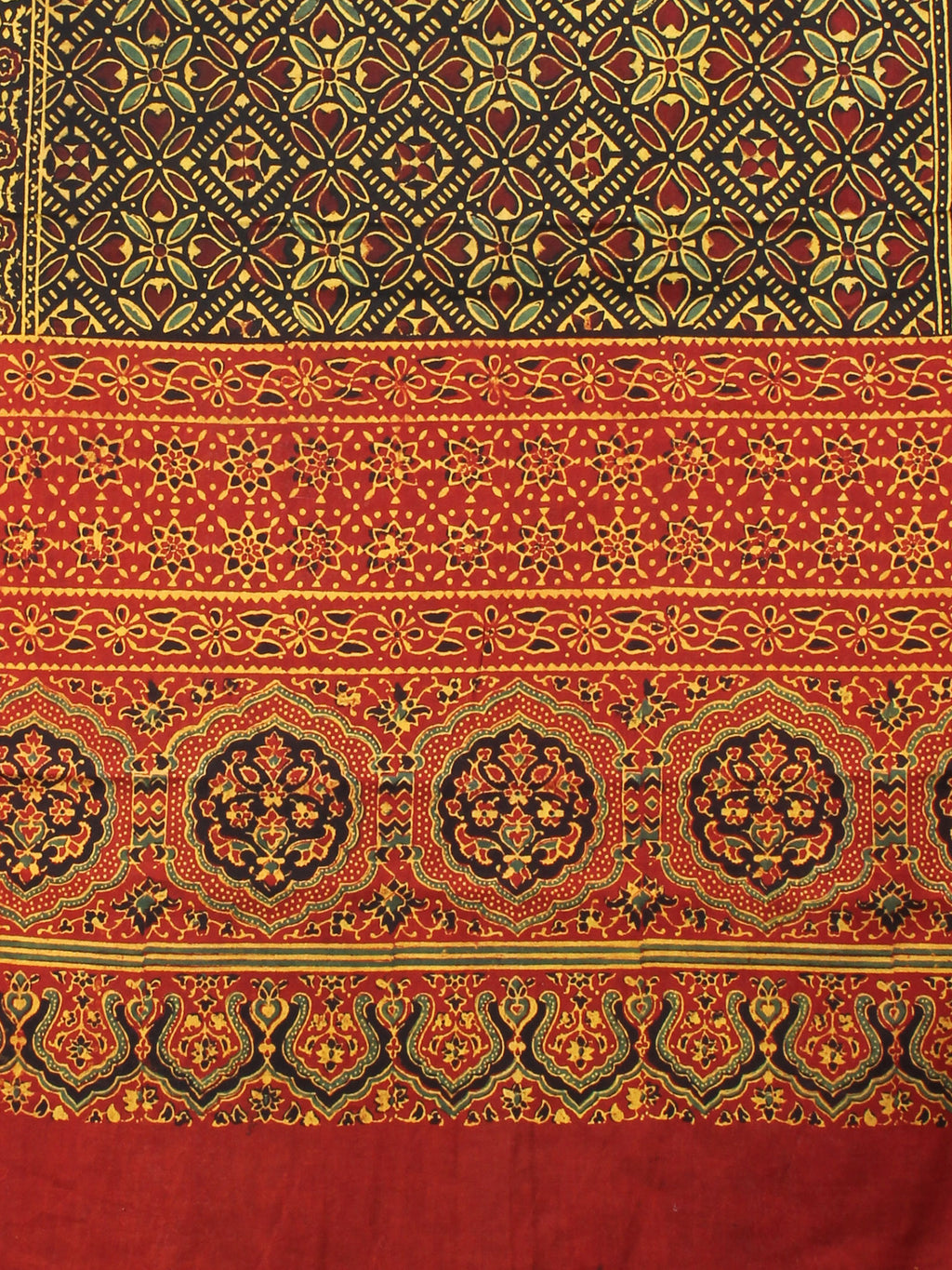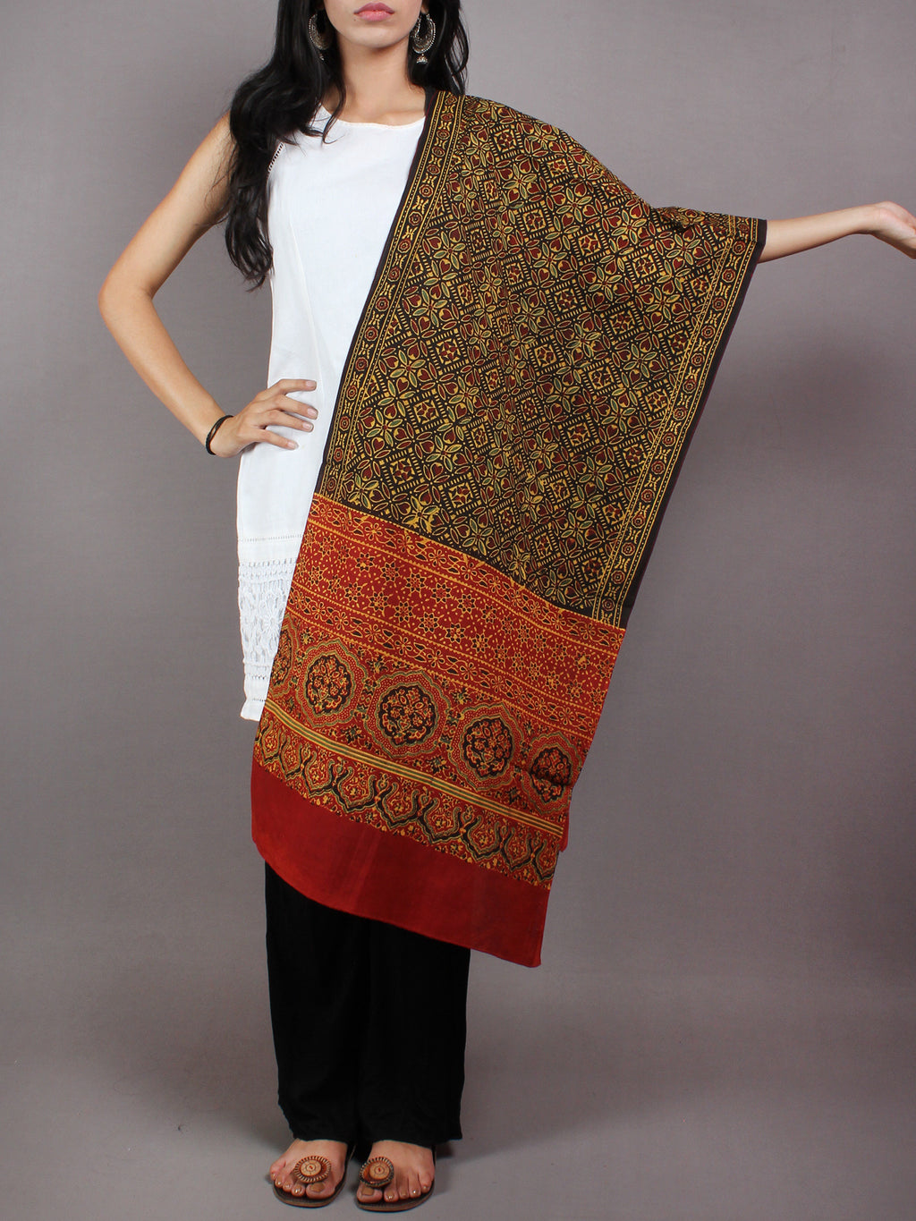 Black Red Maroon Yellow Mughal Nakashi Ajrakh Hand Block Printed Cotton Stole - S6317069