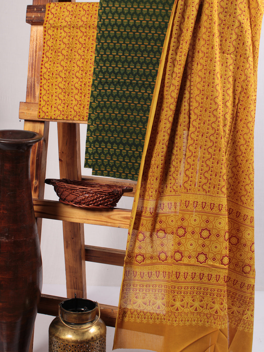 Bottle Green Mustard Red Hand Block Printed Suit Set (Set of 3) - SU01HB477