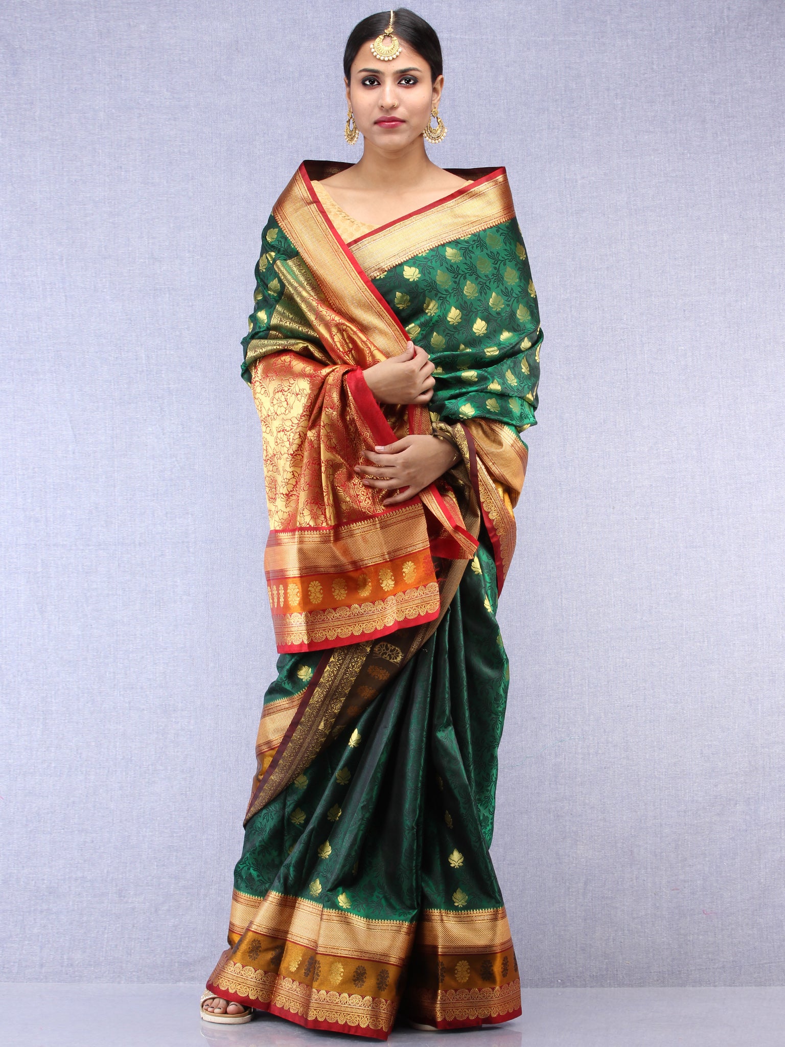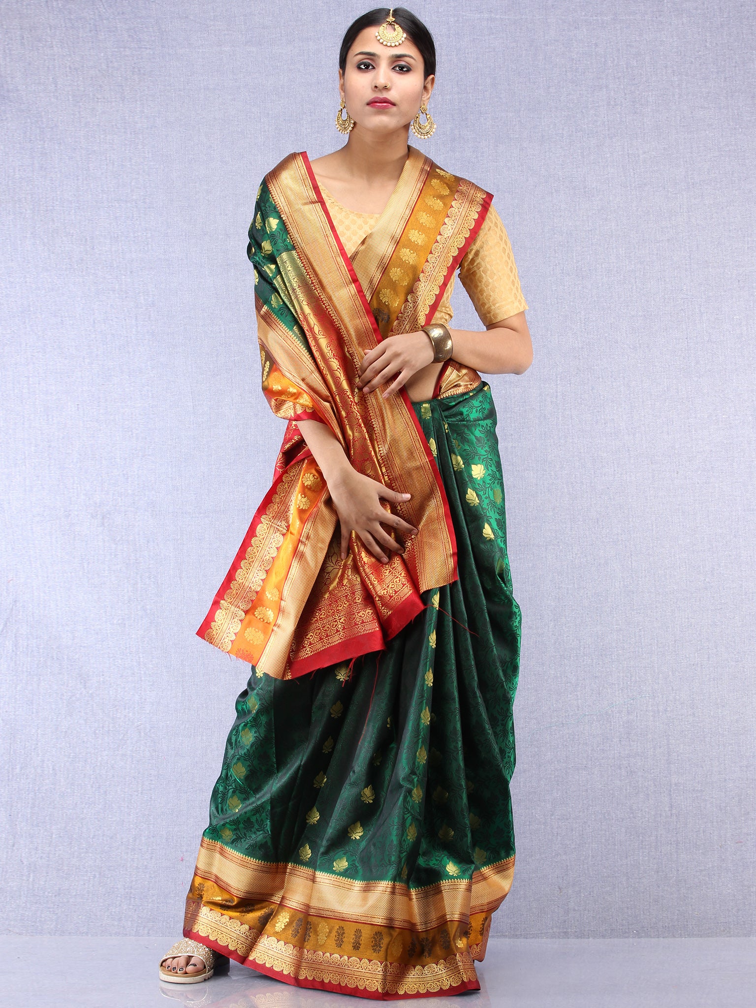 Banarasee Art Silk Saree With Resham Zari Weave - Bottle Green Maroon & Gold - S031704385