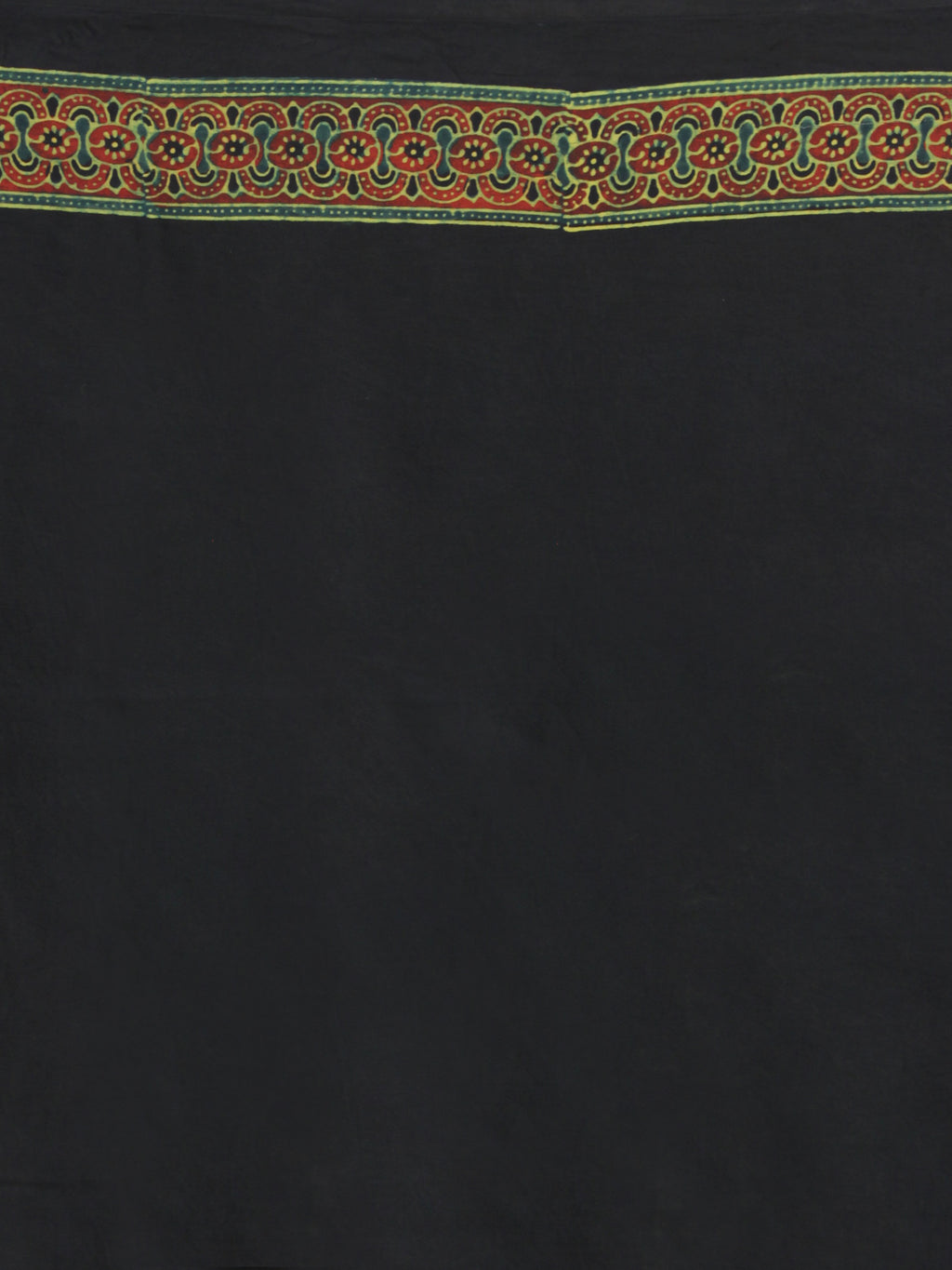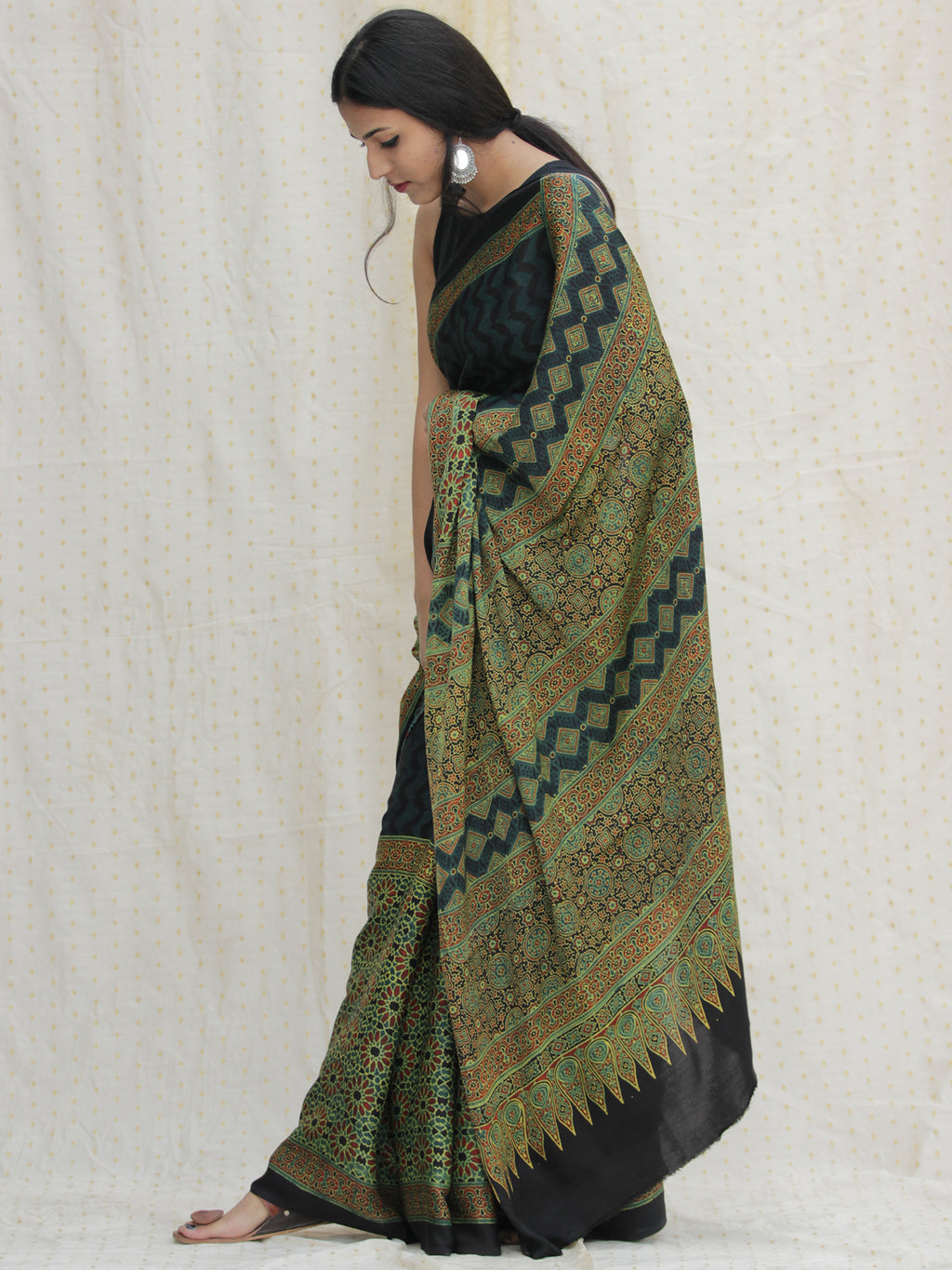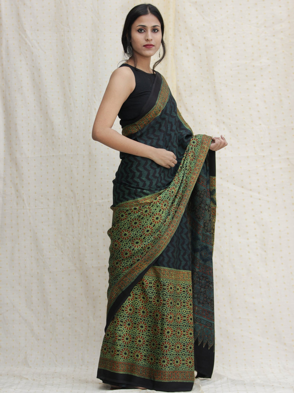 Bottle & Lime Green Black  Ajrakh Hand Block Printed Modal Silk Saree - S031704126
