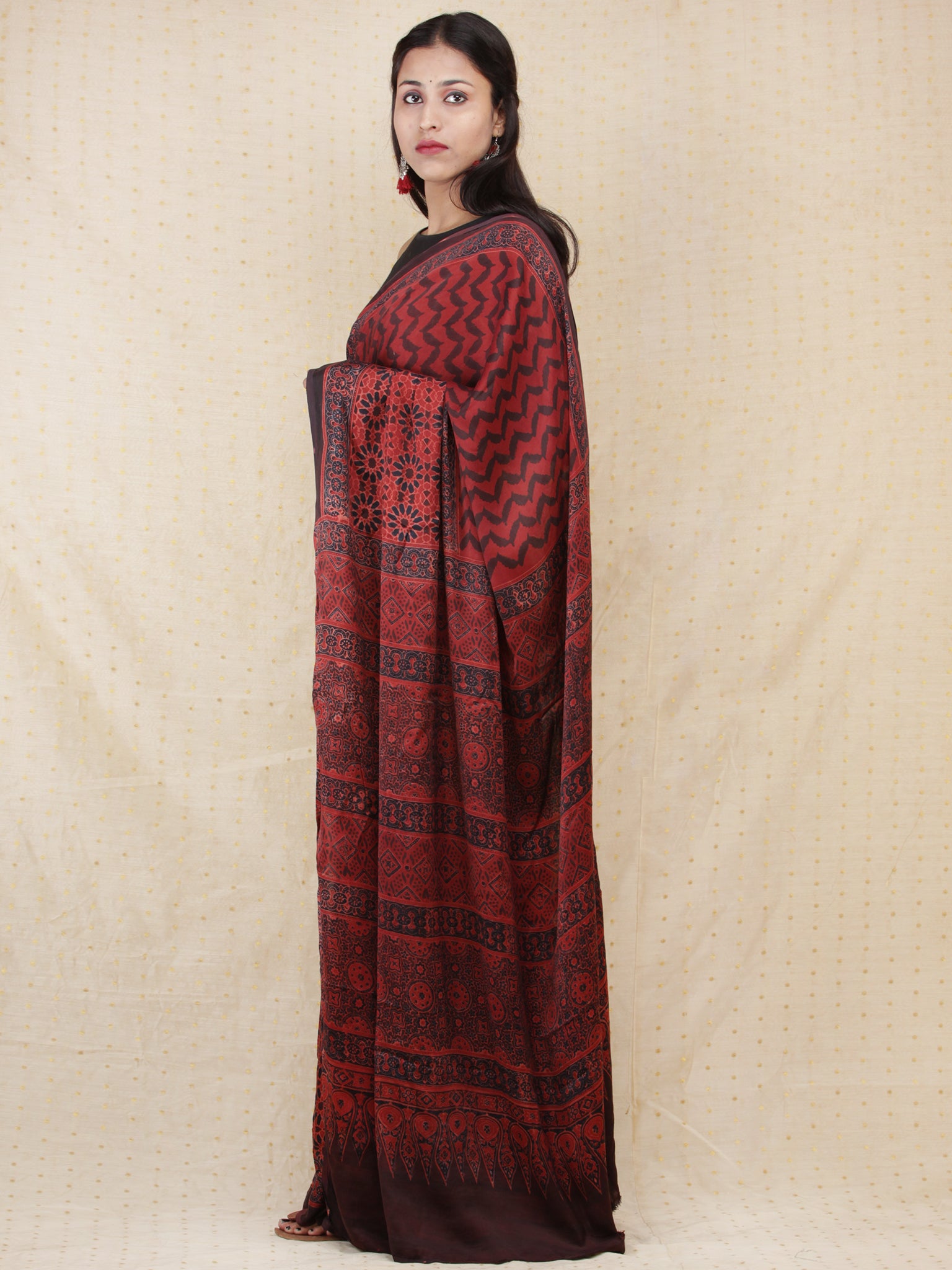 Crimson Red Black Ajrakh Hand Block Printed Modal Silk Saree - S031704155