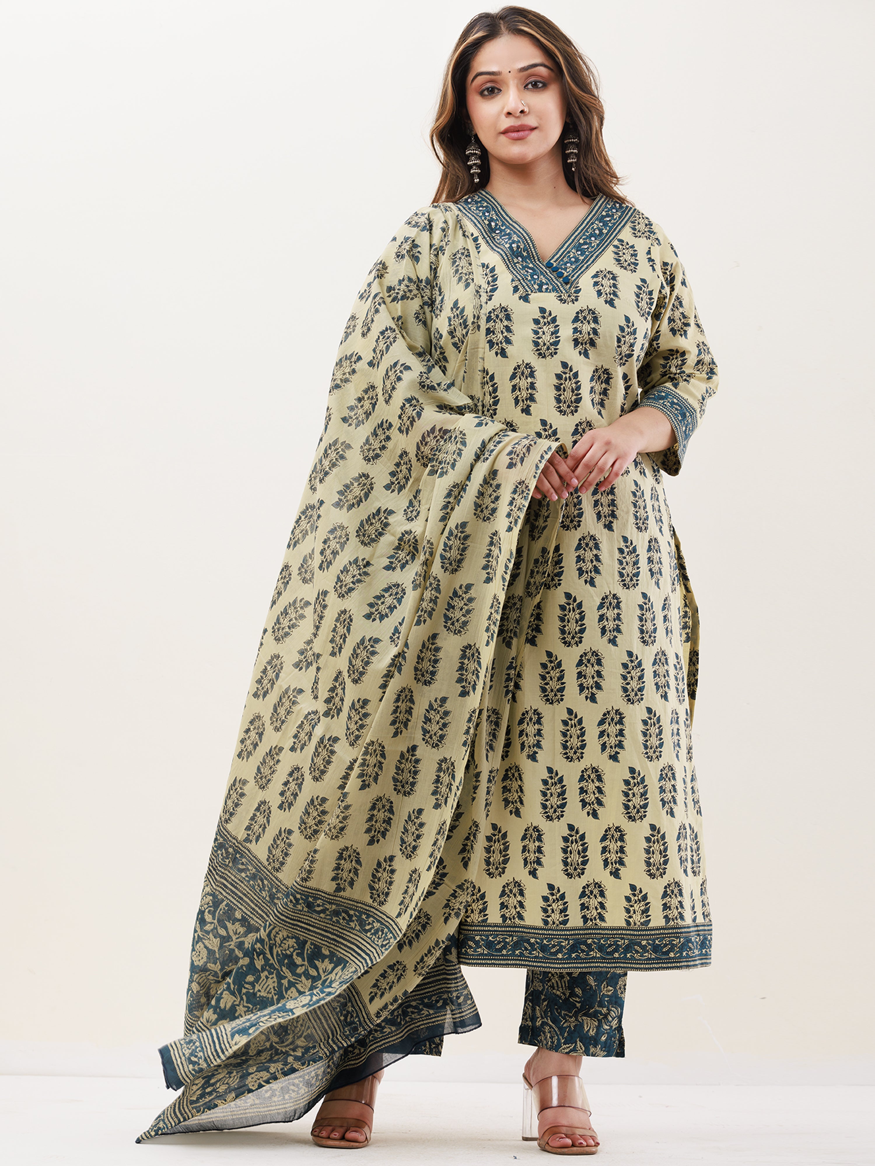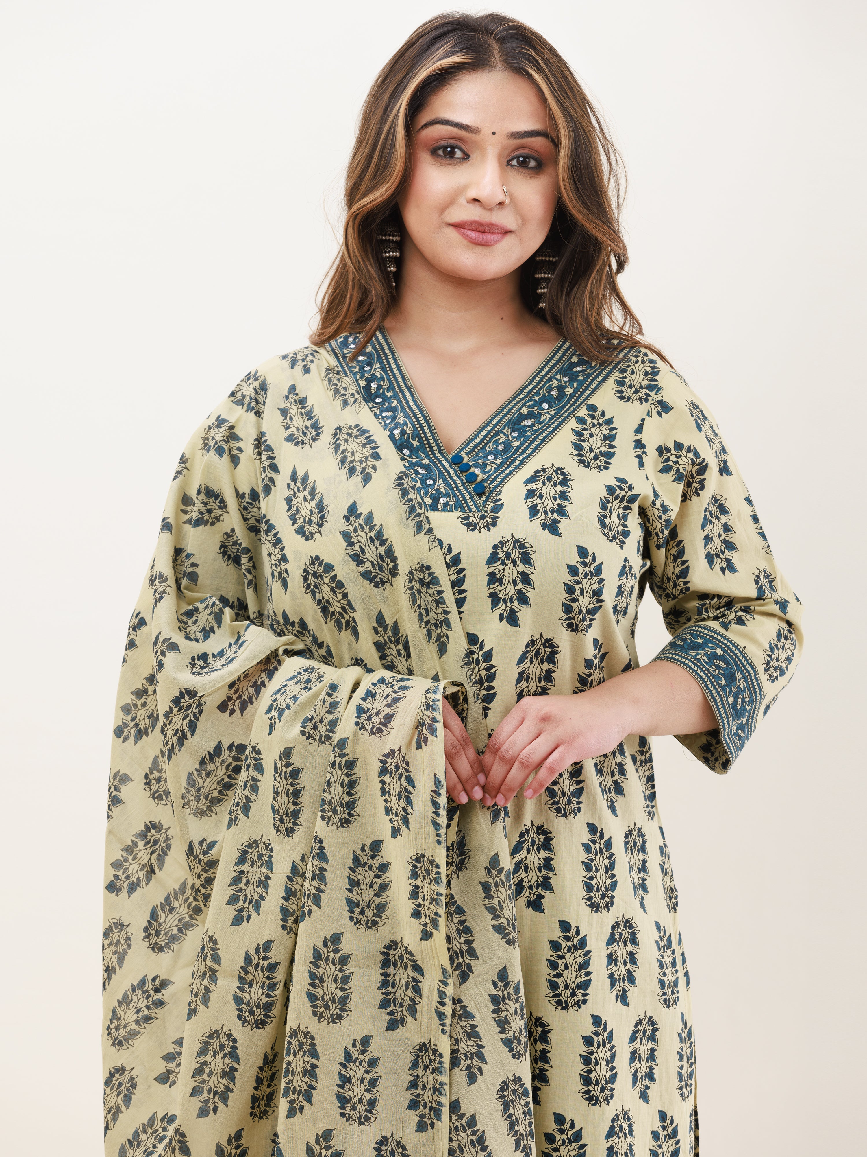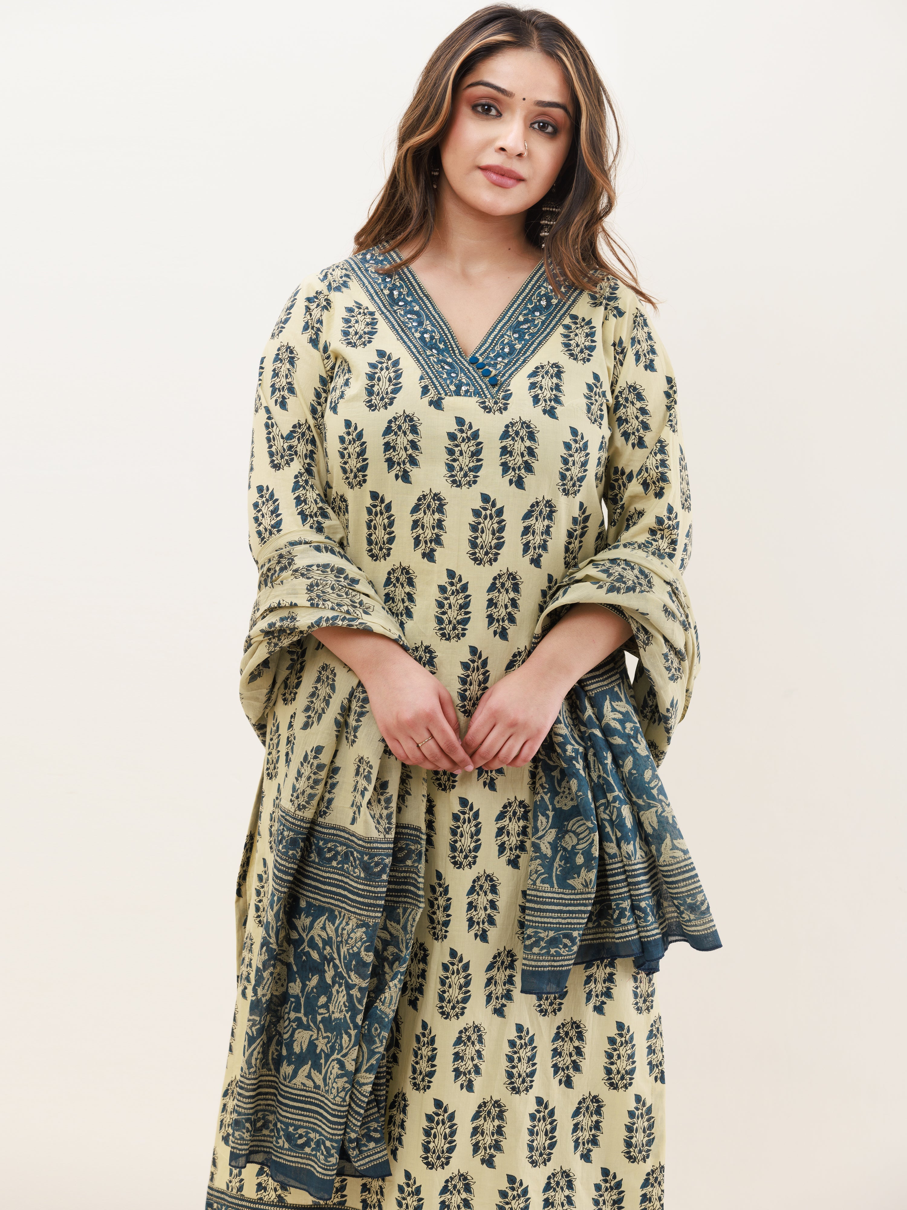 Product: This set contains Handcrafted Sanganeri Premium Cotton Kurta, 100% Cotton Pants and Cotton Mul Mul Dupatta.