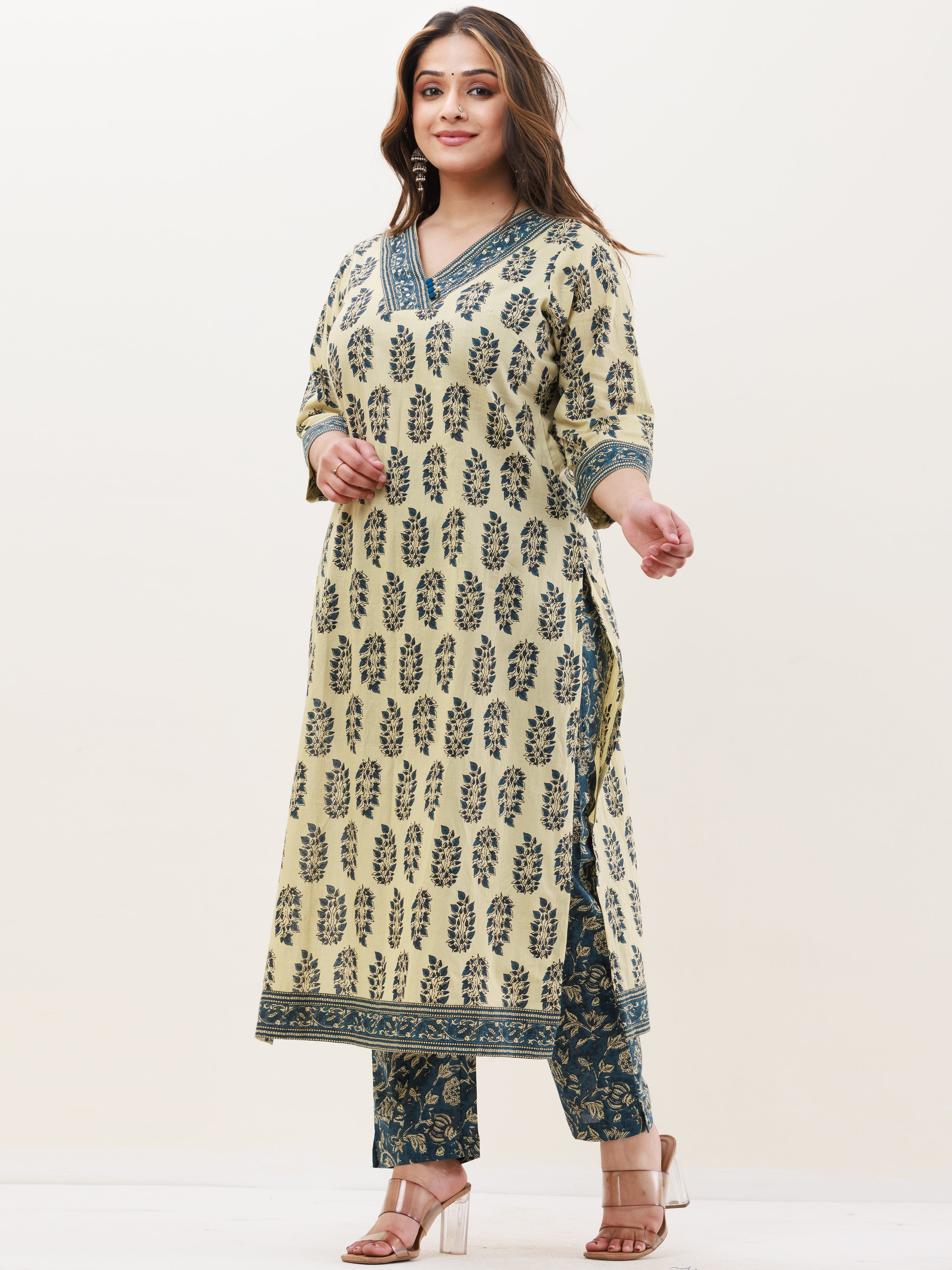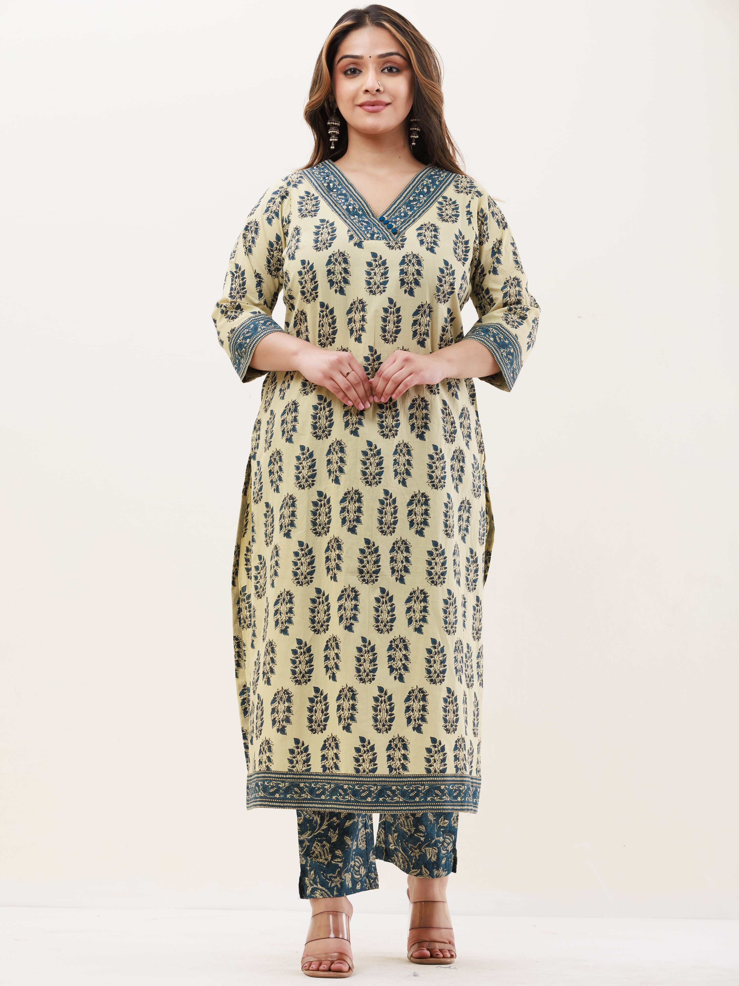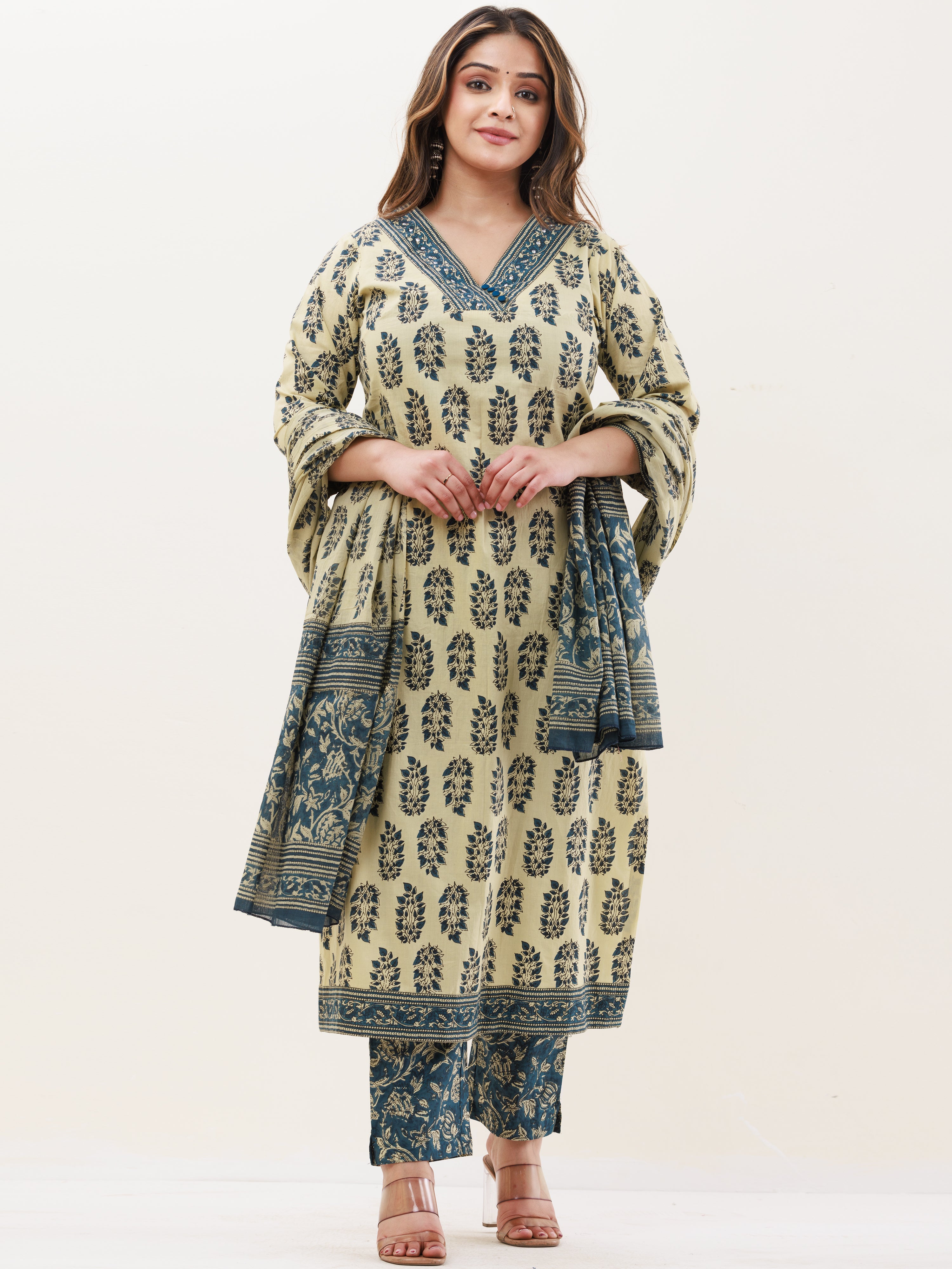 Product: This set contains Handcrafted Sanganeri Premium Cotton Kurta, 100% Cotton Pants and Cotton Mul Mul Dupatta.