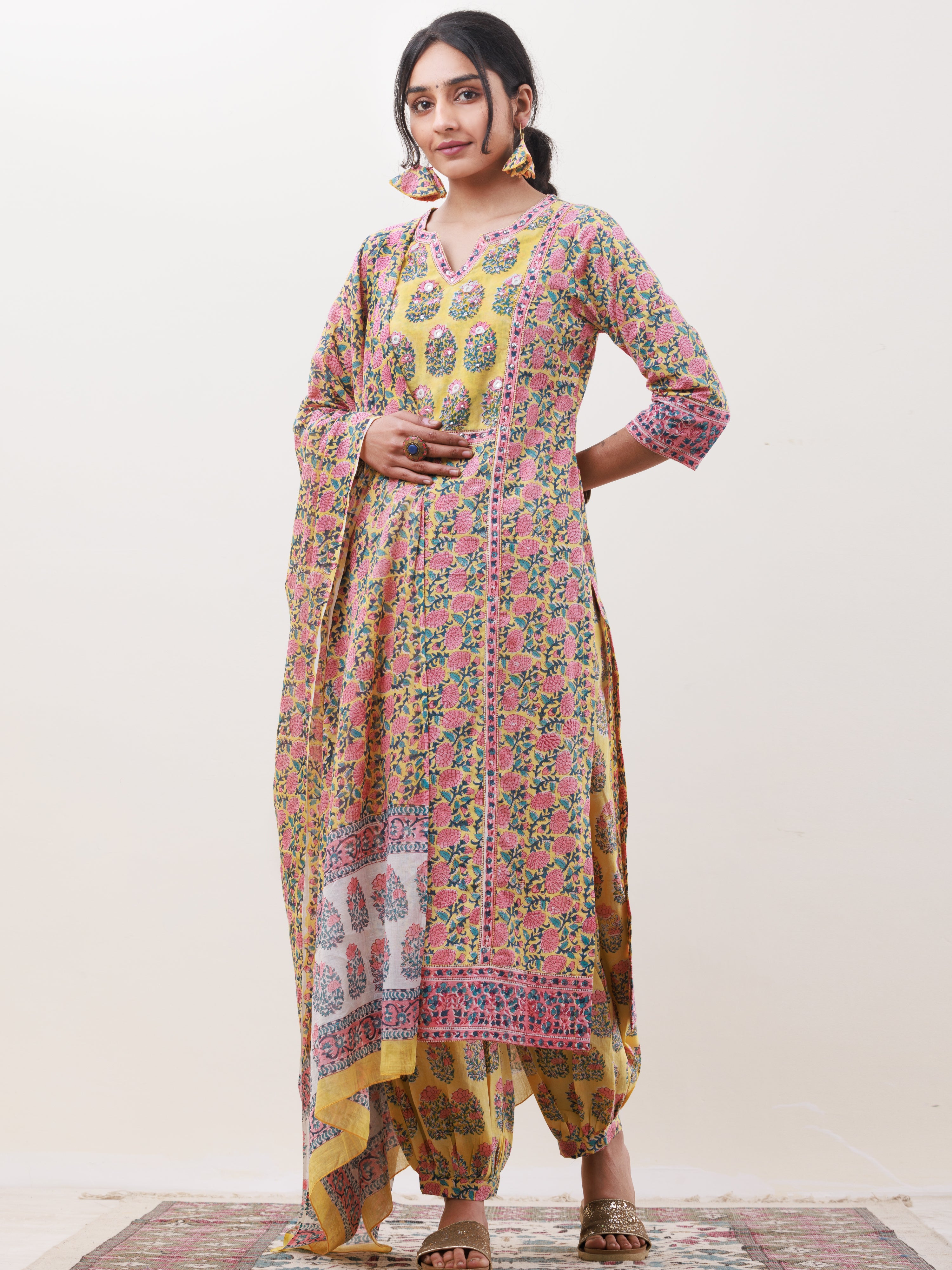 Product: This set contains Handcrafted Sanganeri Premium Cotton Kurta, 100% Cotton Pants and Cotton Mul Mul Dupatta.