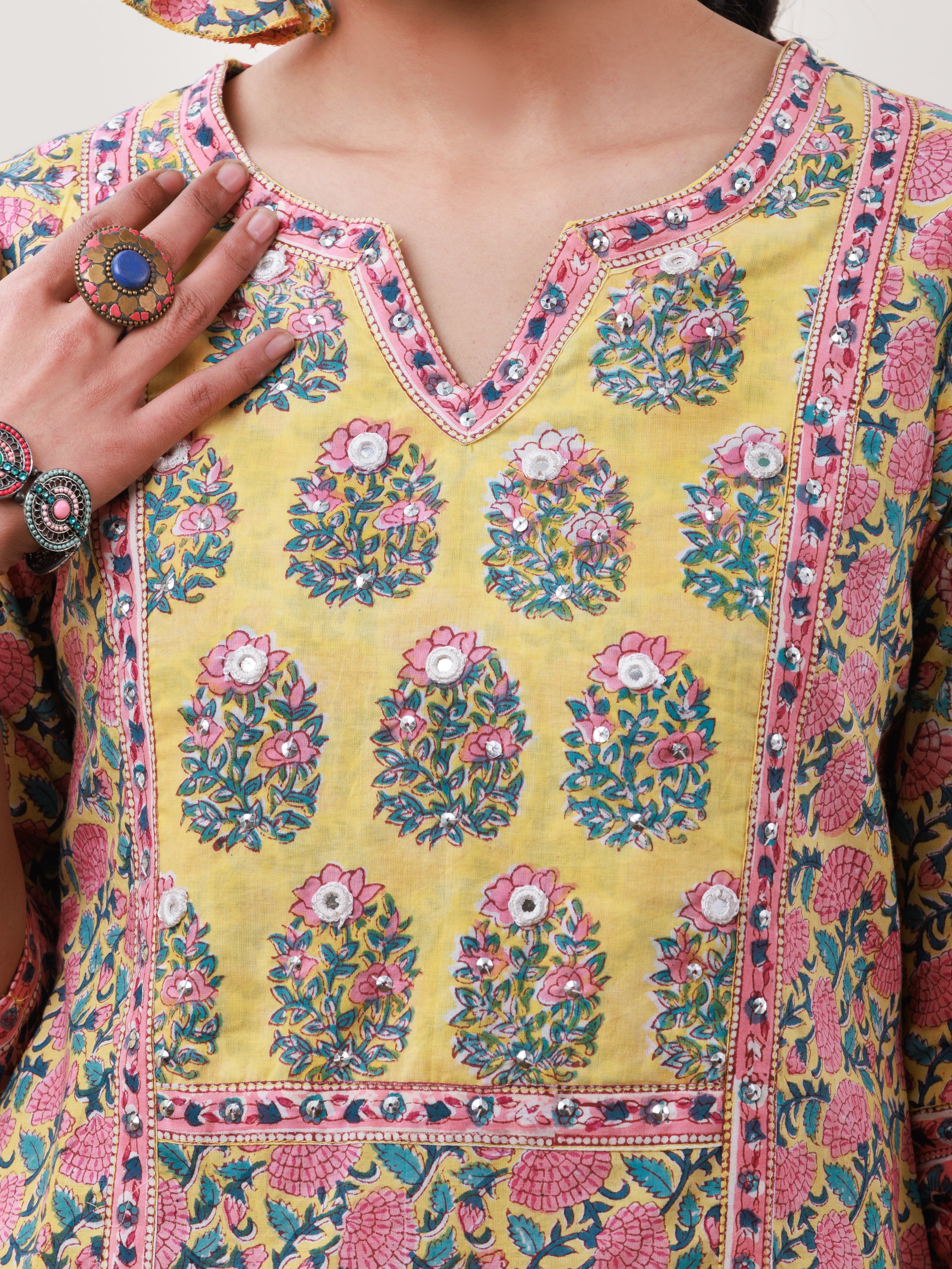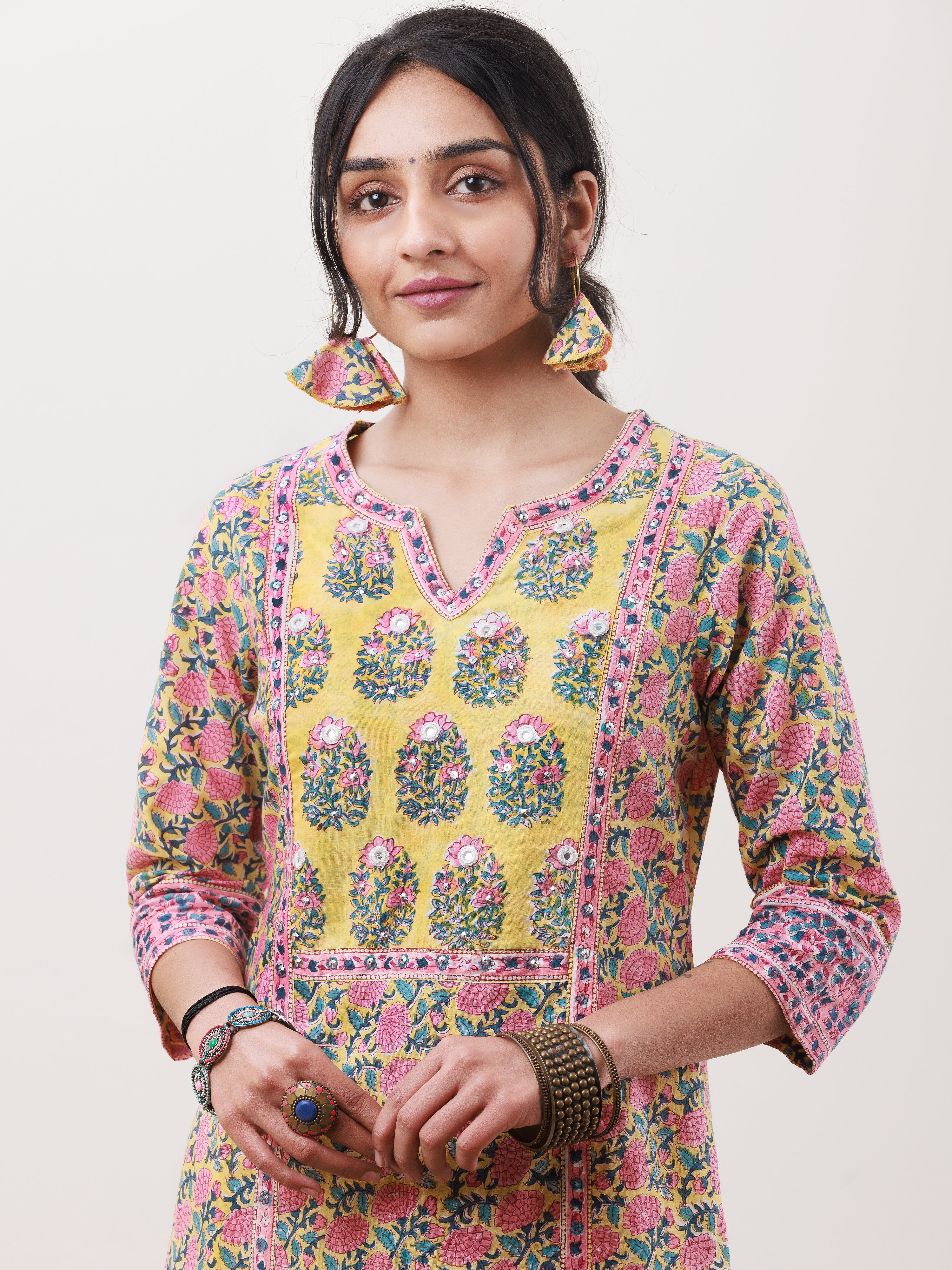 Product: Contains Hand Block Printed Cotton Kurta. Matching Pants/Bottoms and Dupatta are also available separately under BUY THE LOOK section.